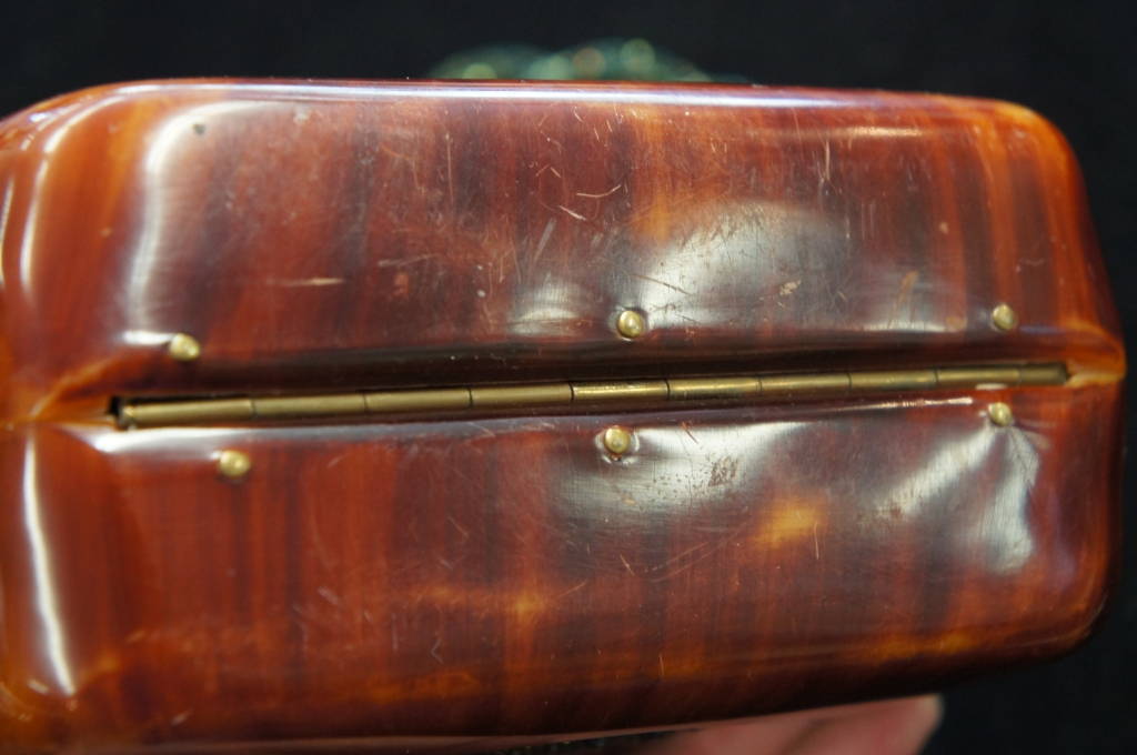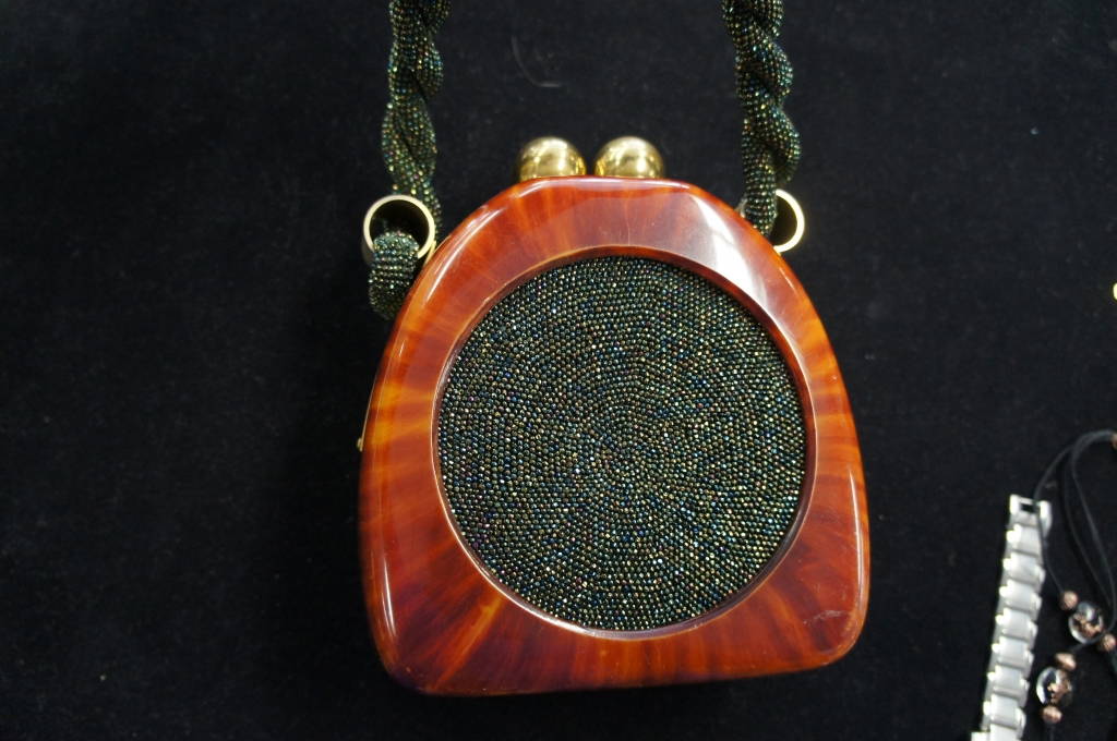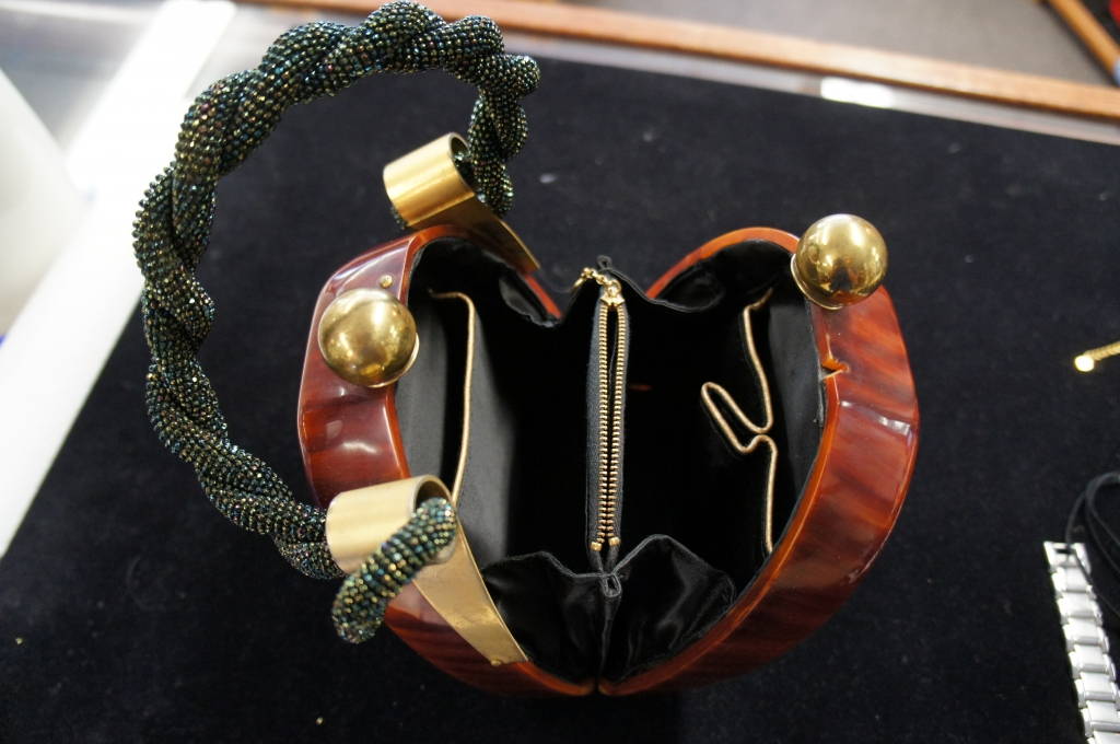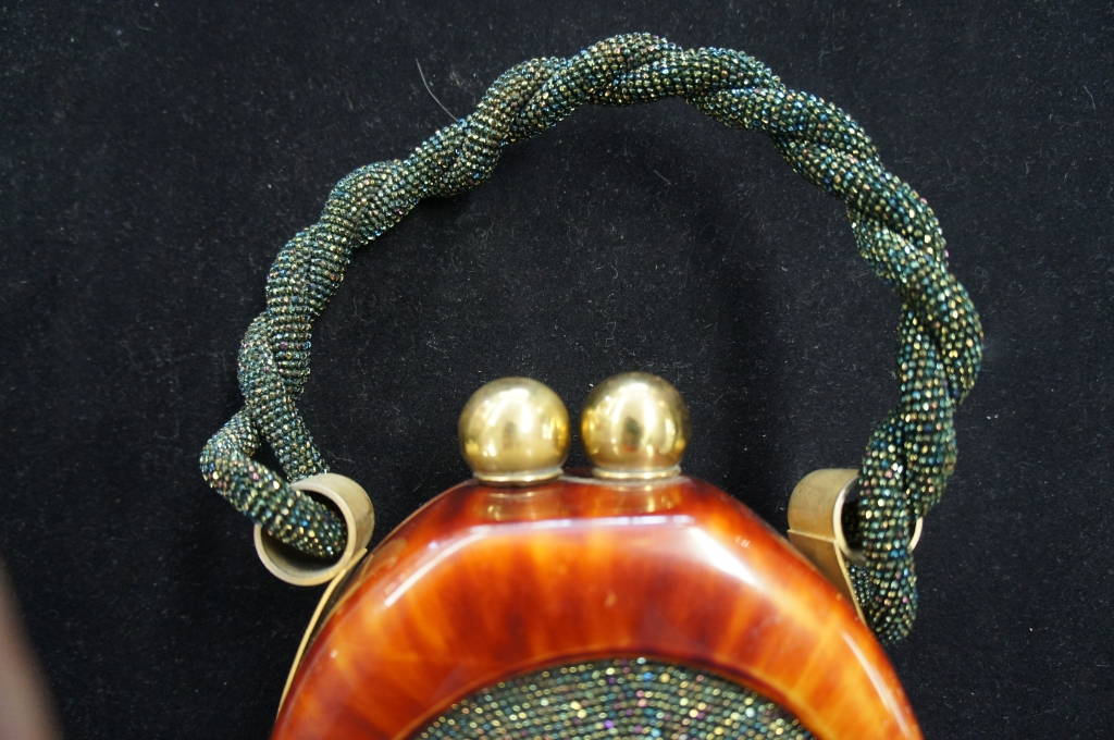 This purse is hand beaded with brass hardware and what appears to be aBakelitecasing. It is in very good condition for its age, having some scuffing to bottom from use and light wear to some of the beads that surround the handle loops (see pictures).