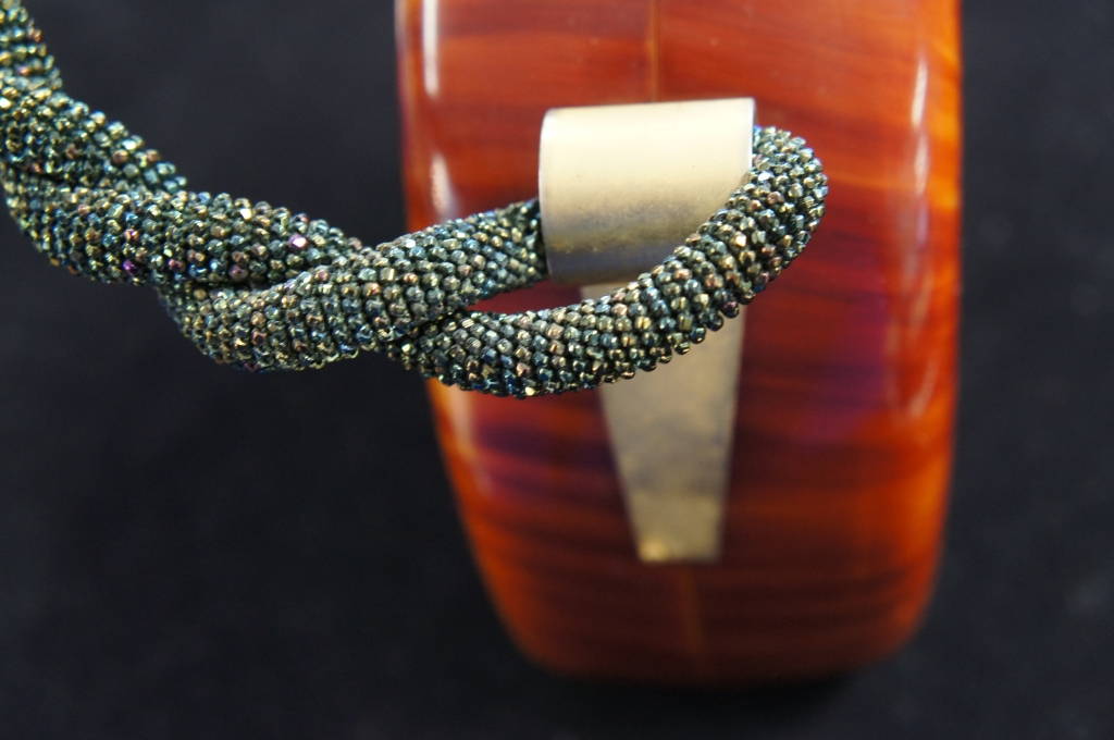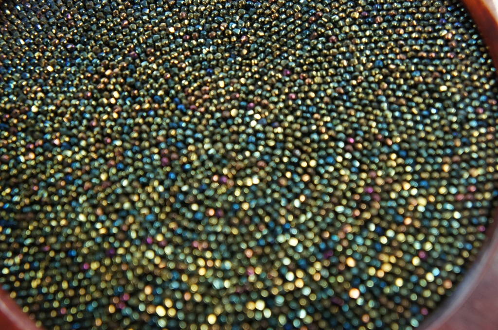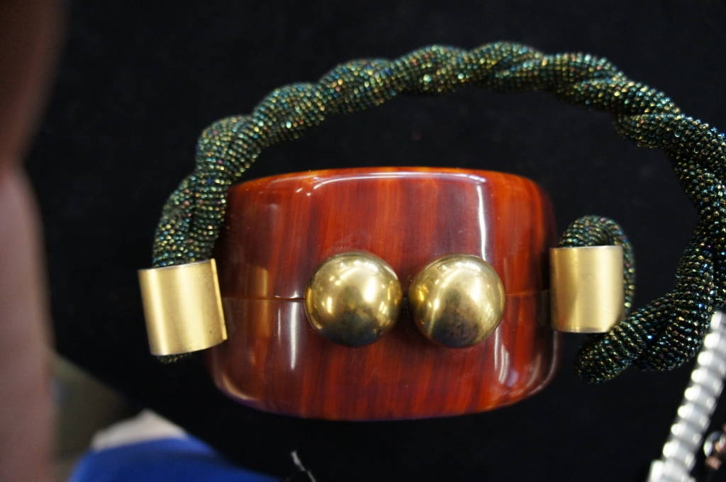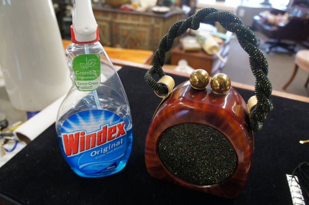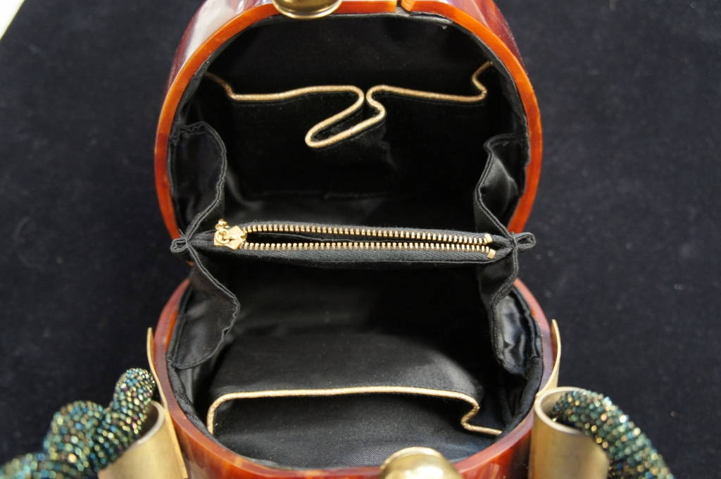 This purse is hand beaded with brass hardware and what appears to be aBakelitecasing. It is in very good condition for its age, having some scuffing to bottom from use and light wear to some of the beads that surround the handle loops (see pictures).