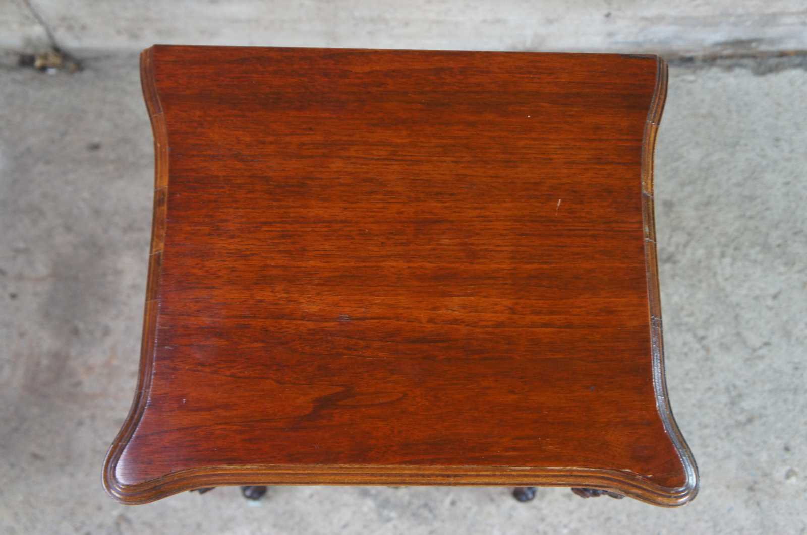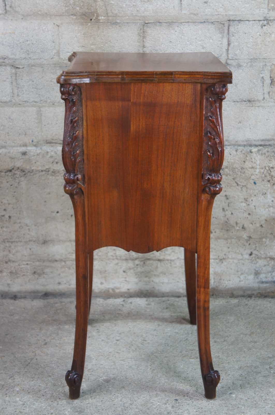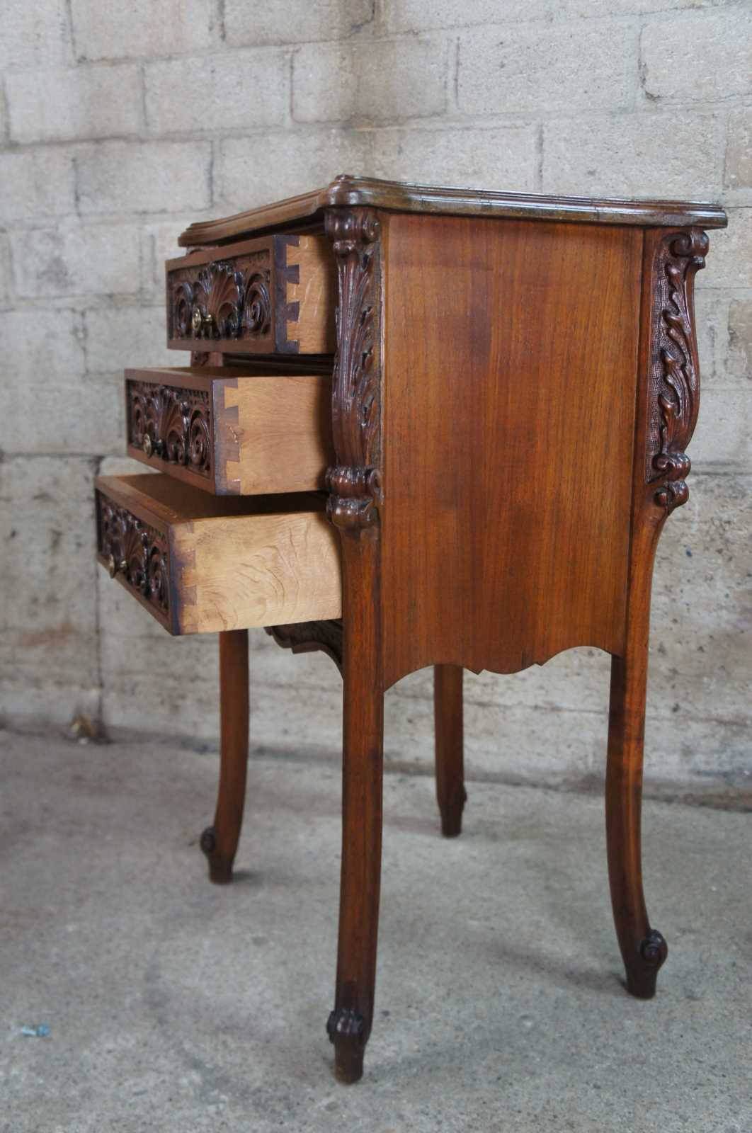 Antique French nightstand or side table. Made of walnut featuring three drawers with shell and cartouche carvings between thick acanthus accents, and cabriole legs leading to scrolled feet.