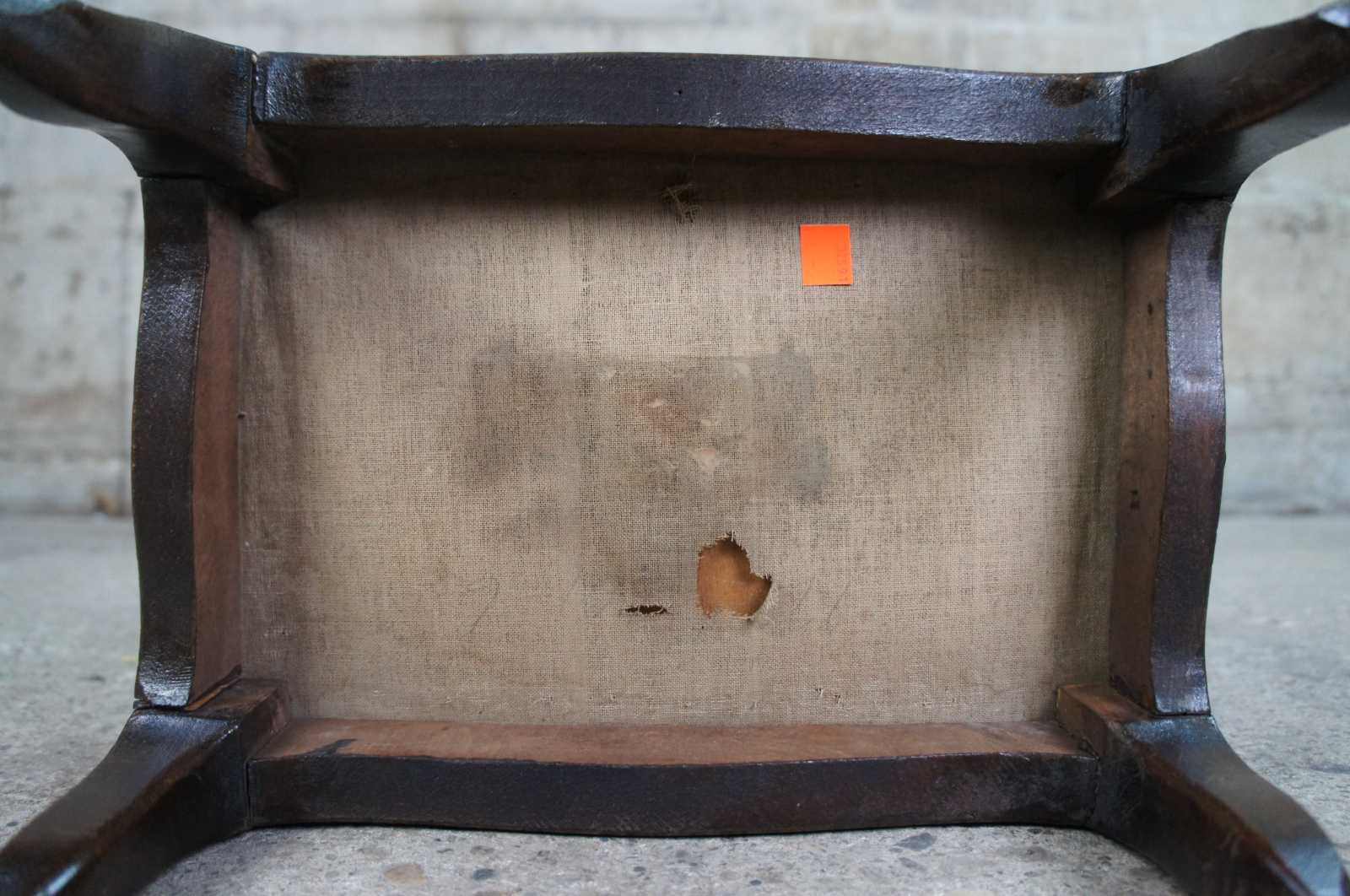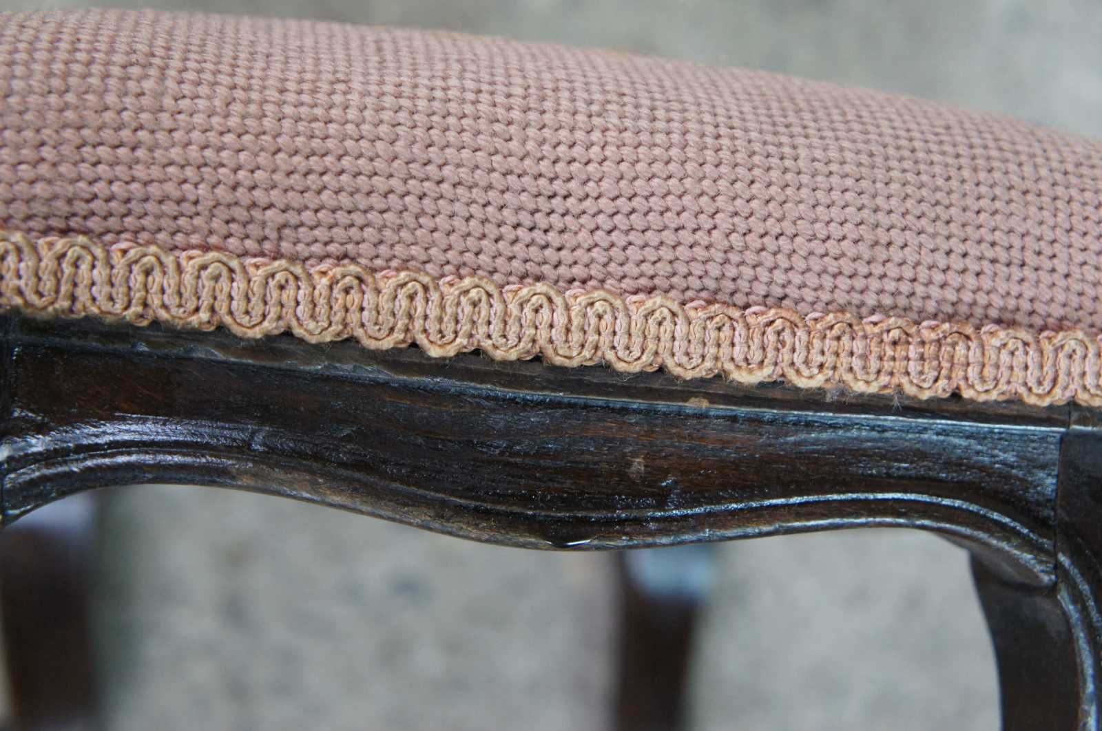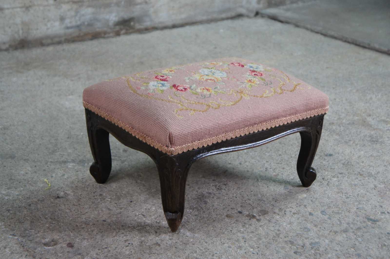 Antique French needlepoint footrest, stool or ottoman. Made of mahogany featuring cabriole legs with a pink floral needlepoint fabric.
