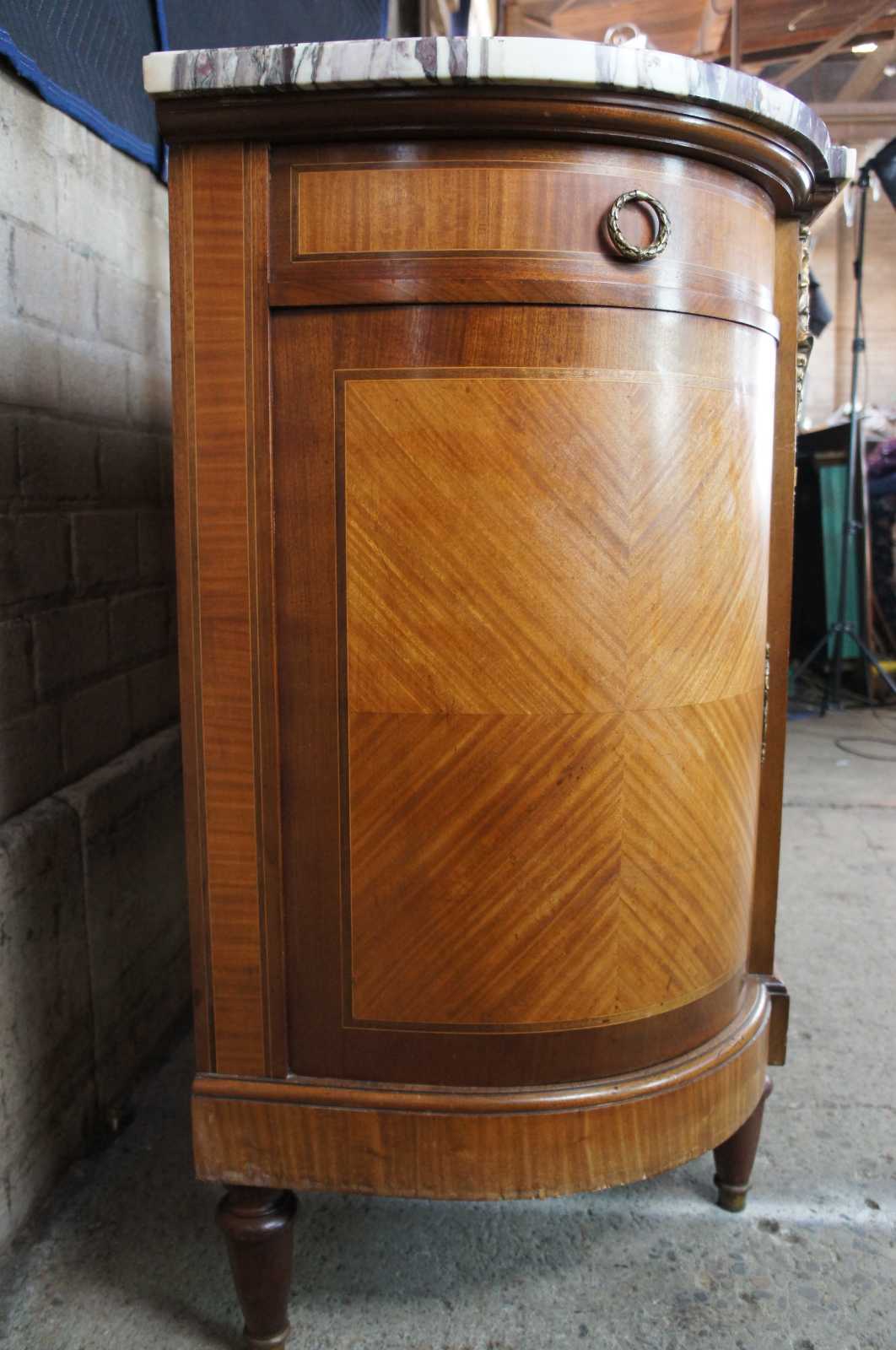 Antique French Louis XVI buffet featuring Neoclassical styling, circa 1870s. A crescent or D-form made from mahogany with a breakfront. Features ormolu mounts, a matchbook parquetry design, inlaid marquetry of grapes and leaves, banding and a marble top. Includes four upper drawers and three lower cabinets with a shelf. The buffet is supported by turned arrow feet with brass caps.