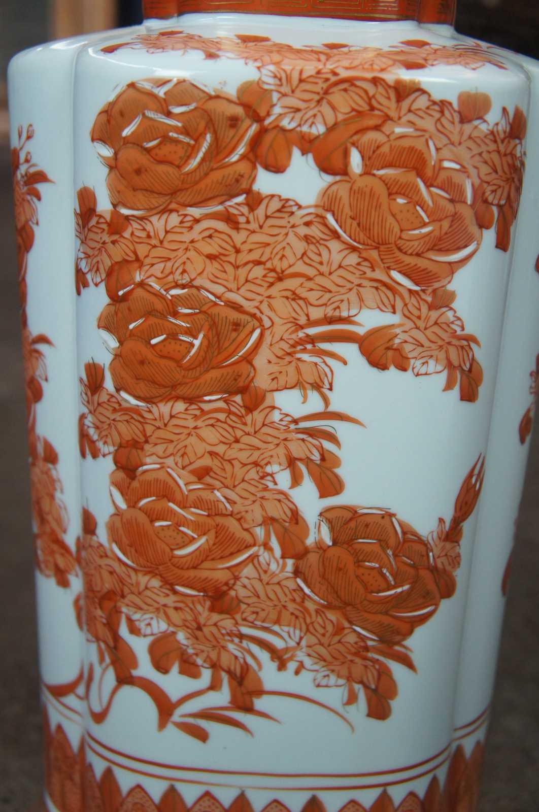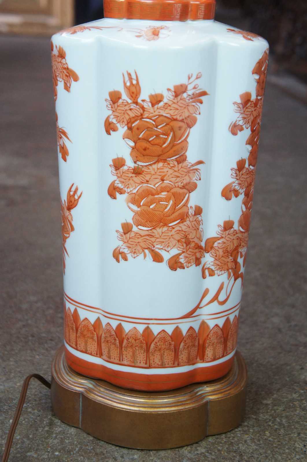 Mid Century Chinese mantel urn lamp. Made of porcelain featuring scalloped form with a coral colored field of roses and barrel shade.