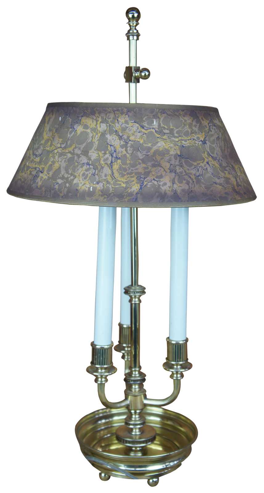 Mid century French Bouillotte table lamp. Made of brass featuring round footed circular tray base, three candlesticks lights and round marbled shade.