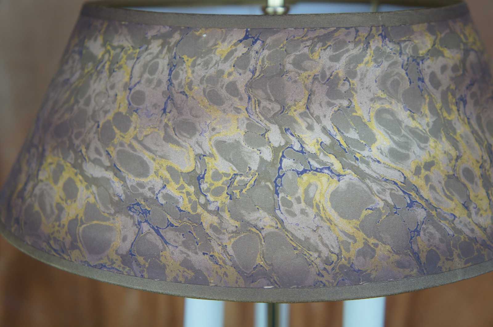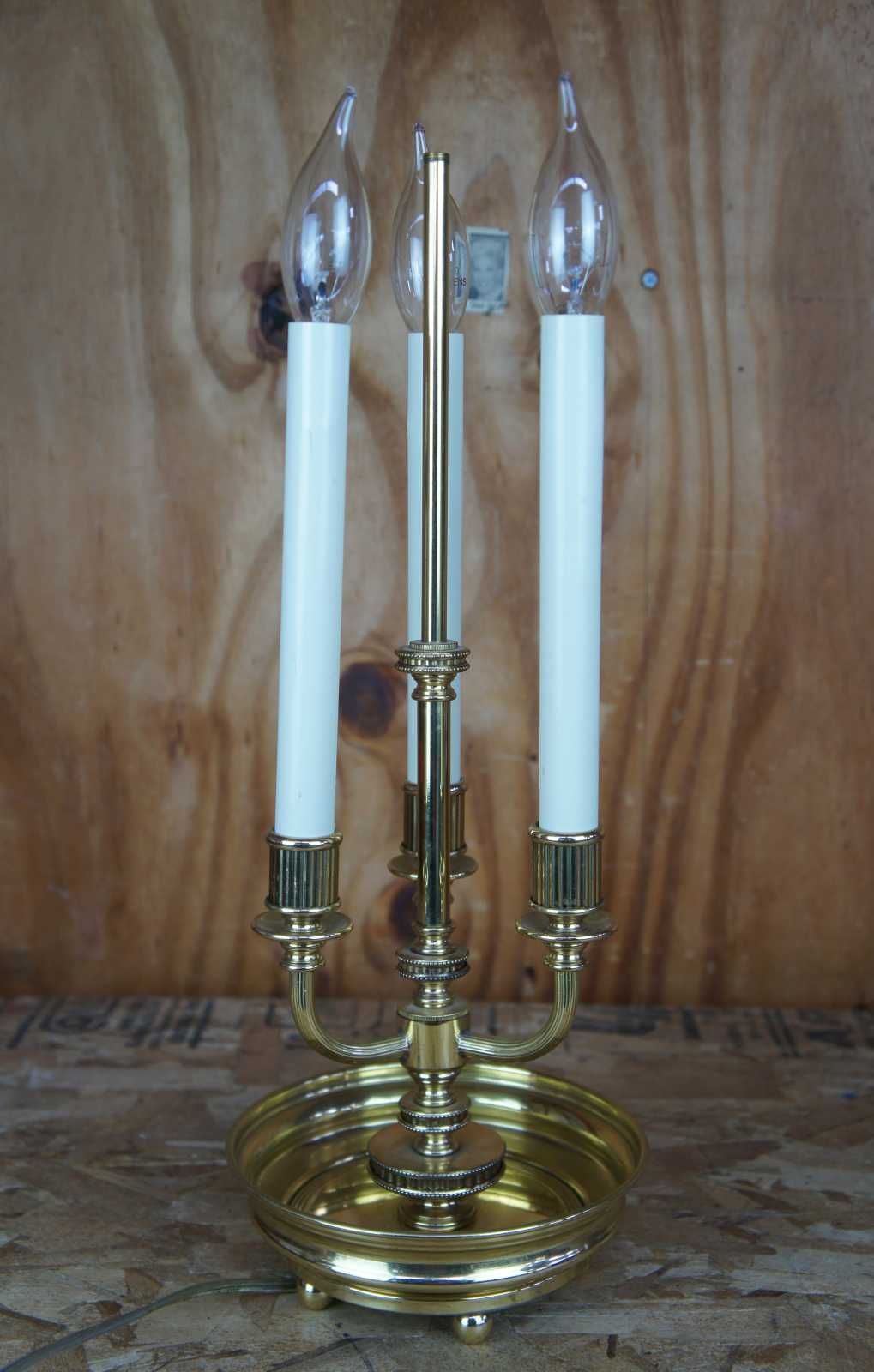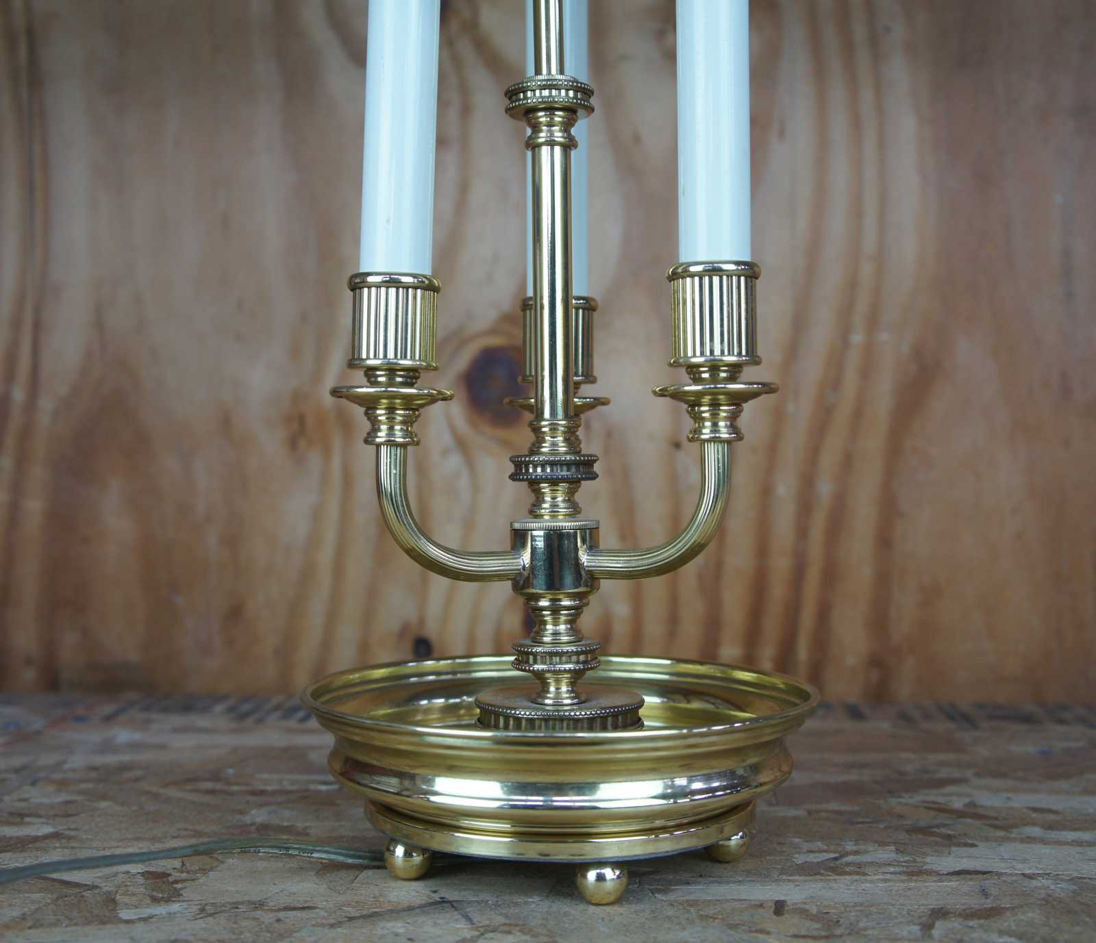 Good vintage condition, light wear and distressing, split to one candlestick, finish loss to shade.