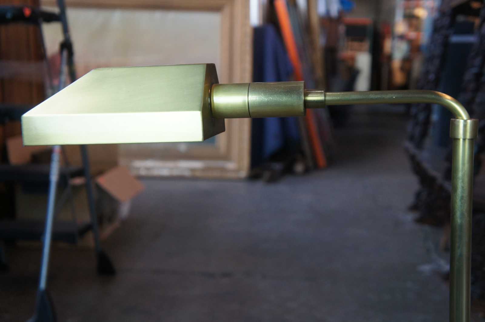 1980 Chapman Mfg Co adjustable floor lamp. Made of brass featuring round base with triangular geometric form shade.