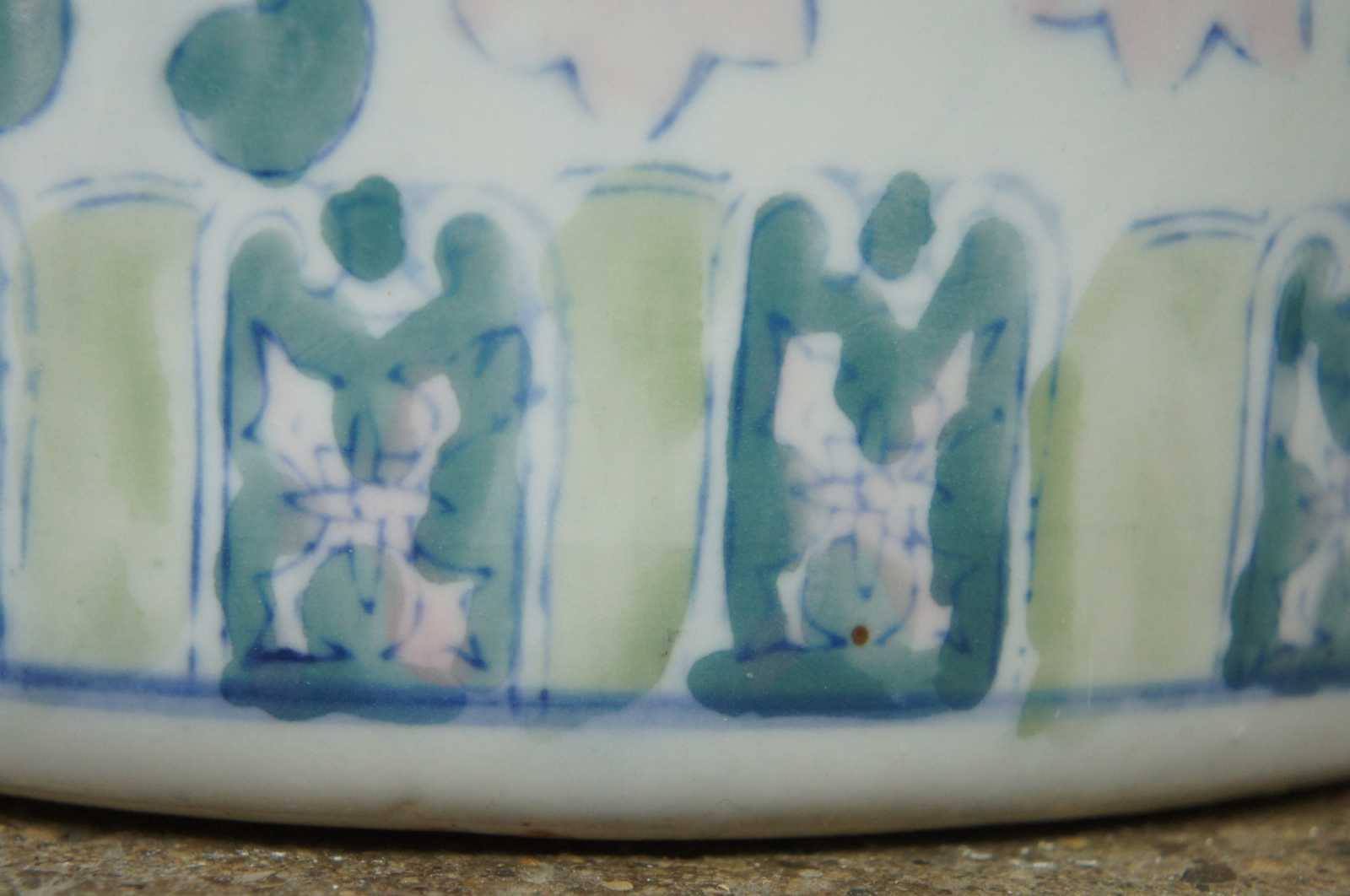 Antique Chinese umbrella stand or cane holder. Made of porcelain featuring hand painted floral and foliate designs in pink, blue, and green, patterned between abstract banding with a Greek key border.