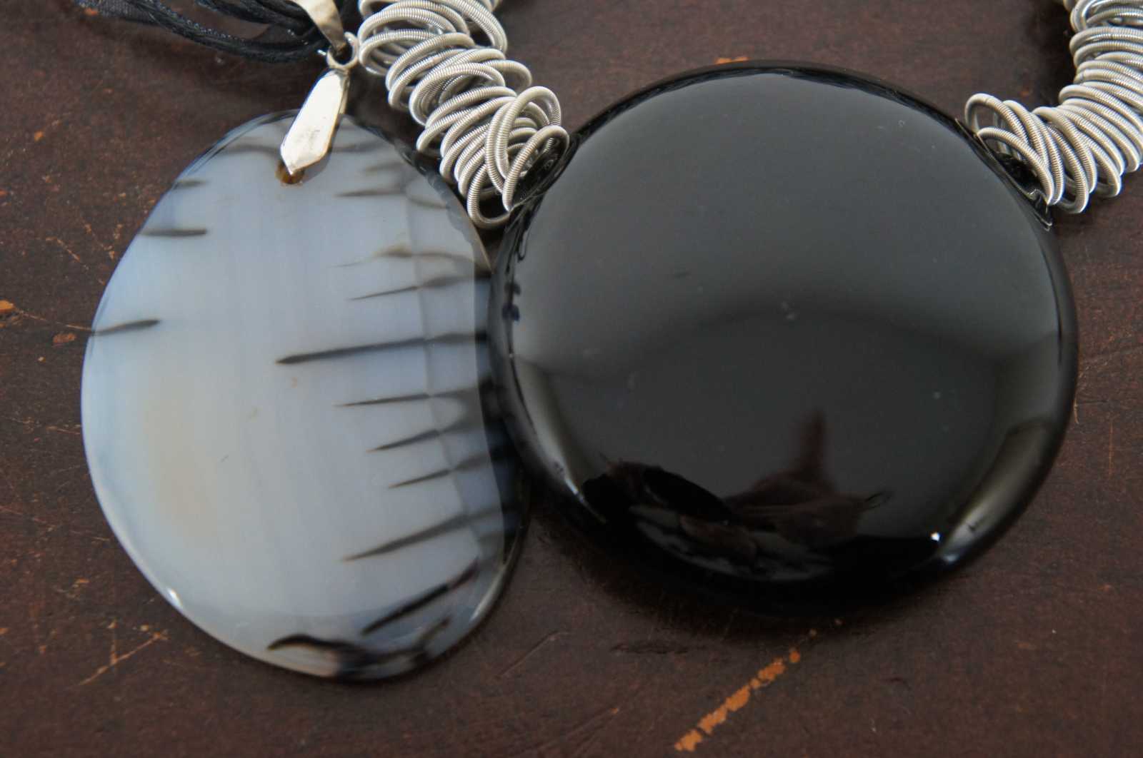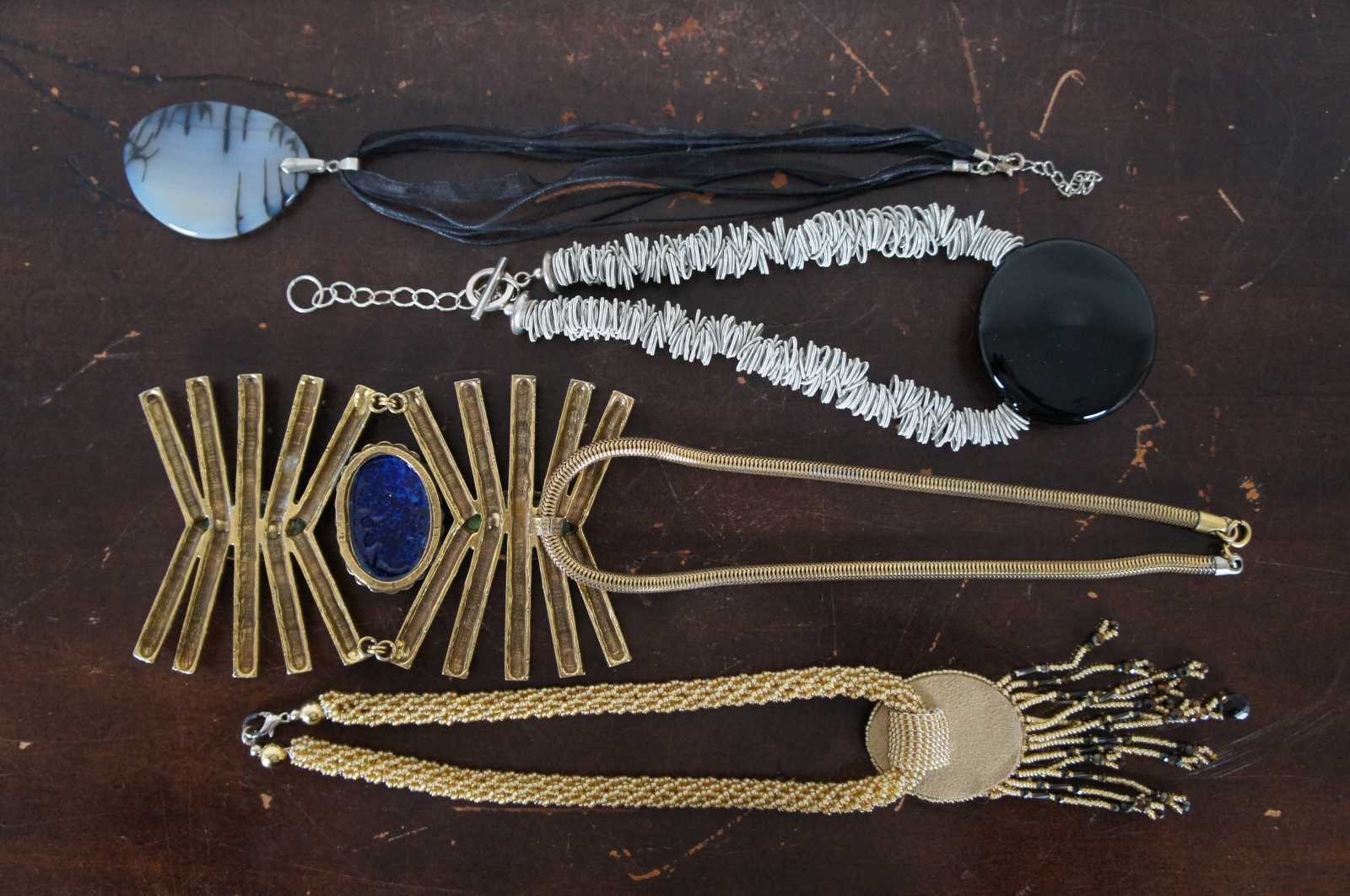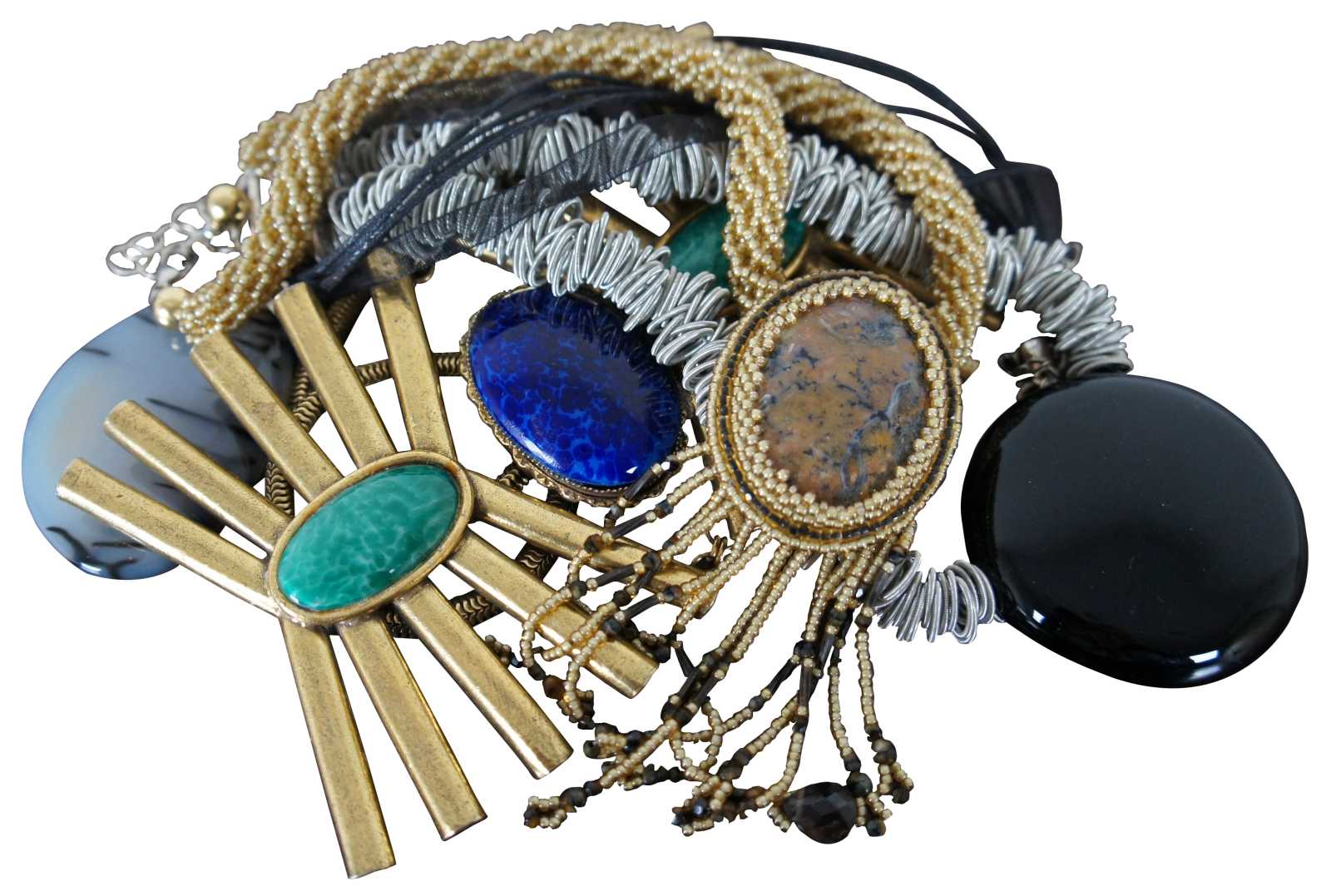 Lot of four vintage pendant necklaces on a variety of chain materials and polished stone, including lapis lazuli, amazonite, obsidian and agate.