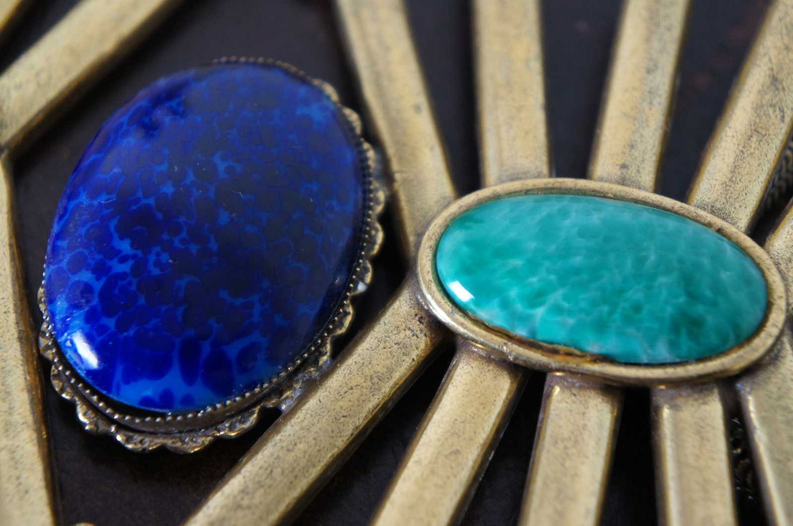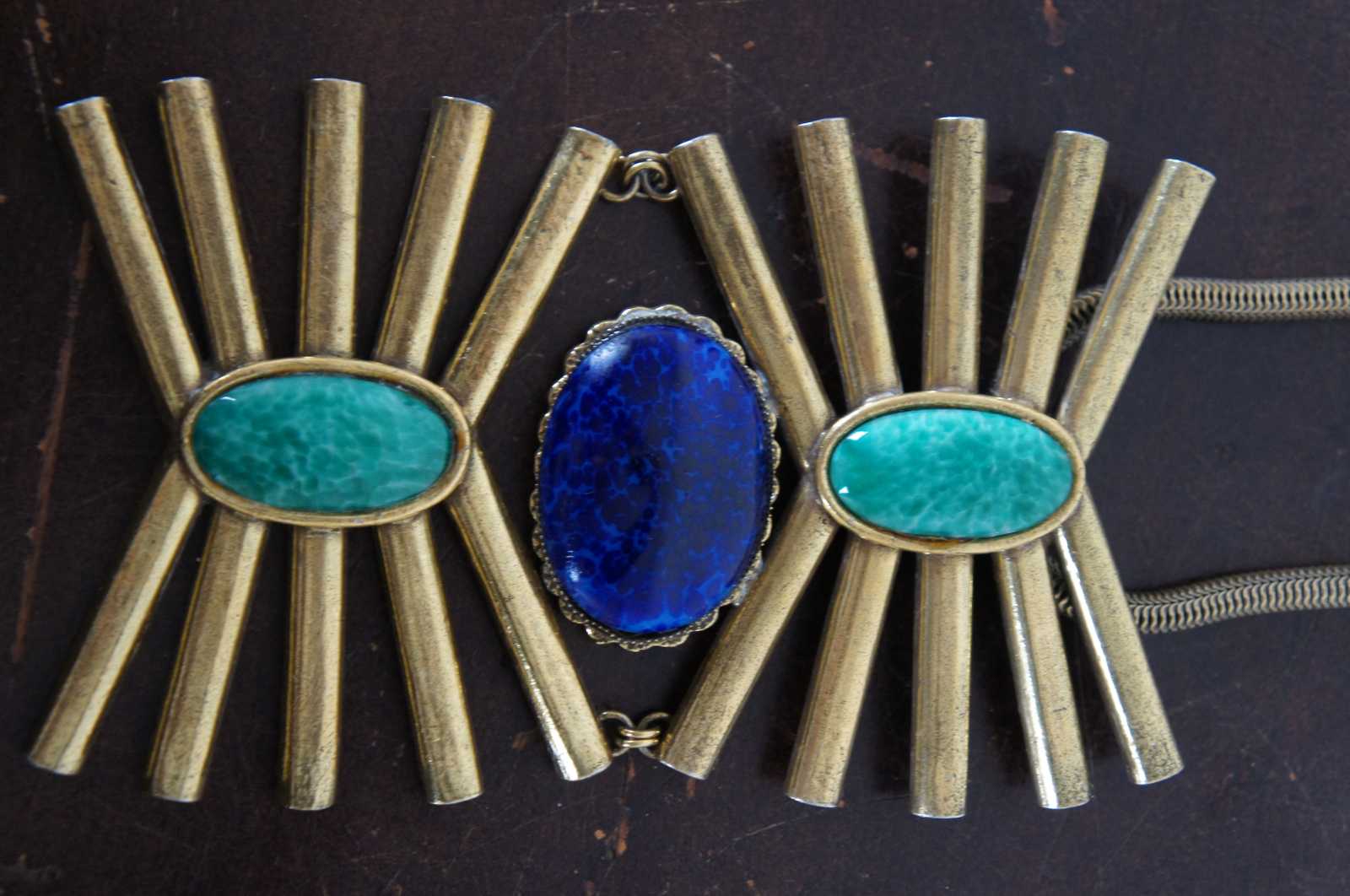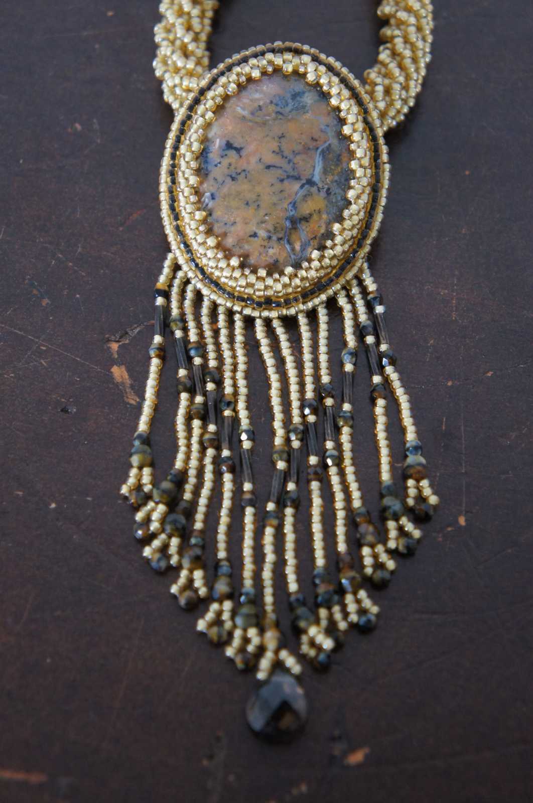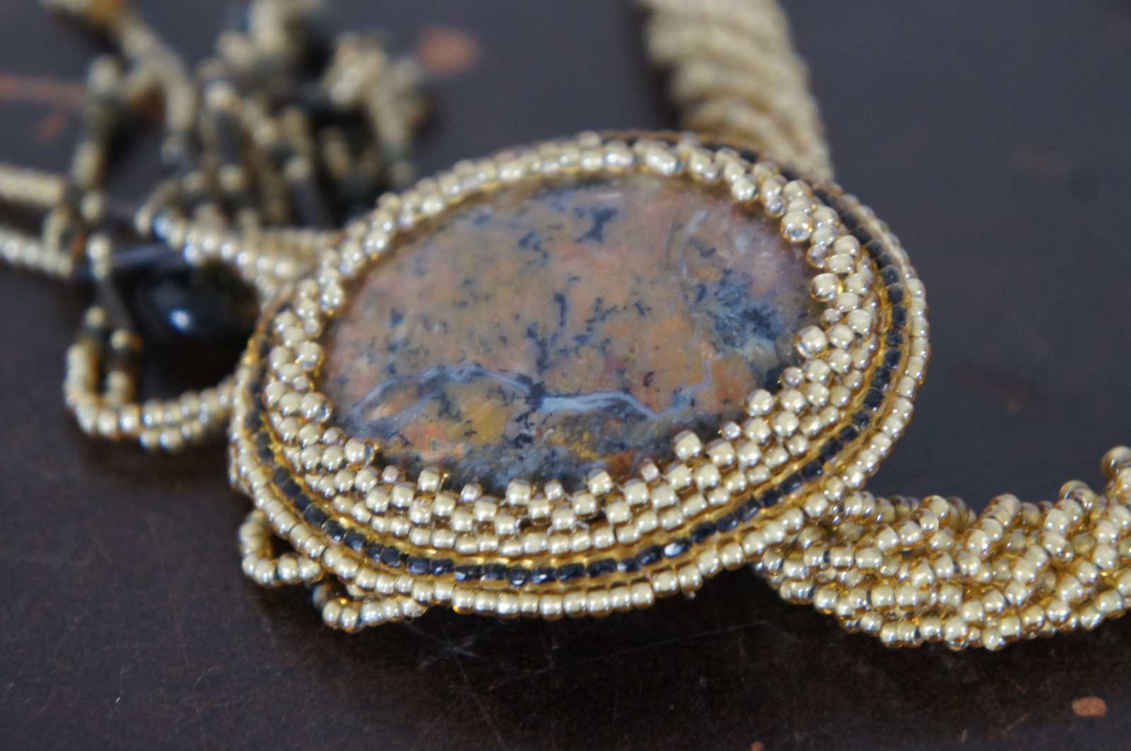 Lot of four vintage pendant necklaces on a variety of chain materials and polished stone, including lapis lazuli, amazonite, obsidian and agate.