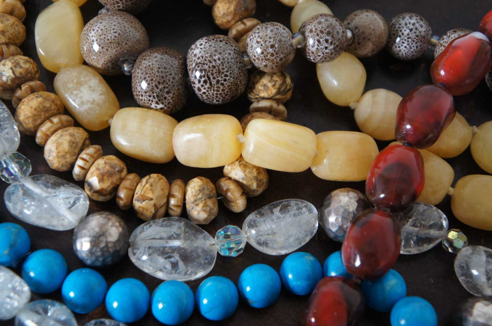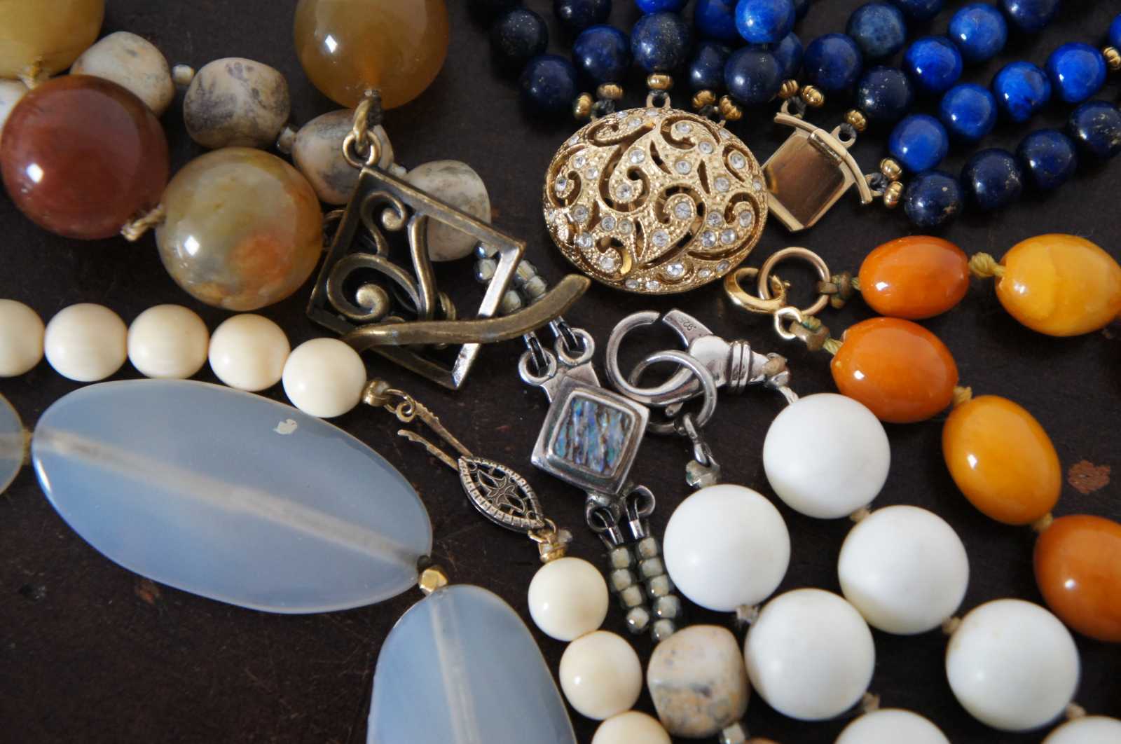 Lot of thirteen vintage necklaces in various colors and lengths, featuring Butterscotch Bakelite, Lapis Lazuli, Turquois, Sterling Silver 925 ect.