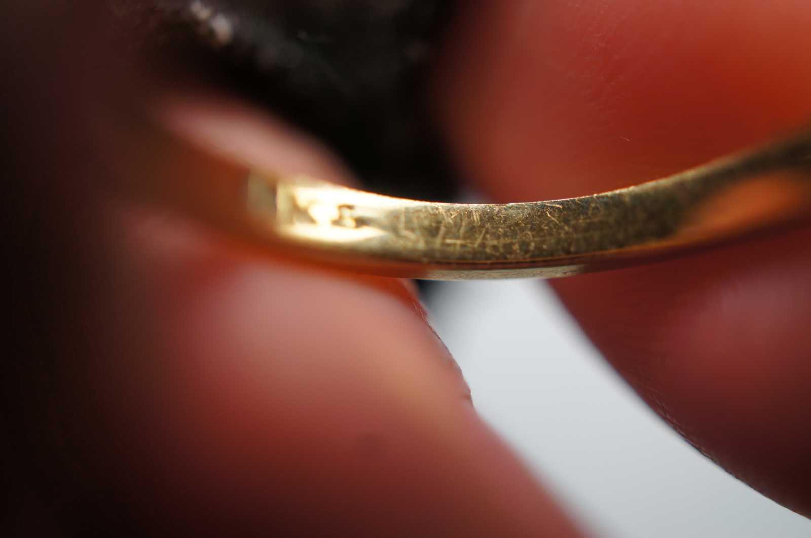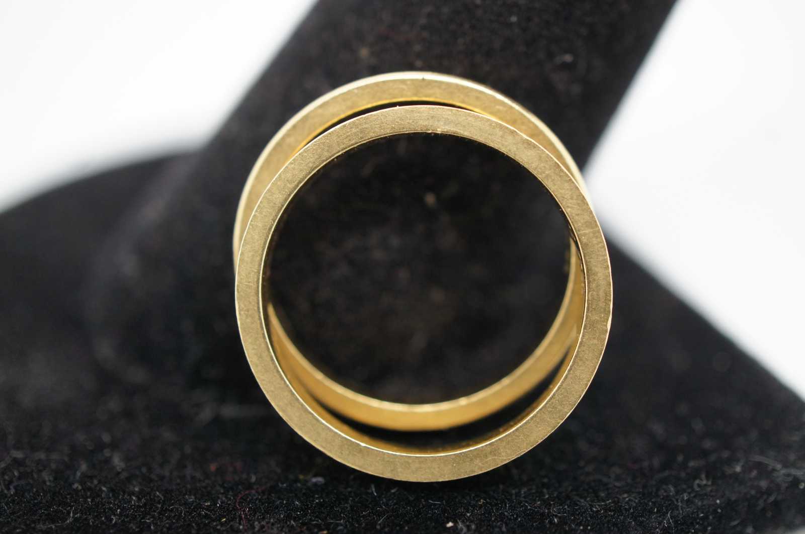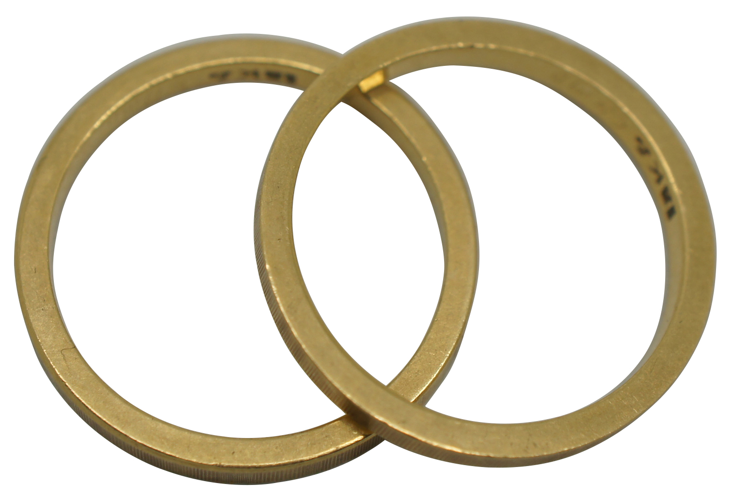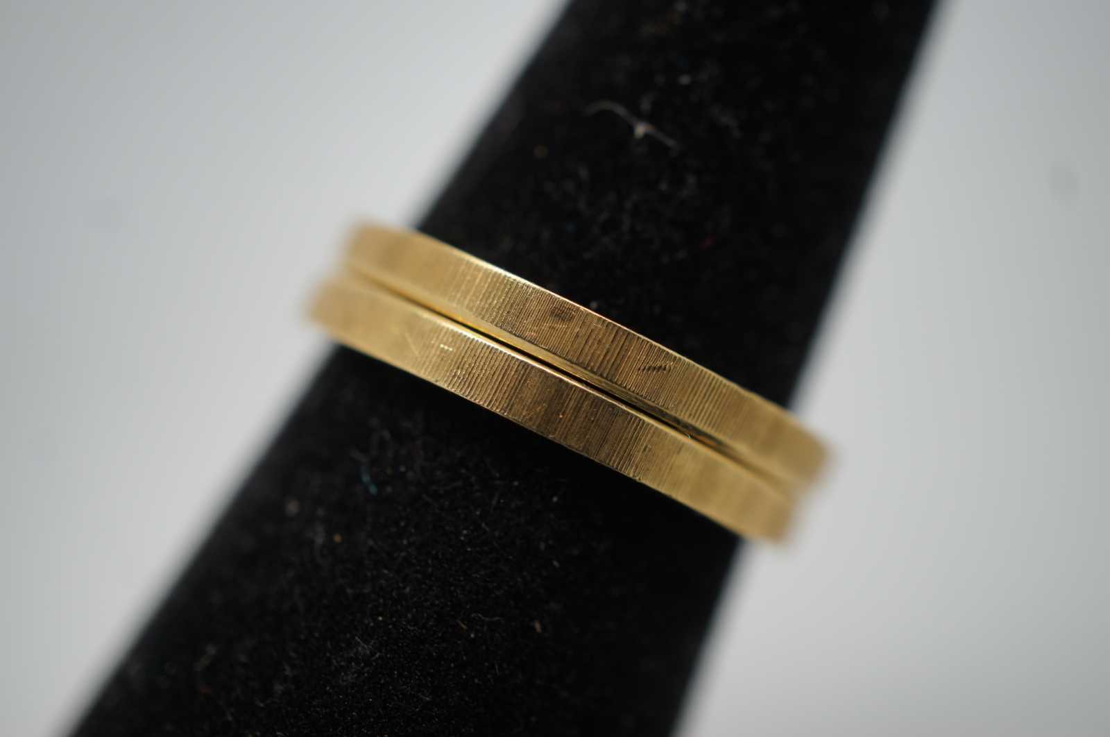 Two vintage 18k yellow gold Art Deco style rings featuring round form with textured design.
