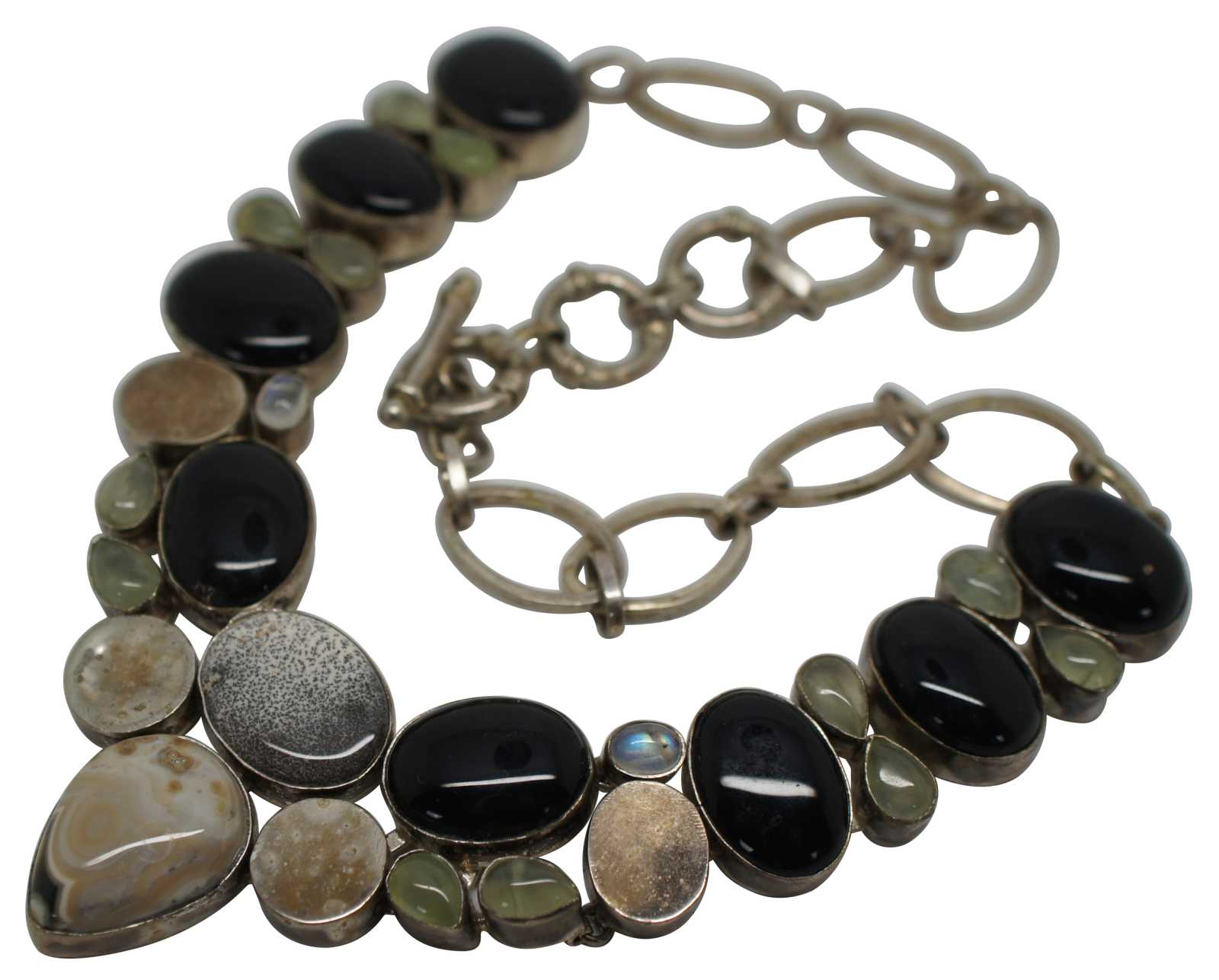 Vintage modernist collar necklace of multi colored gemstones set in sterling silver. Opal, Quarts, Onyx.