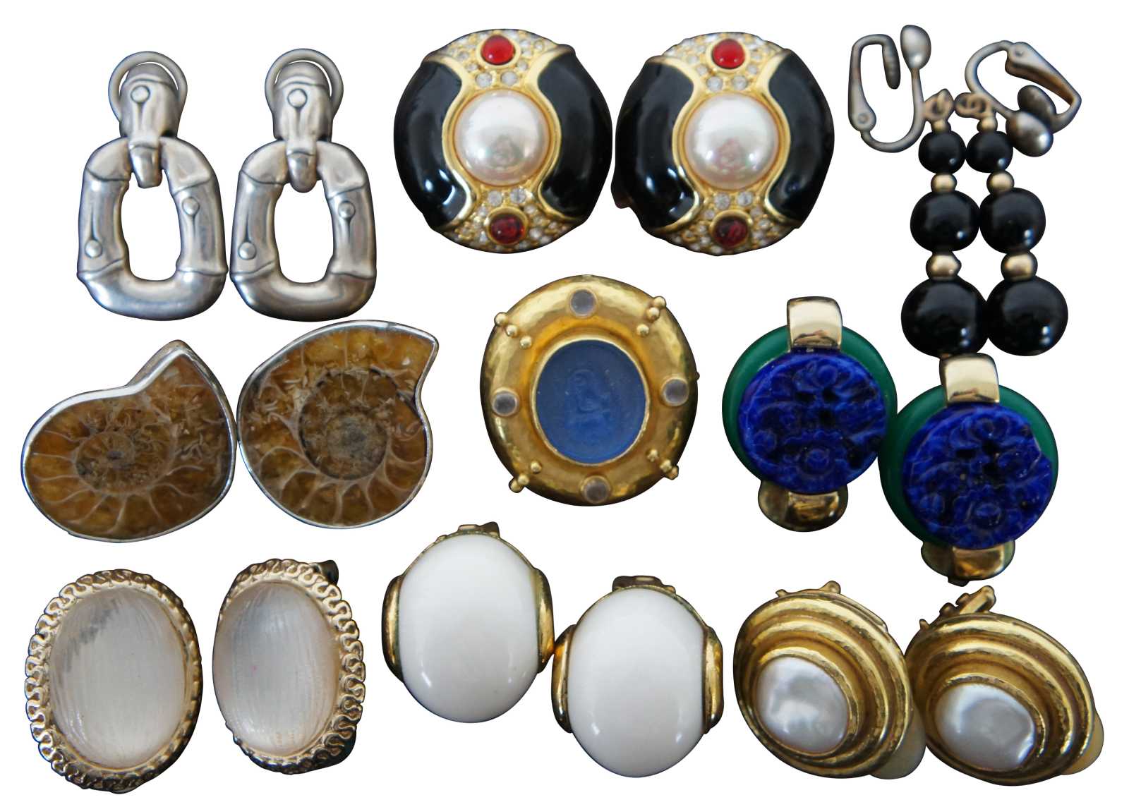 Lot of sixteen assorted pairs of vintage clip on earrings plus two single, unmatched earrings. Features one pair of John Hardy Bamboo collection Doorknocker earrings in sterling silver and one singular 18k Gold with Omega clasp.