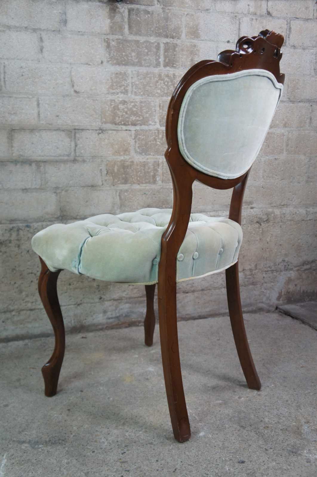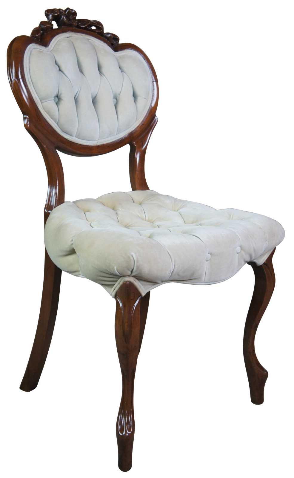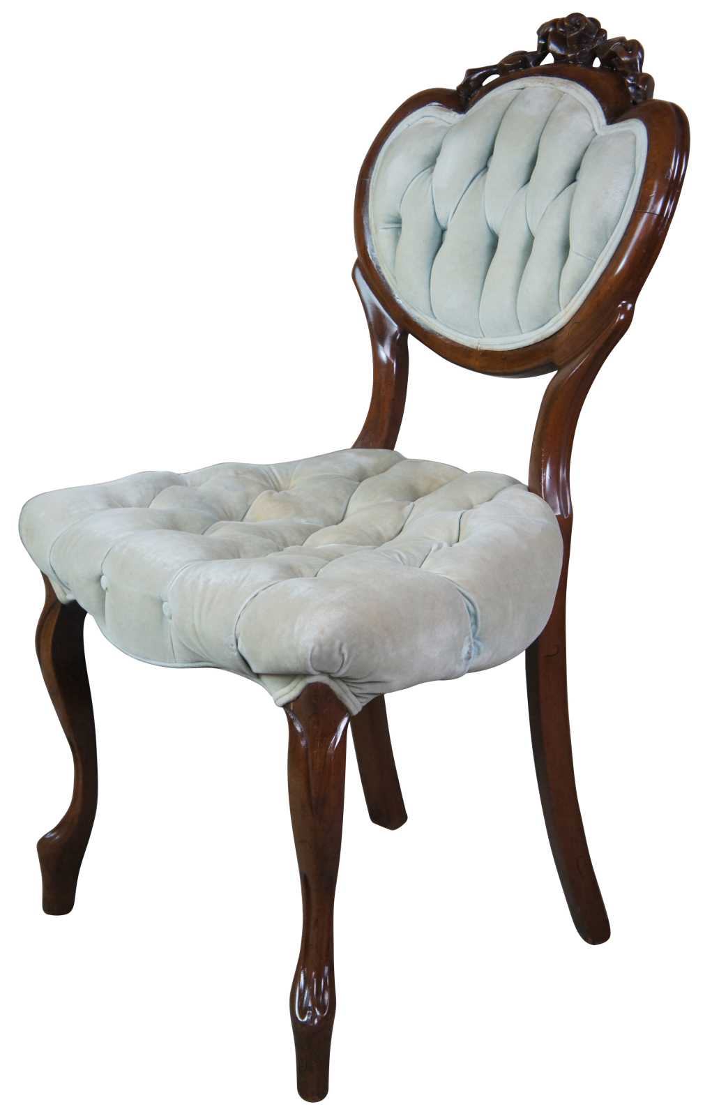 Antique Victorian balloon back side parlor chair. Made of mahogany featuring scrolled form with carved rose and leaf crown accent and tufted velvet upholstery.
