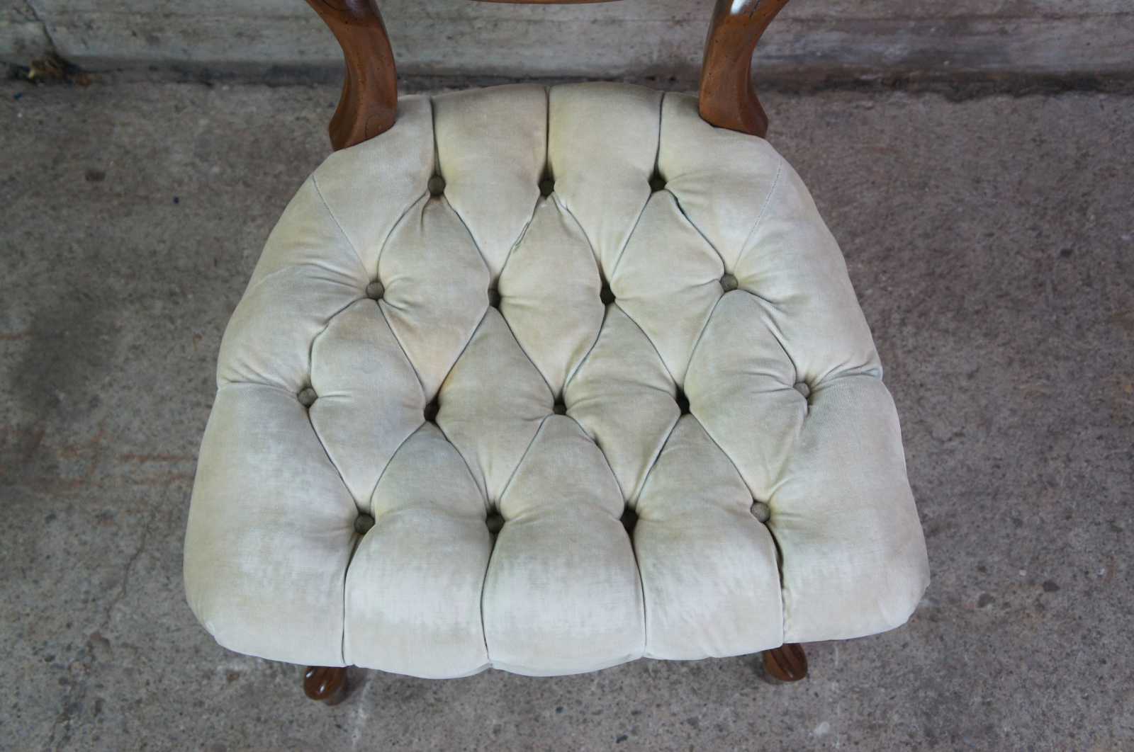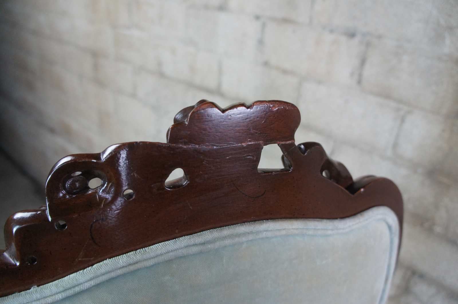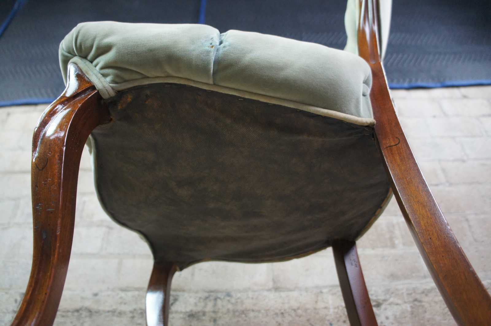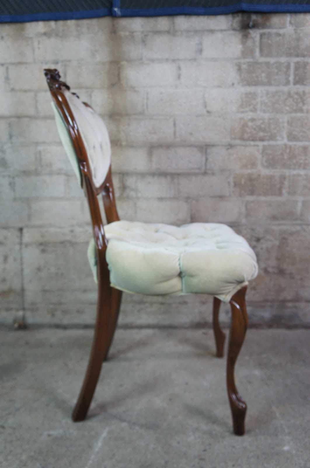 Antique Victorian balloon back side parlor chair. Made of mahogany featuring scrolled form with carved rose and leaf crown accent and tufted velvet upholstery.
