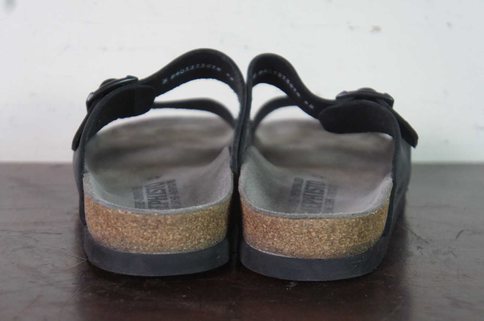Vintage Mephisto Nerio black Scratch 3400 Birkenstock style slide sandals with two buckles and cork sole.
