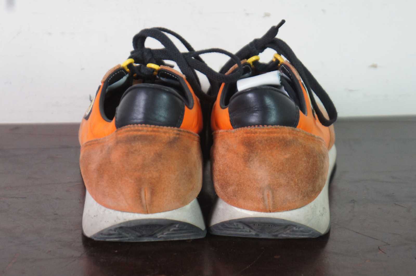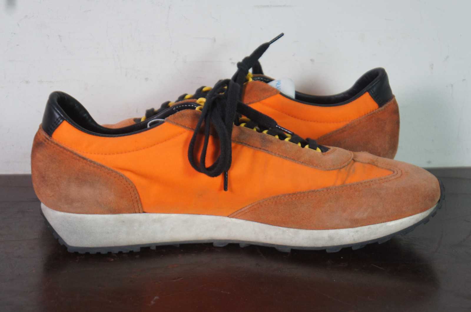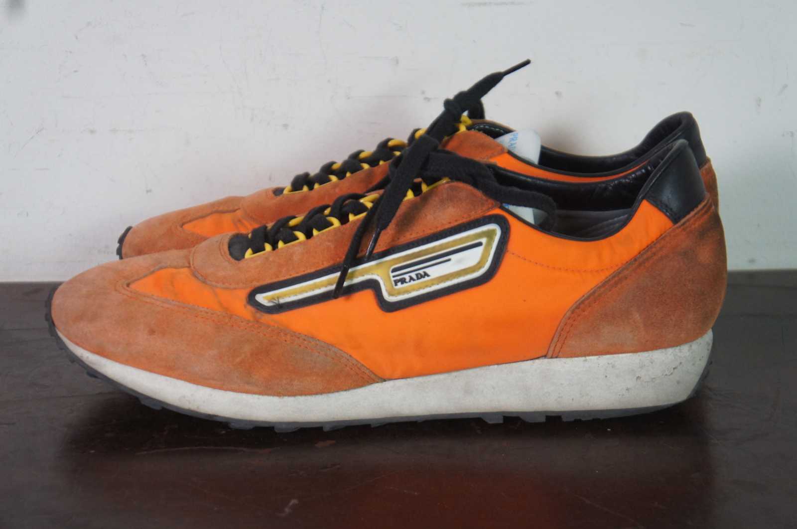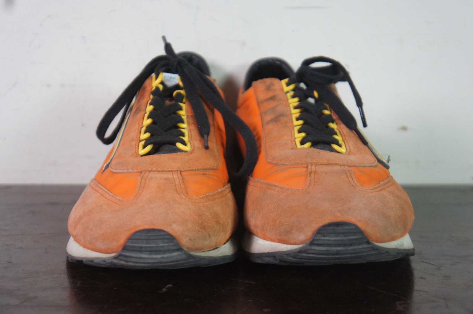 Vintage Prada 2EG276 suede and nylon mens sneakers in Aragosta orange.