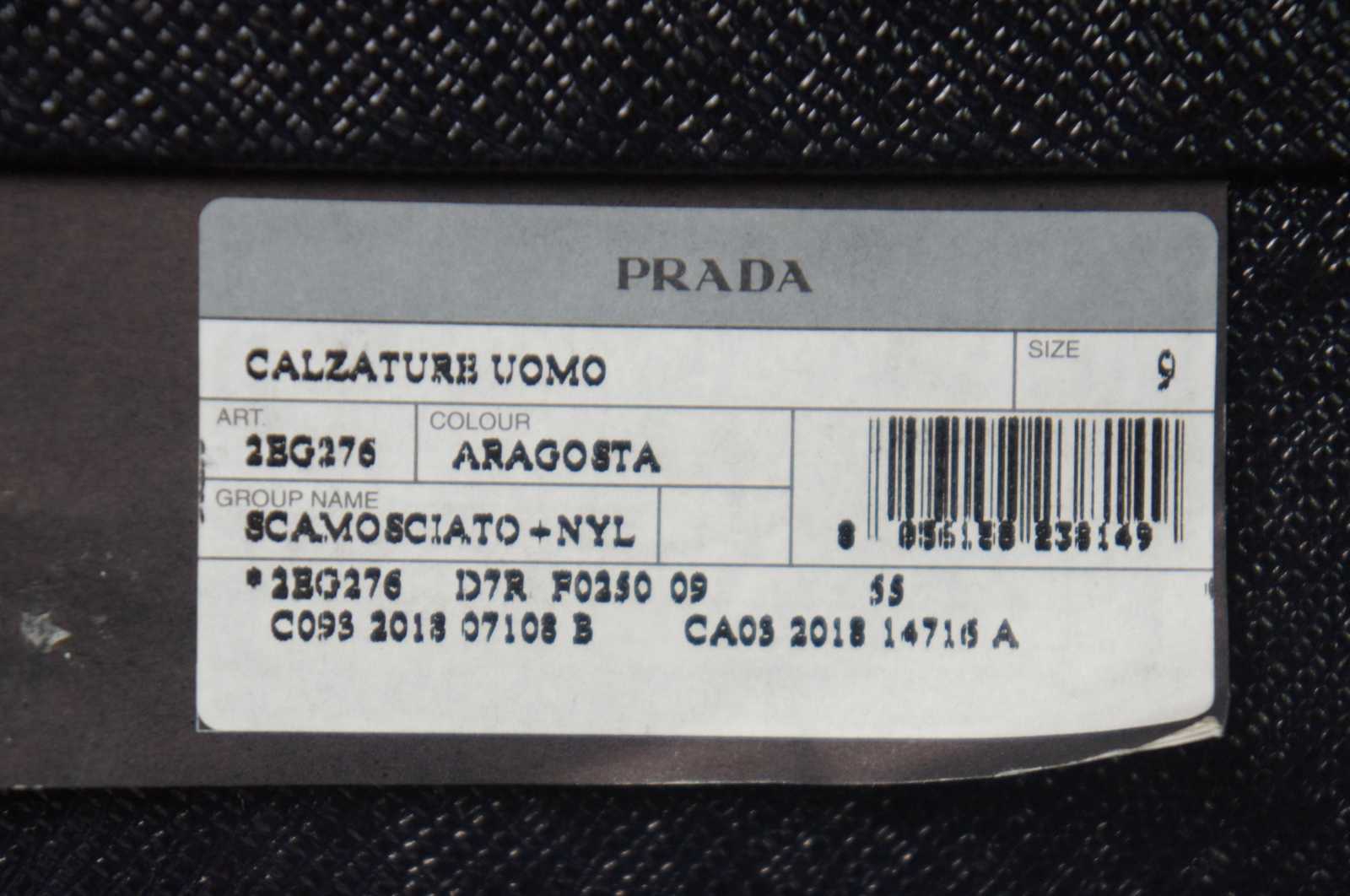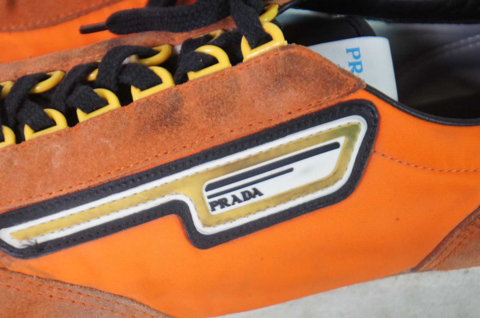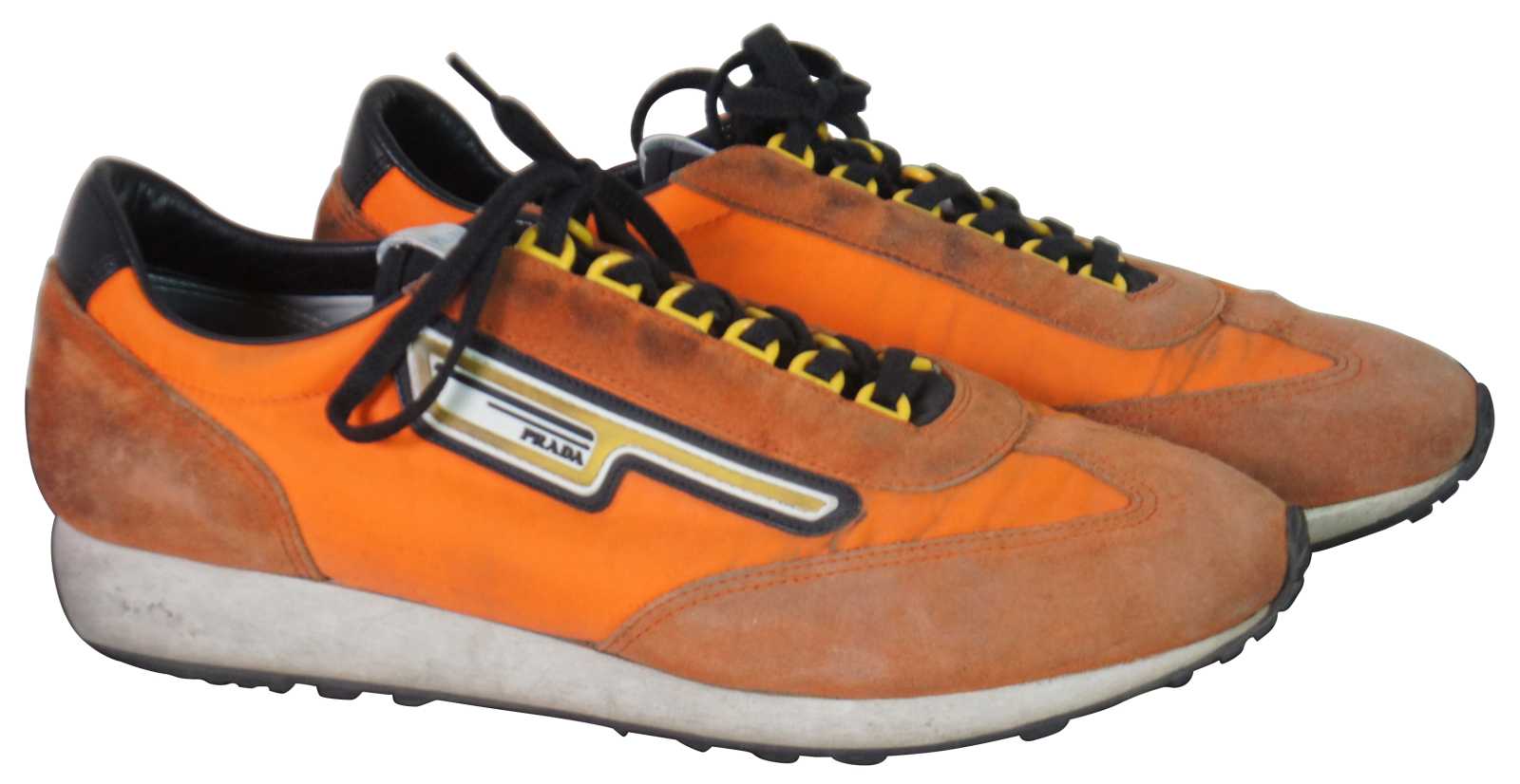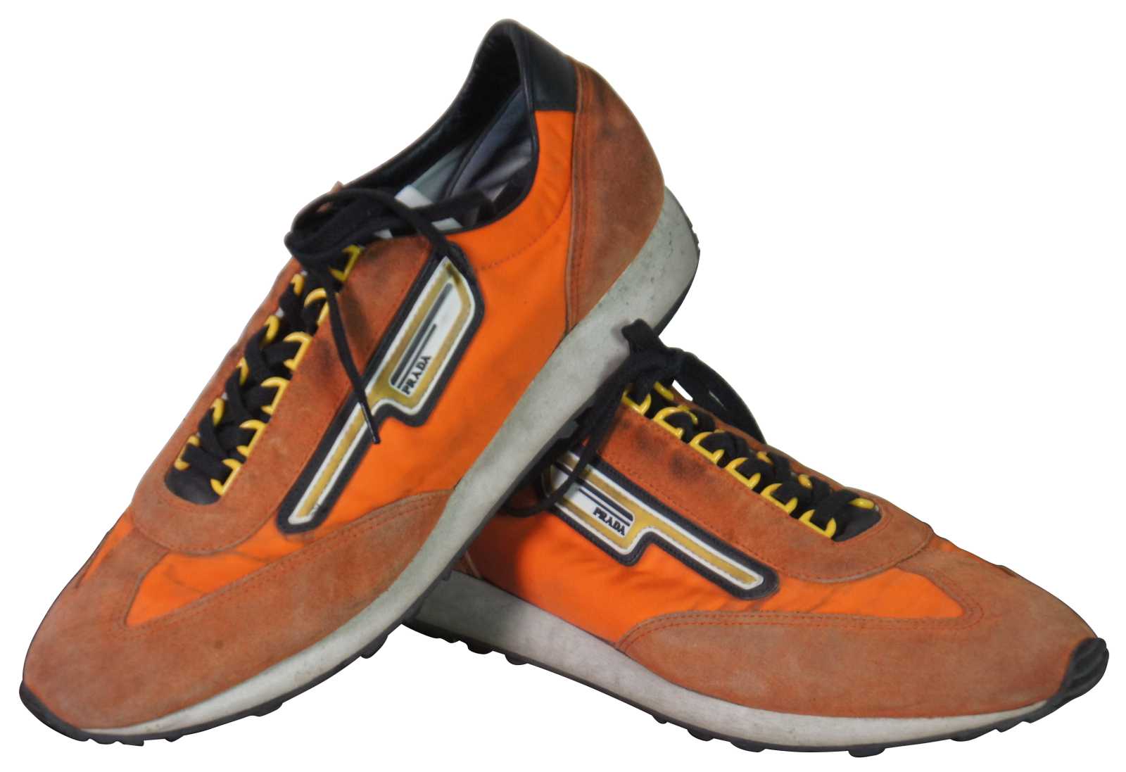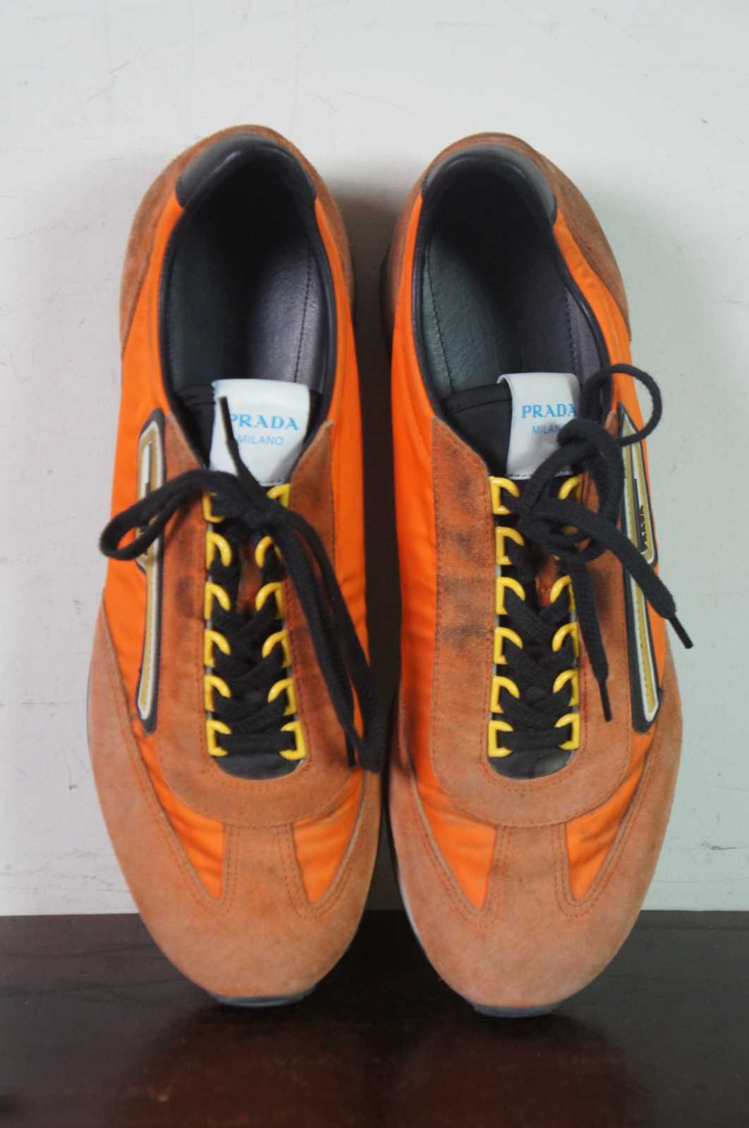 Vintage Prada 2EG276 suede and nylon mens sneakers in Aragosta orange.