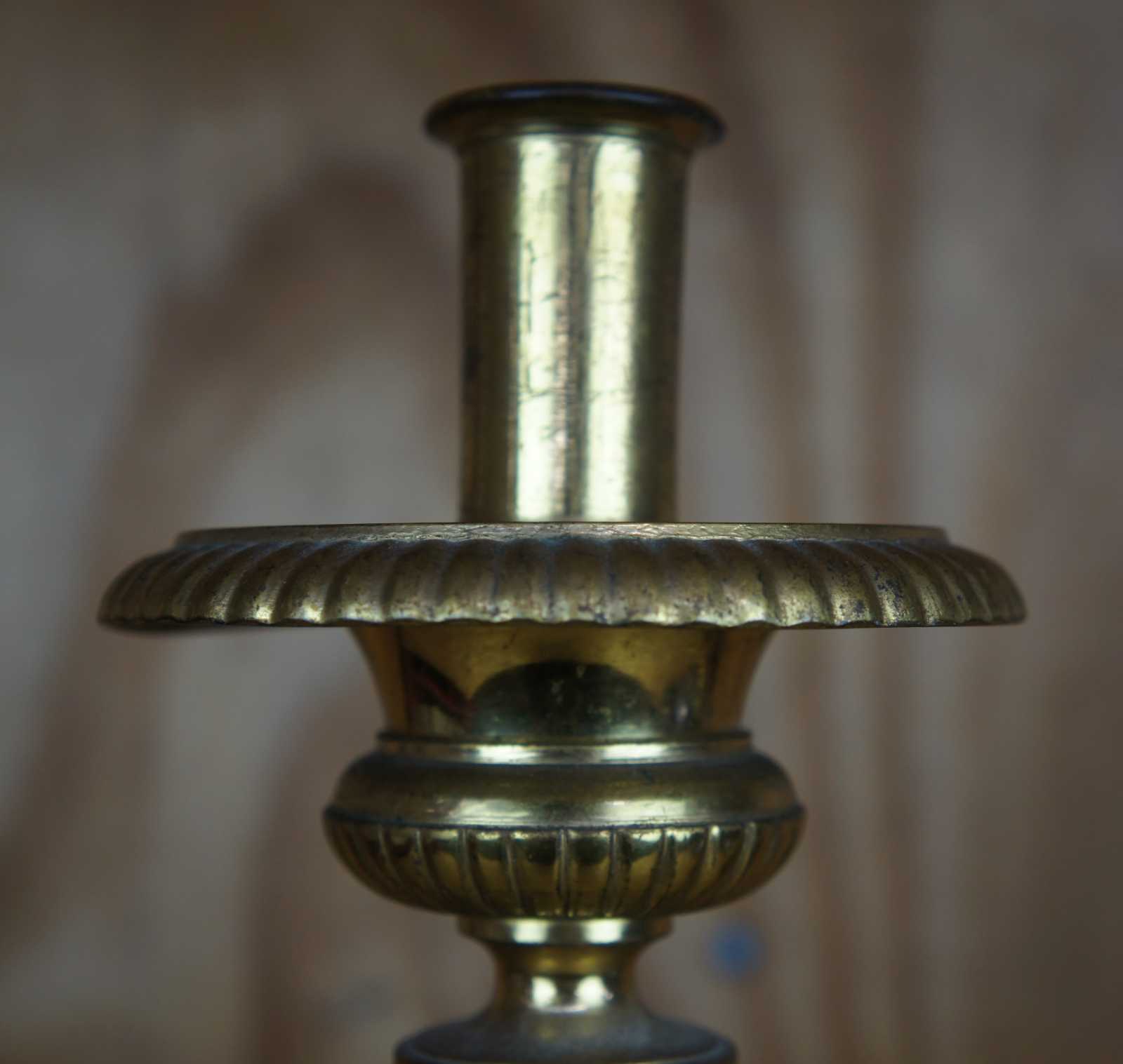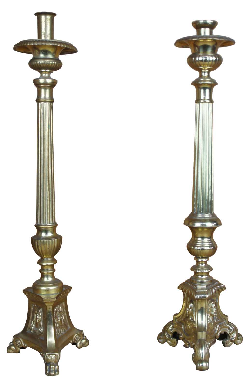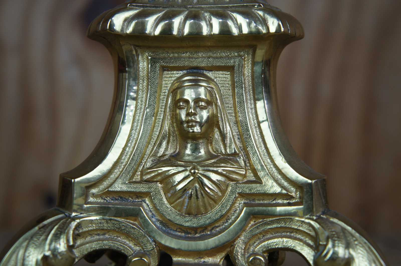 Vintage pair of brass ecclesiastical church alter candlesticks featuring Jesus, Mary and Joseph.
