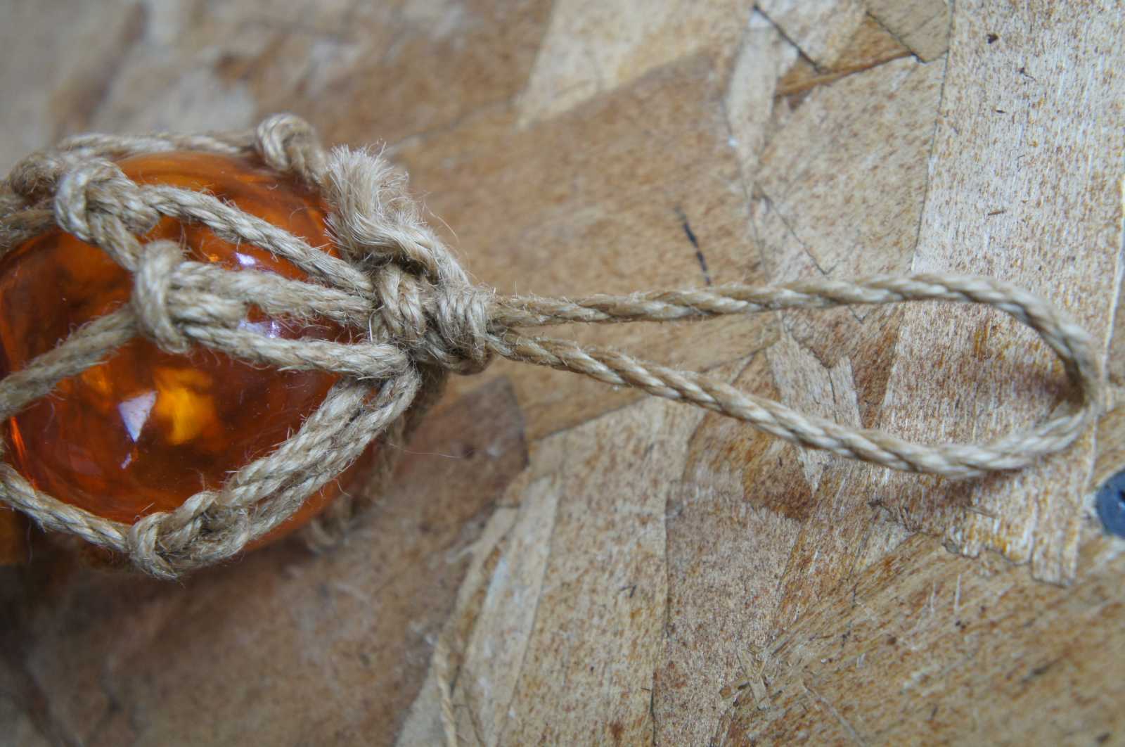 Vintage set of three stacked Japanese hand blown multicolor fishing floats or buoys with rop / net.