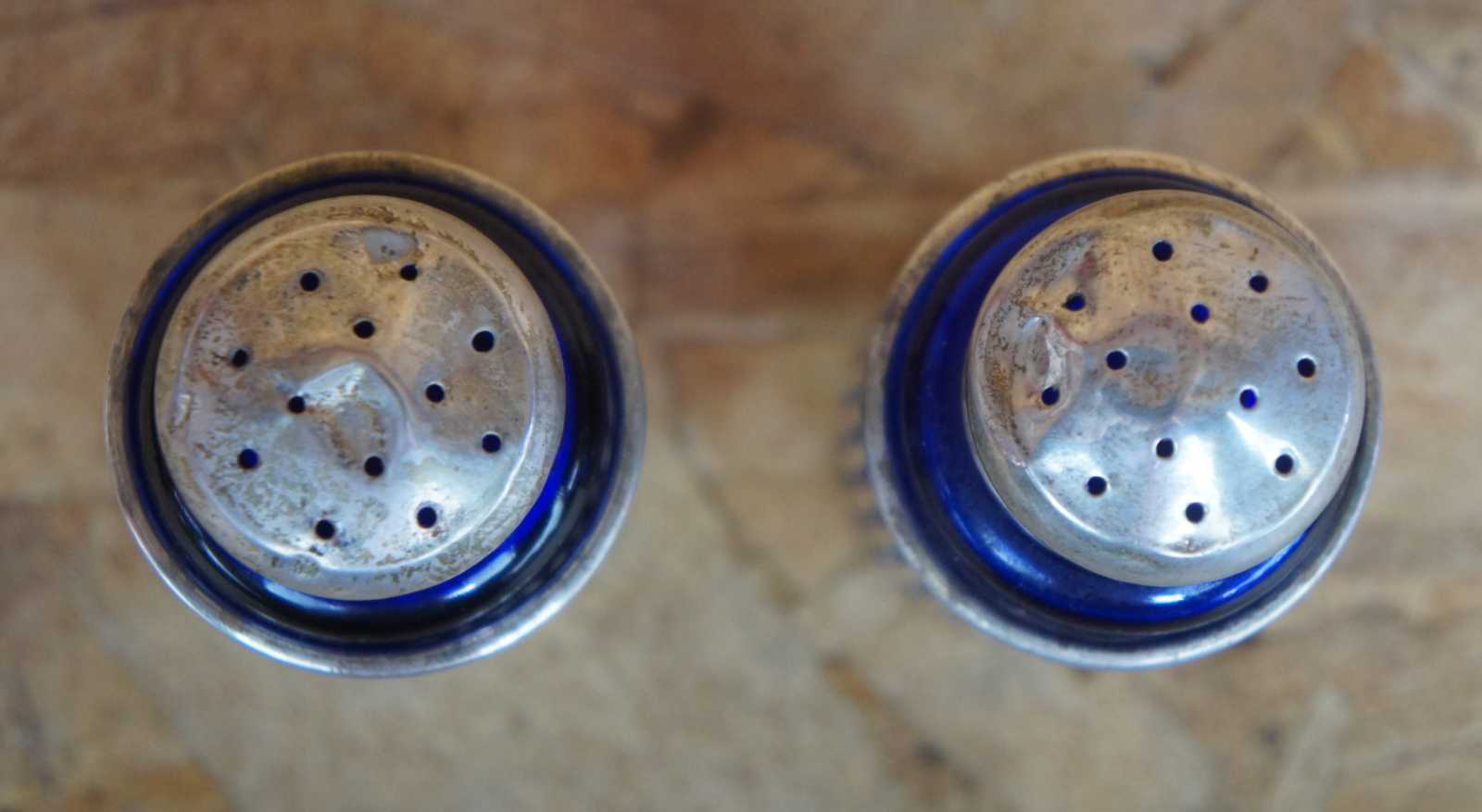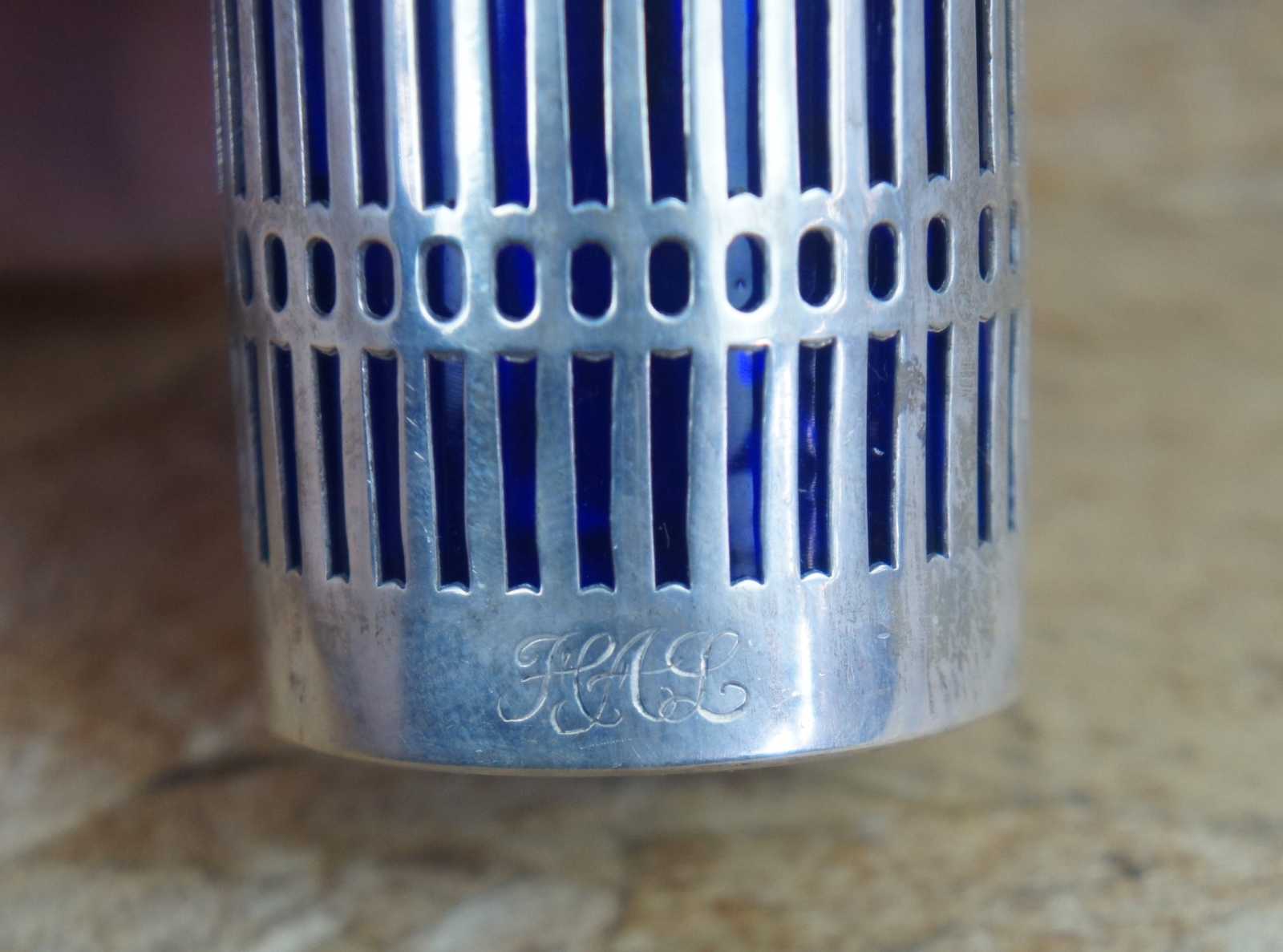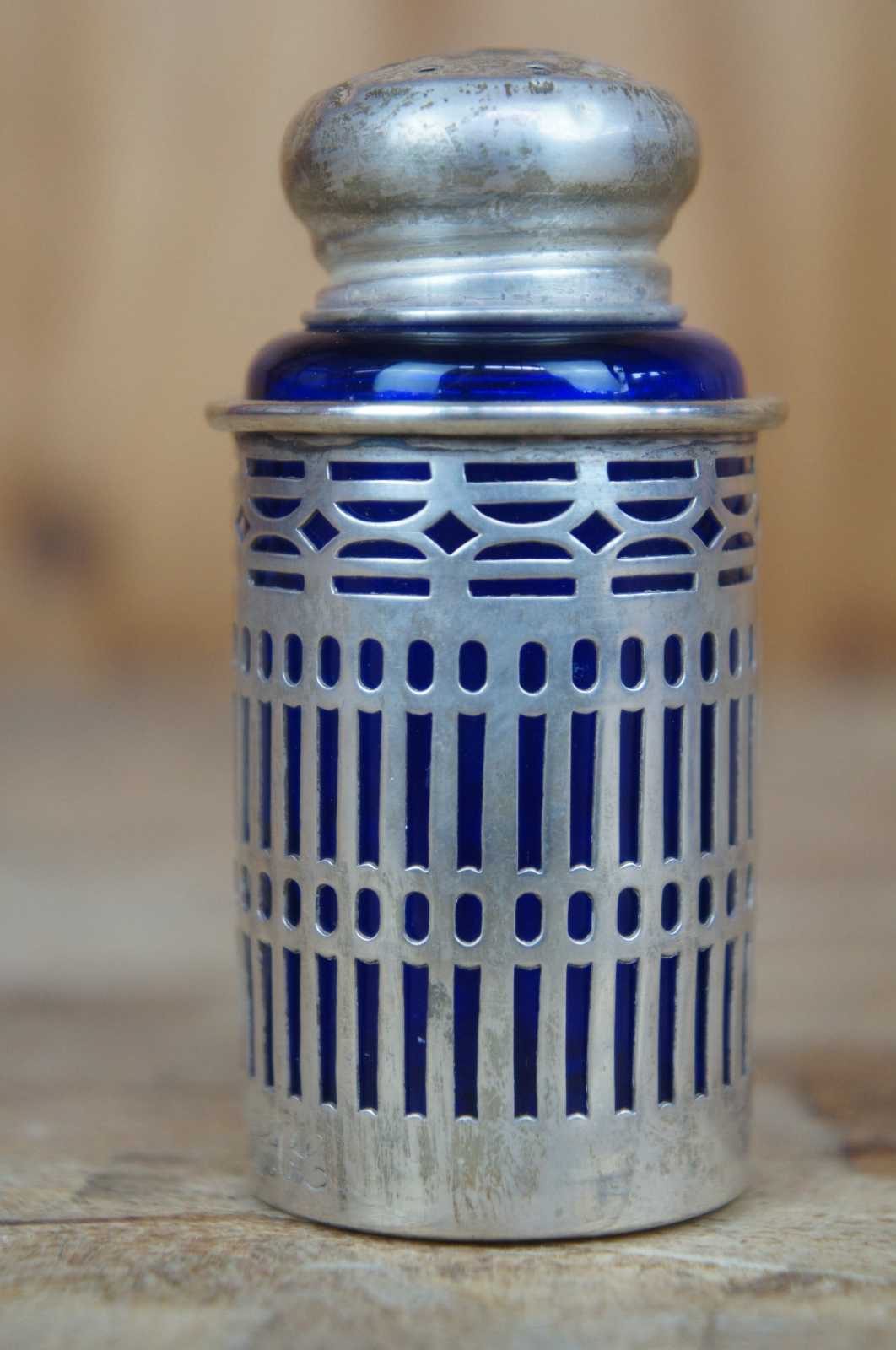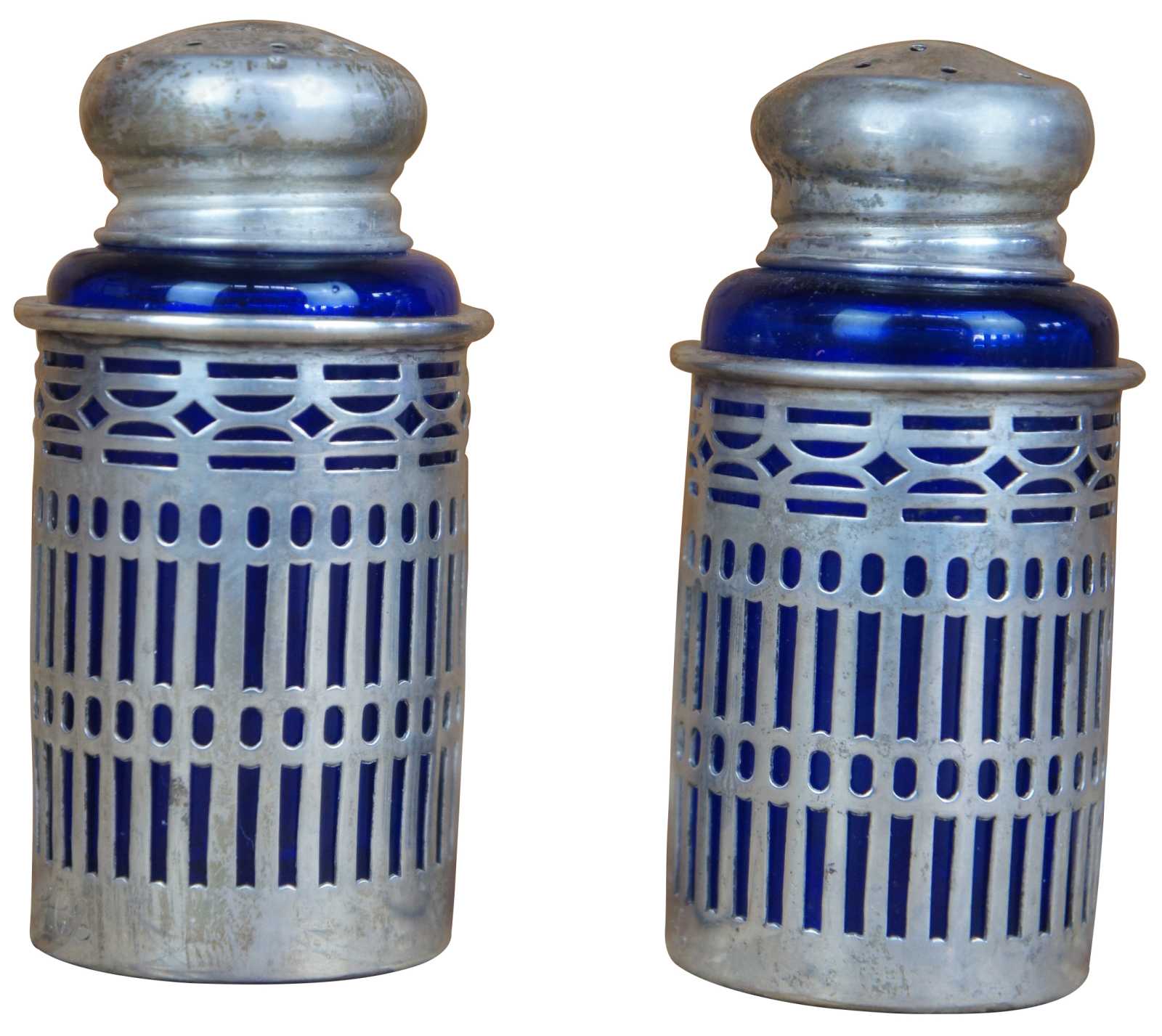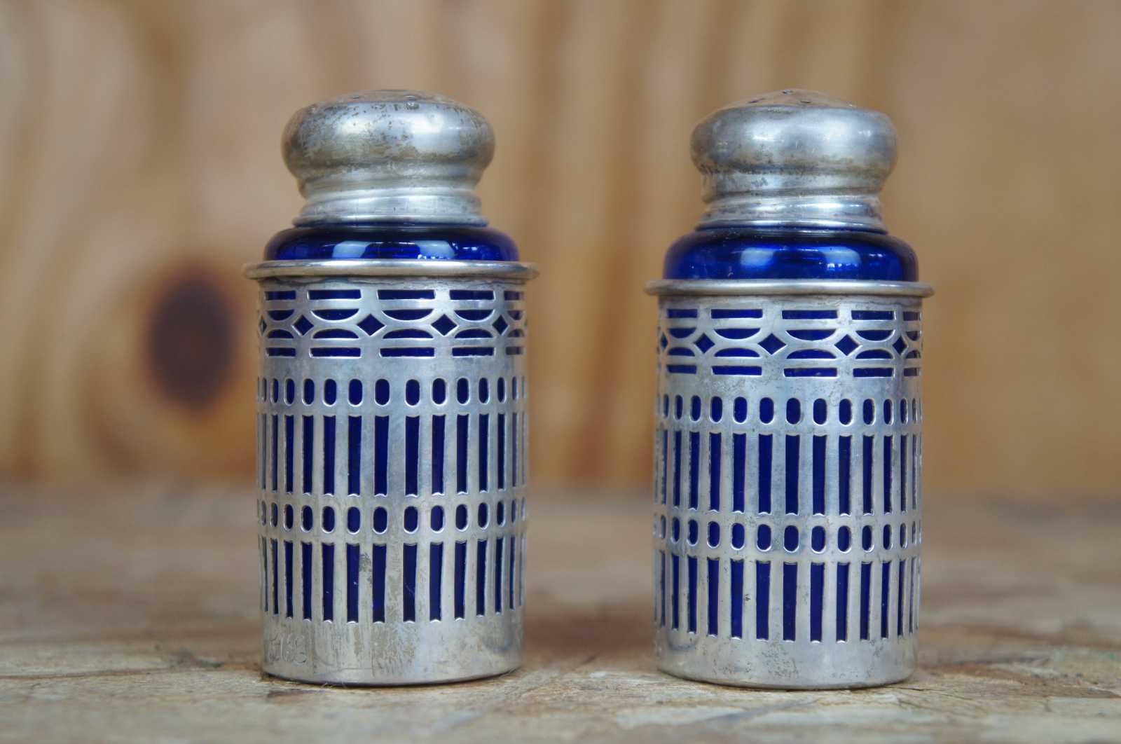 Two vintage Webster sterling silver 925 salt and pepper shakers featuring pierced / reticulated / filigree design with cobalt blue glass inserts.