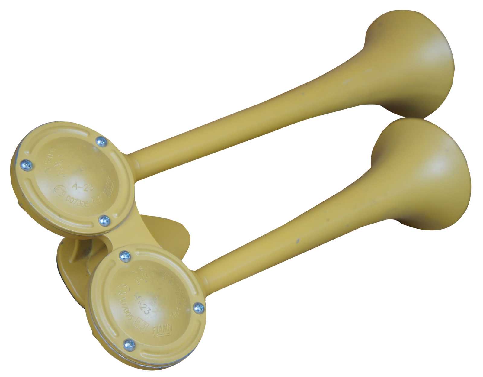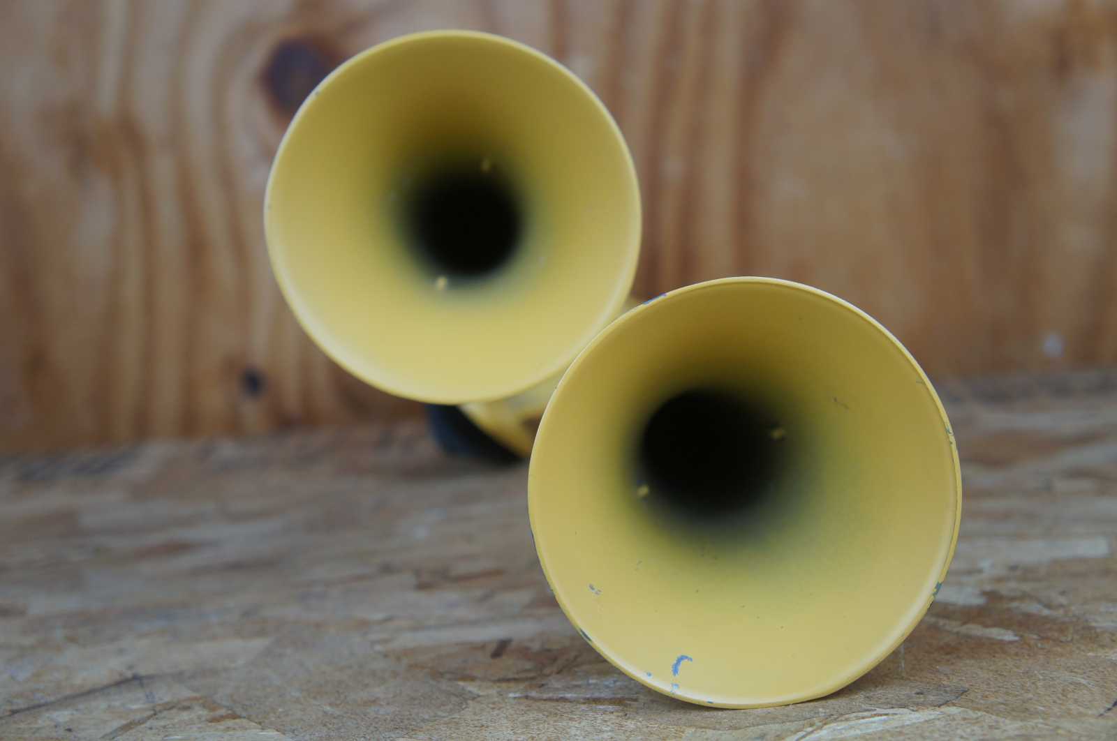 Vintage yellow Fiamm Tipo Fultone L&H A-23 007005 dual tone trumpet air horns. Made in USA. Boat, train, truck.