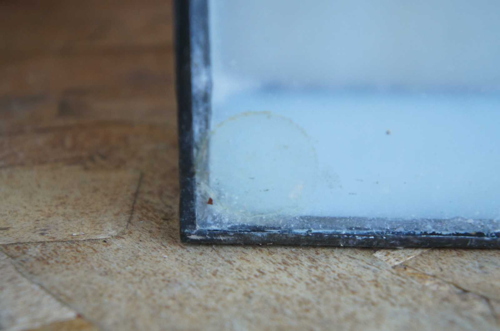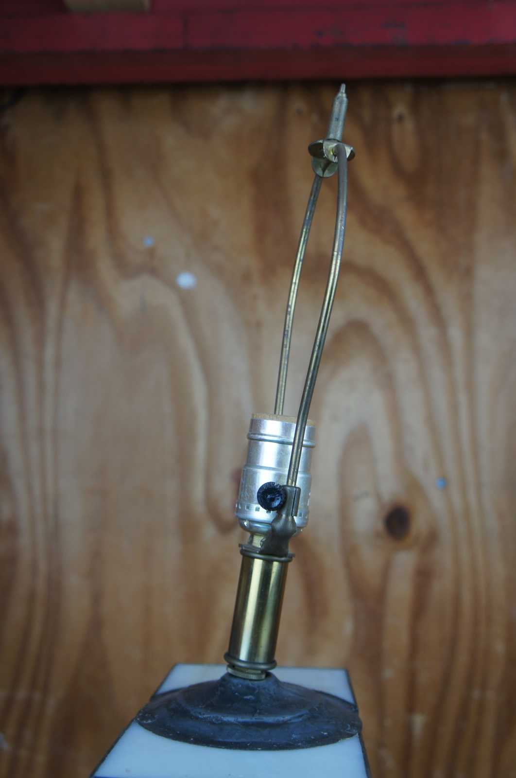 Fair condition, crack to bottom of base, tilted fixture, no shade.