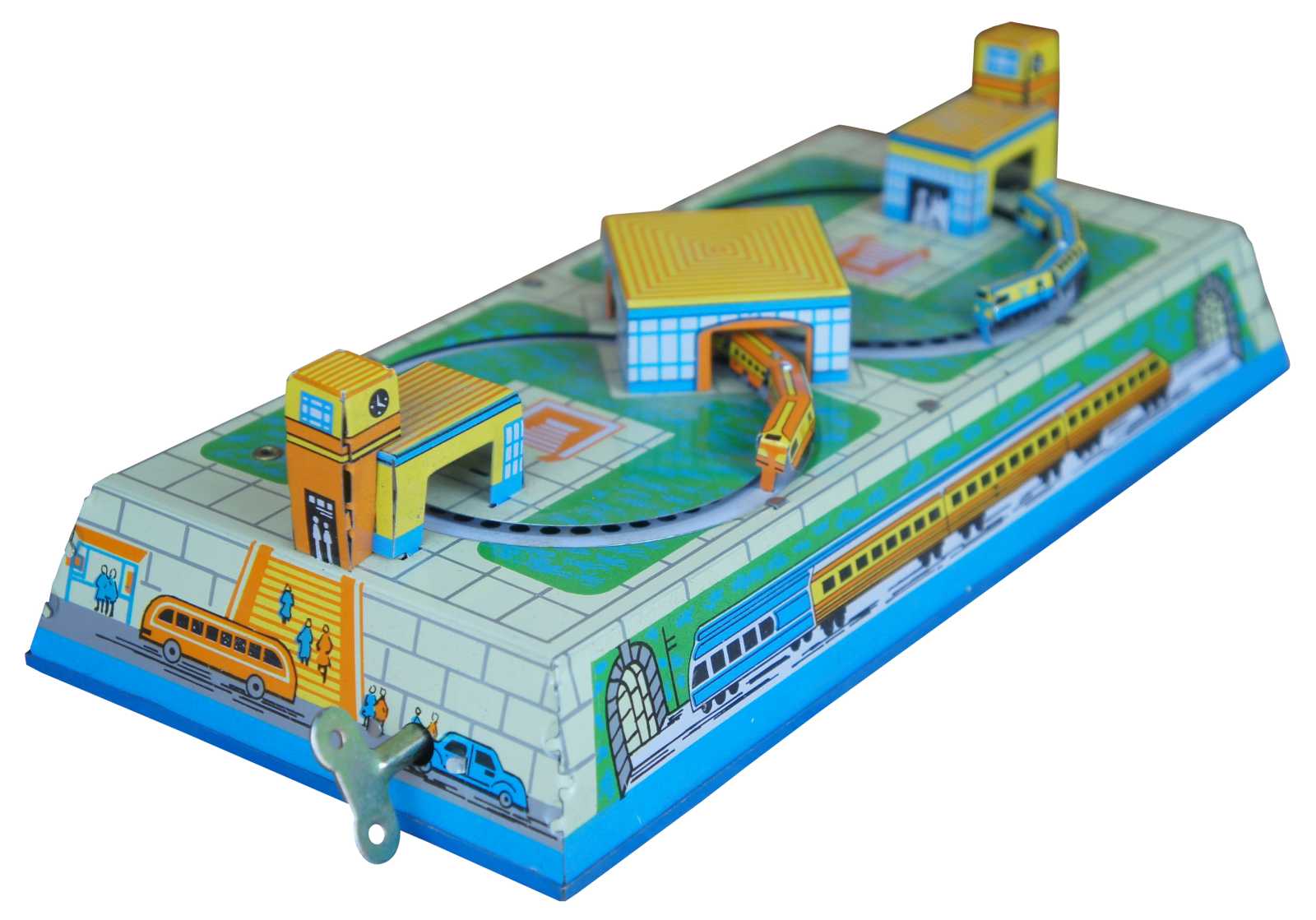 Mid century Schylling tin wind up toy featuring dualing train stations. MS279.