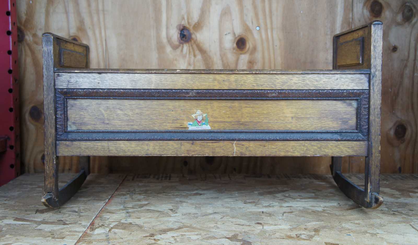 Antique Victorian quartersawn oak baby or doll rocking cradle / glider featuring carved trim and sticker of Radio's Orphan Annie.