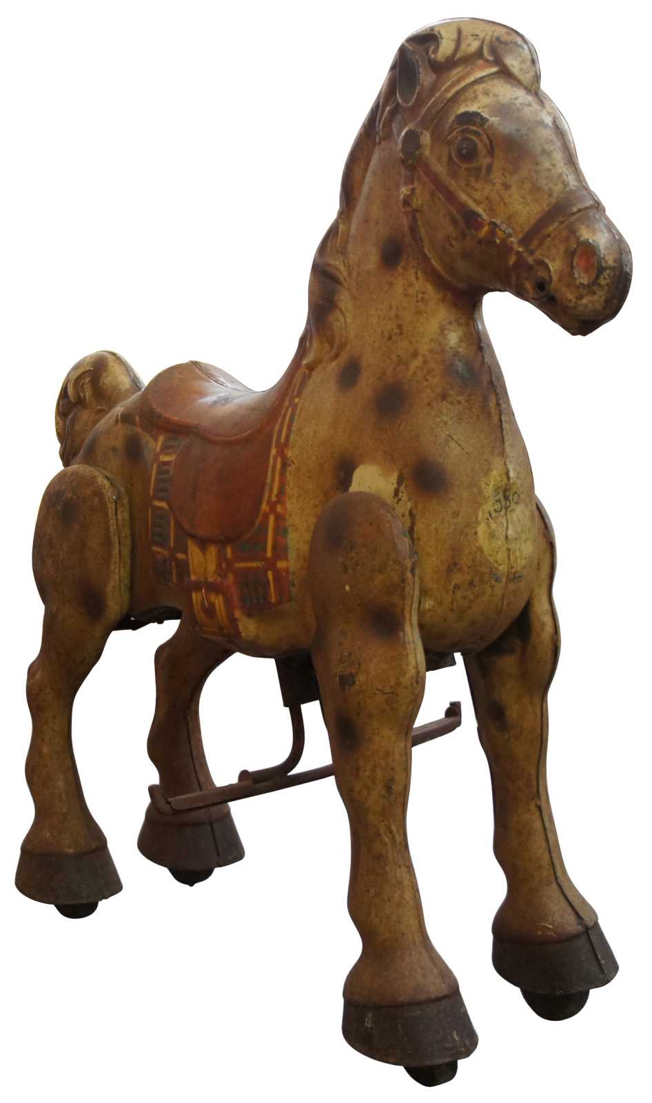 The range of colours eventually ranged from red saddles and blue saddle cloths on bodies of pale grey-green with randomly sprayed brown spots to silver bodies with softly sprayed black manes and tails and yellow saddles cloths. This colour scheme was reversed and black horses with silver manes and tails were produced as well. Gold saddle cloths with red saddles were chosen for black horses and theses had been introduced by the 1960s. Brown spotted horses remained in production with some sporting tartan saddle cloths in red, yellow and turquoise. Mobo Ponies were usually painted white with touches of colour decoration. These were manufactured as a complete shape without separate legs, and were attached to push-along handles. They featured two small wheels on the back axle and another concealed under a large hollow front hoof. A trotting pony, attached to a child-size cart, also of pressed steel, was known as the Pony Express.