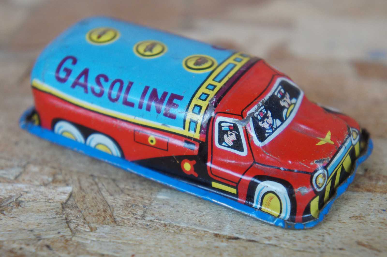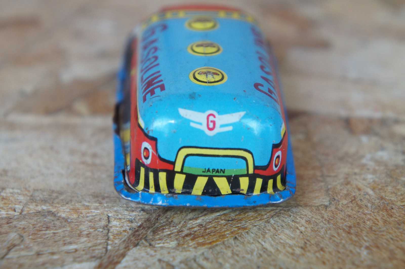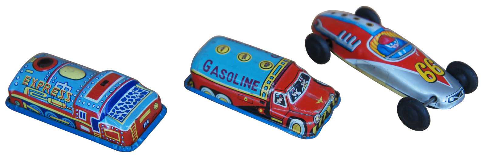 Lot of 3 vintage Japanese free rolling tin penny style vehicles; featuring, #66race car, and gasoline / gas tanker truck and express train. Made in Japan.