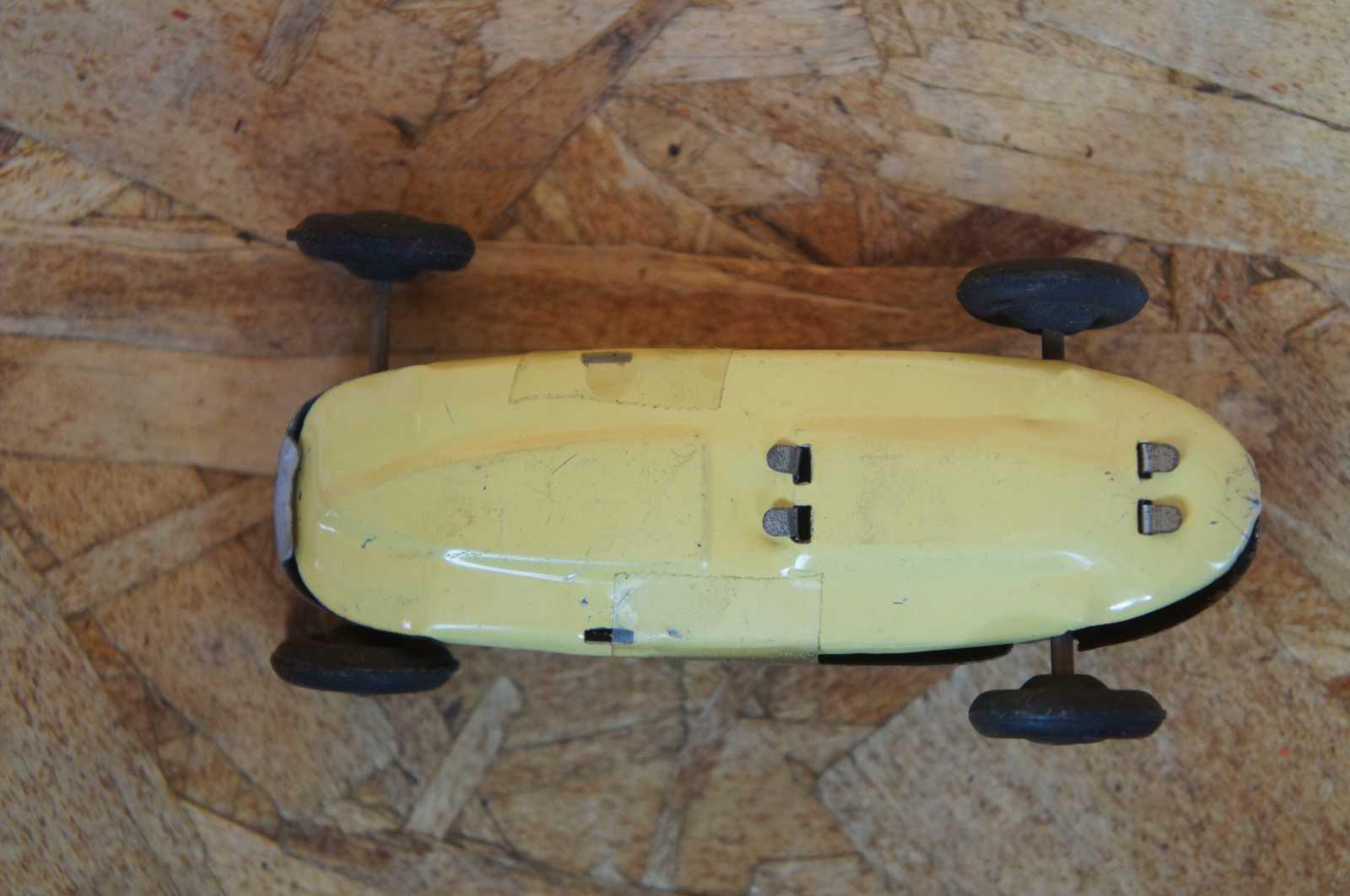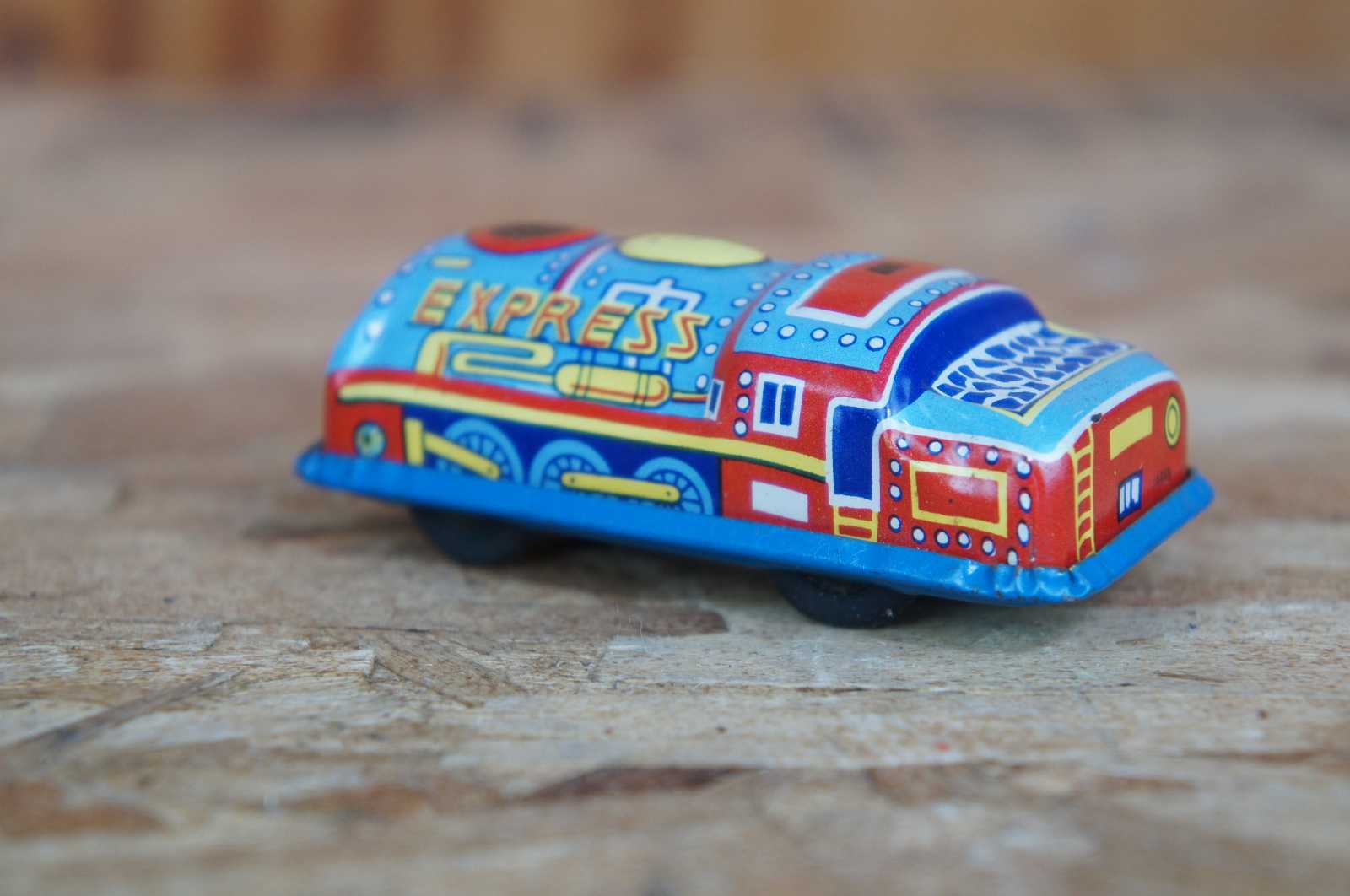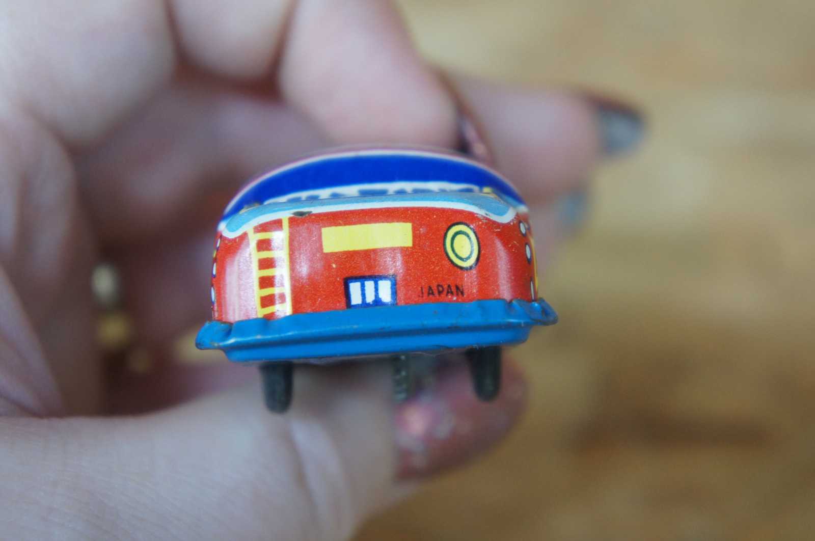 Lot of 3 vintage Japanese free rolling tin penny style vehicles; featuring, #66race car, and gasoline / gas tanker truck and express train. Made in Japan.
