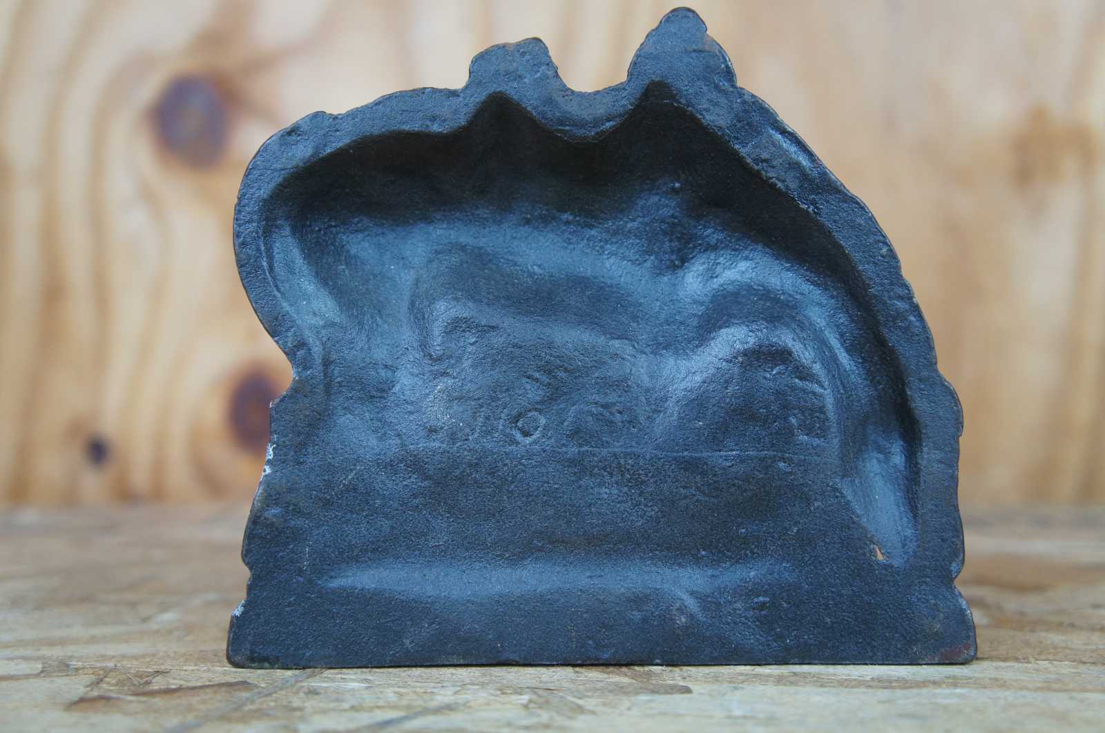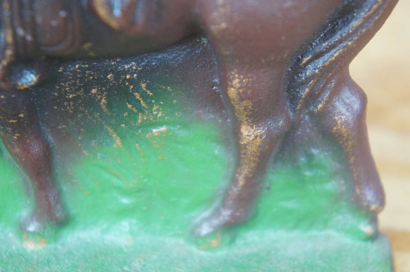 Min century / antique bookends or doorstops are made of cast iron and feature a chestnut horse grazing on a green field while wearing a western saddle.