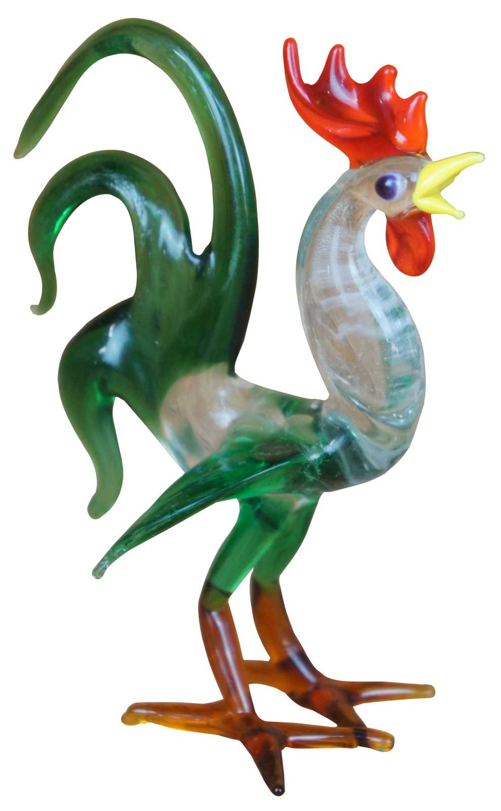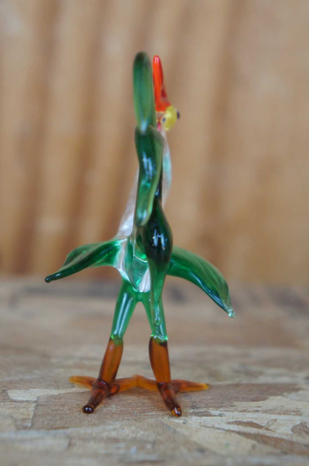 Vintage hand blown art glass figurine in the form of a brightly colored rooster or chicken strutting / clucking / crowing.