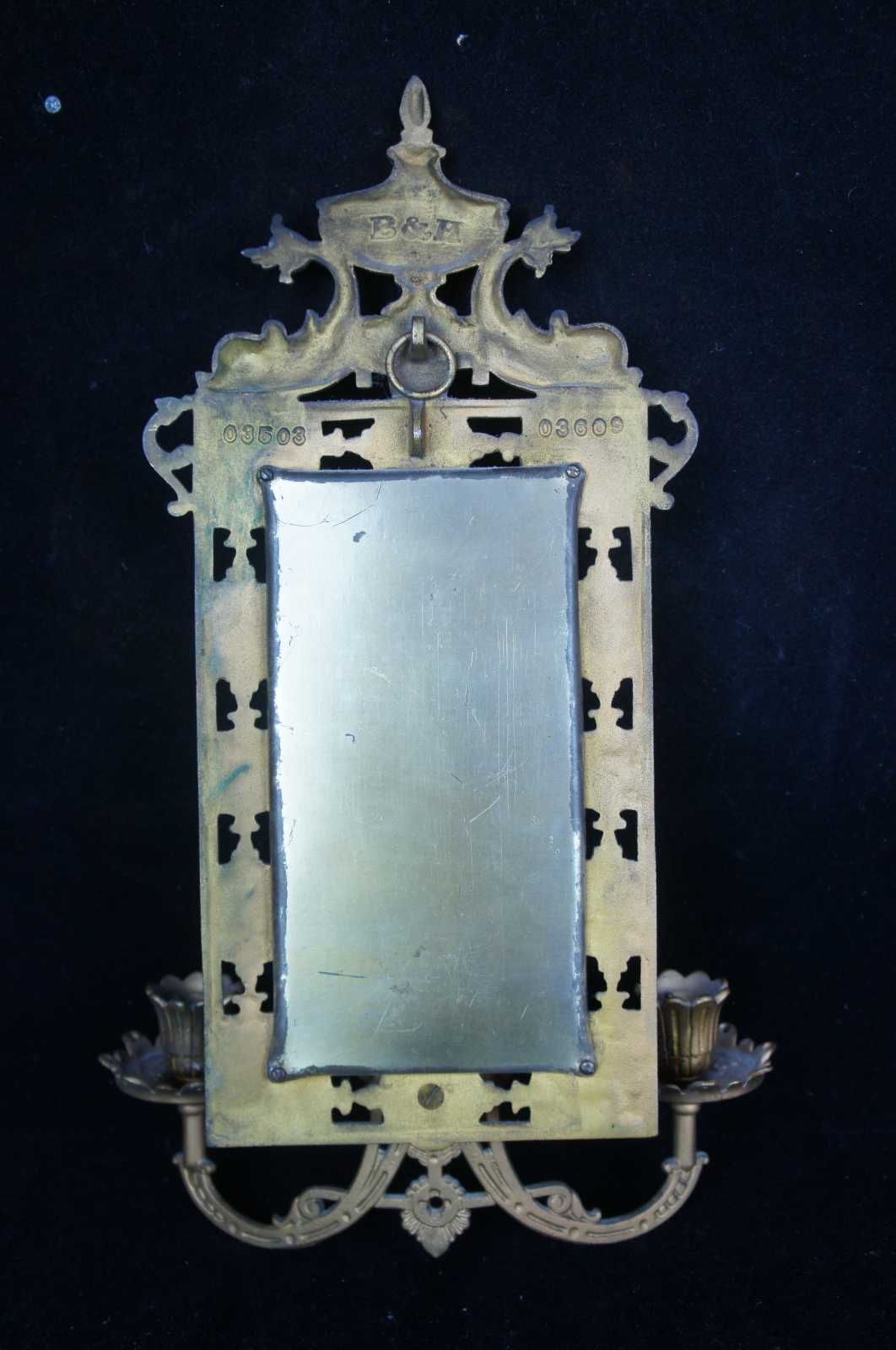 Antique gold wall hanging double sconce candle holder with mirror featuring ornate pierced reticualted design with crown finial and dolphins / dauphins. Marked B&H 3503 and 3609
