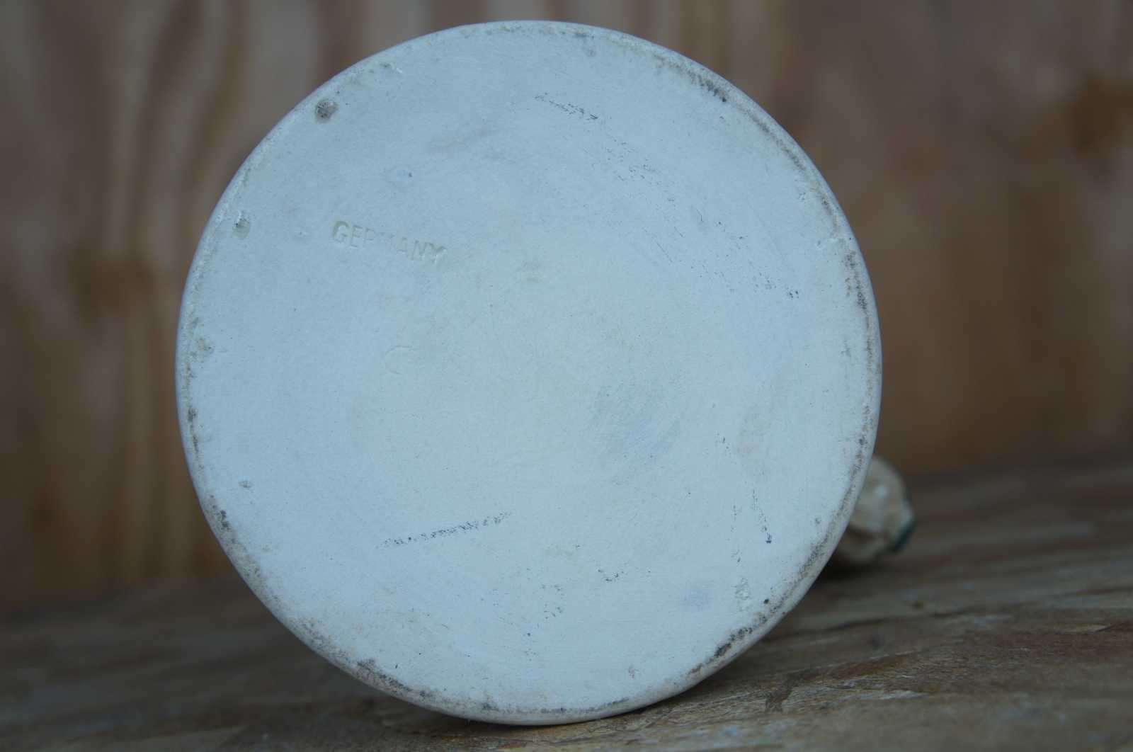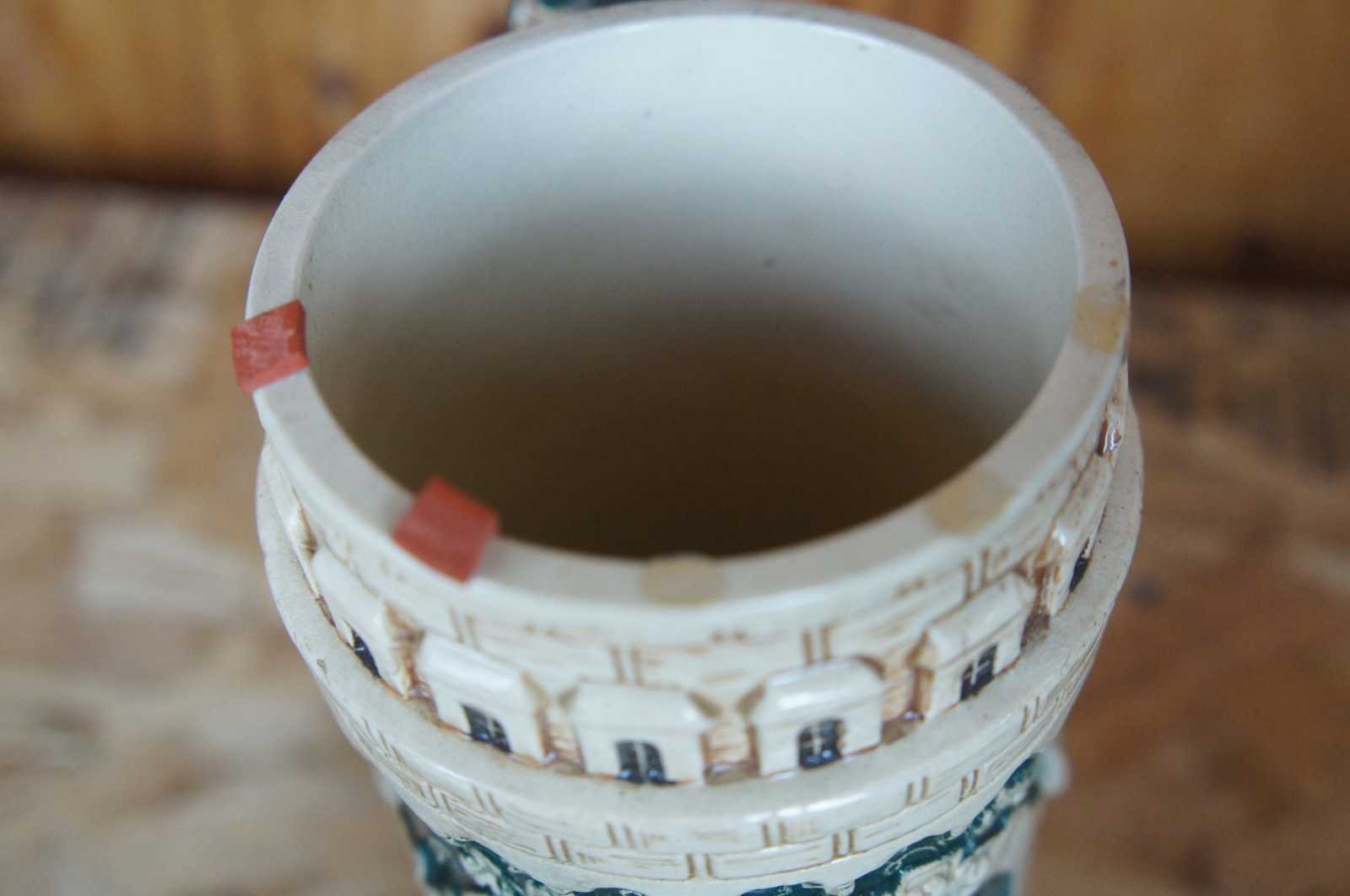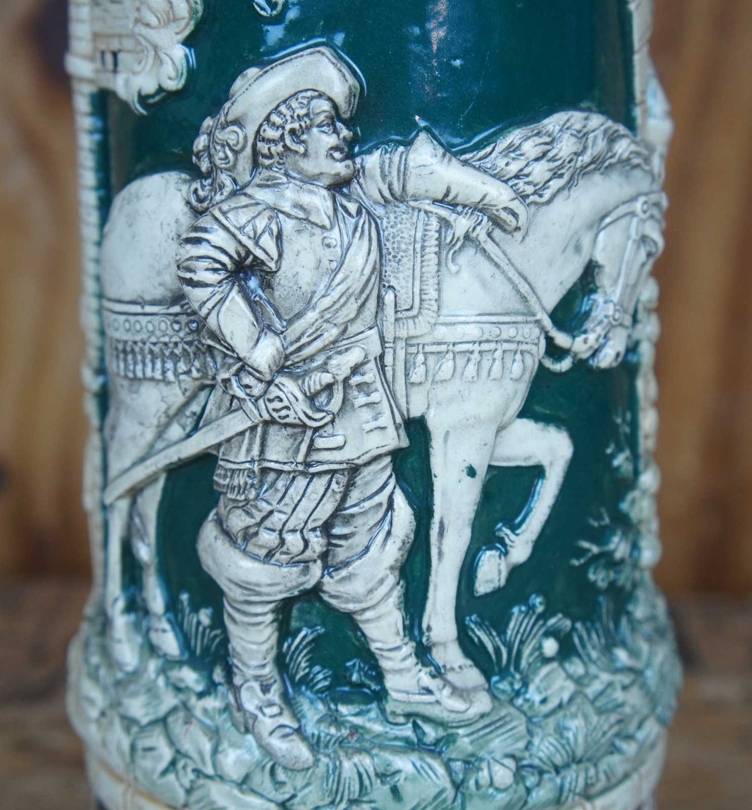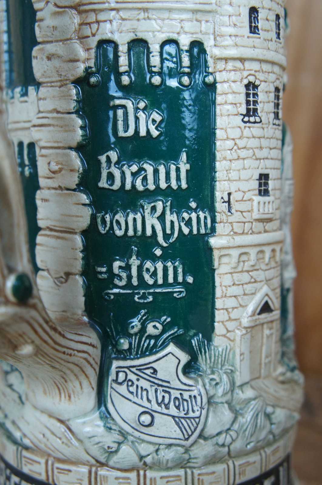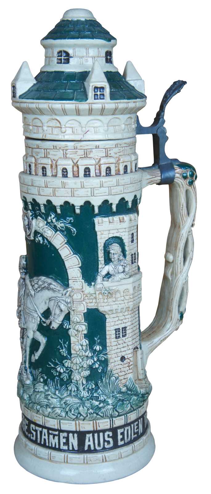 Vintage German earthenware pottery stein featuring high relief form depicting a noble woman in a tower addressing a courtly knight on horse. Text reads: “Rebensaft u. Ritterliebe stammen aus edlen Trieben.” (Wine and knightly love come from noble impulses.) The theme of this stein is taken from an old German legend that tells of Gerda, the daughter of Count Diethelm of Rheinstein. Although Gerda shares a love with Helmbrecht, heir to Sternburg, Count Diethelm promises her hand in marriage to Hembrecht’s conniving uncle Gunzelin. However, fate smiles on the young lovers and Gunzelin has a fatal accident on his wedding day, allowing Gerda to marry Helmbrecht, her true love, and live happily ever after. The stein is tall, with a castle roof like flip top and pewter handle.