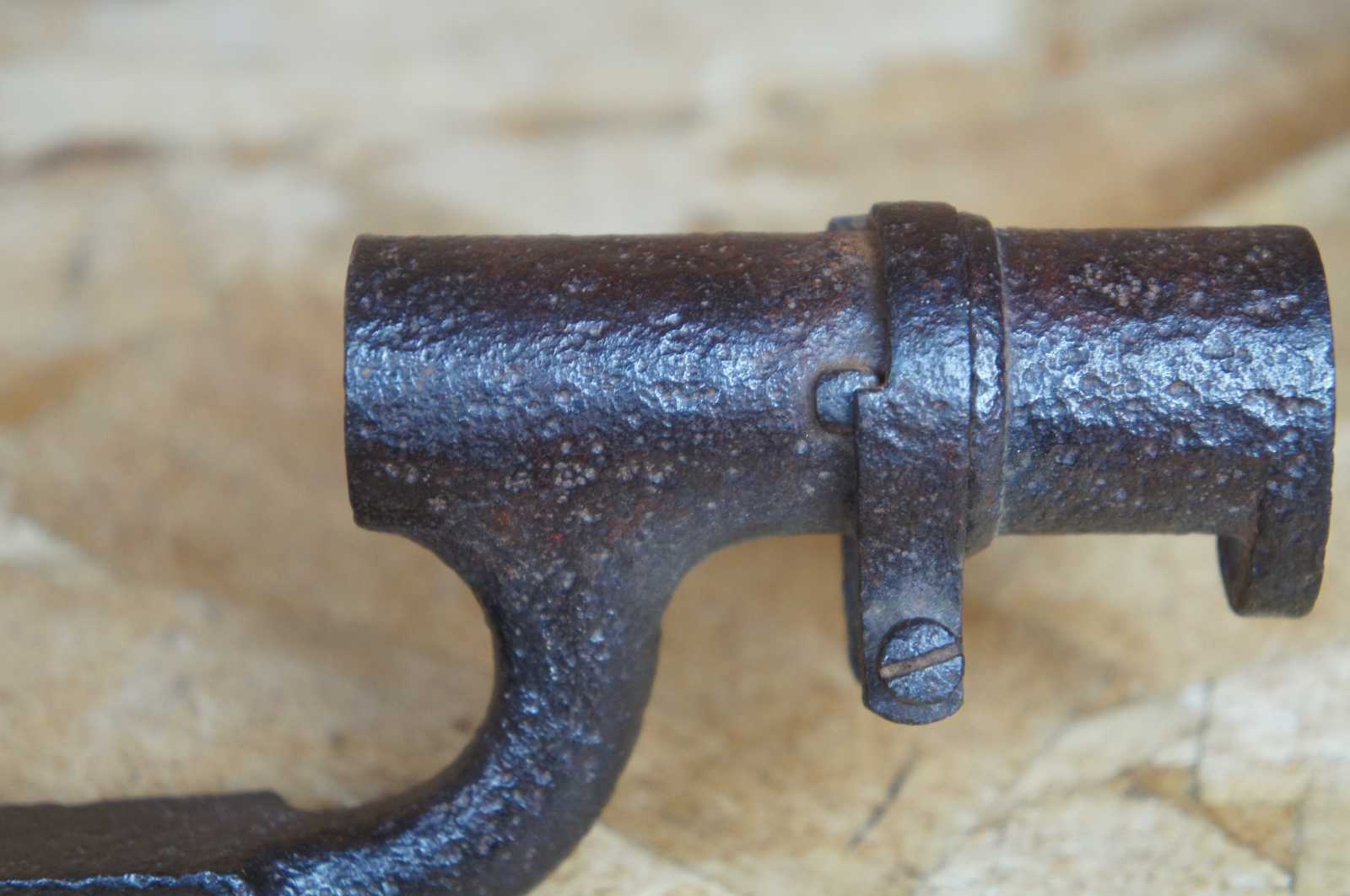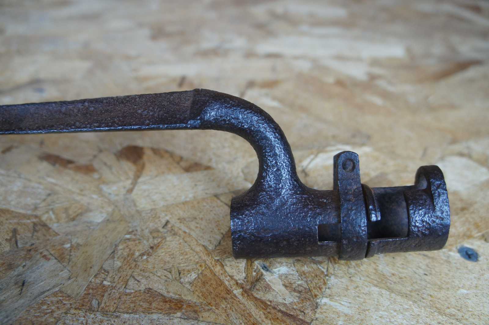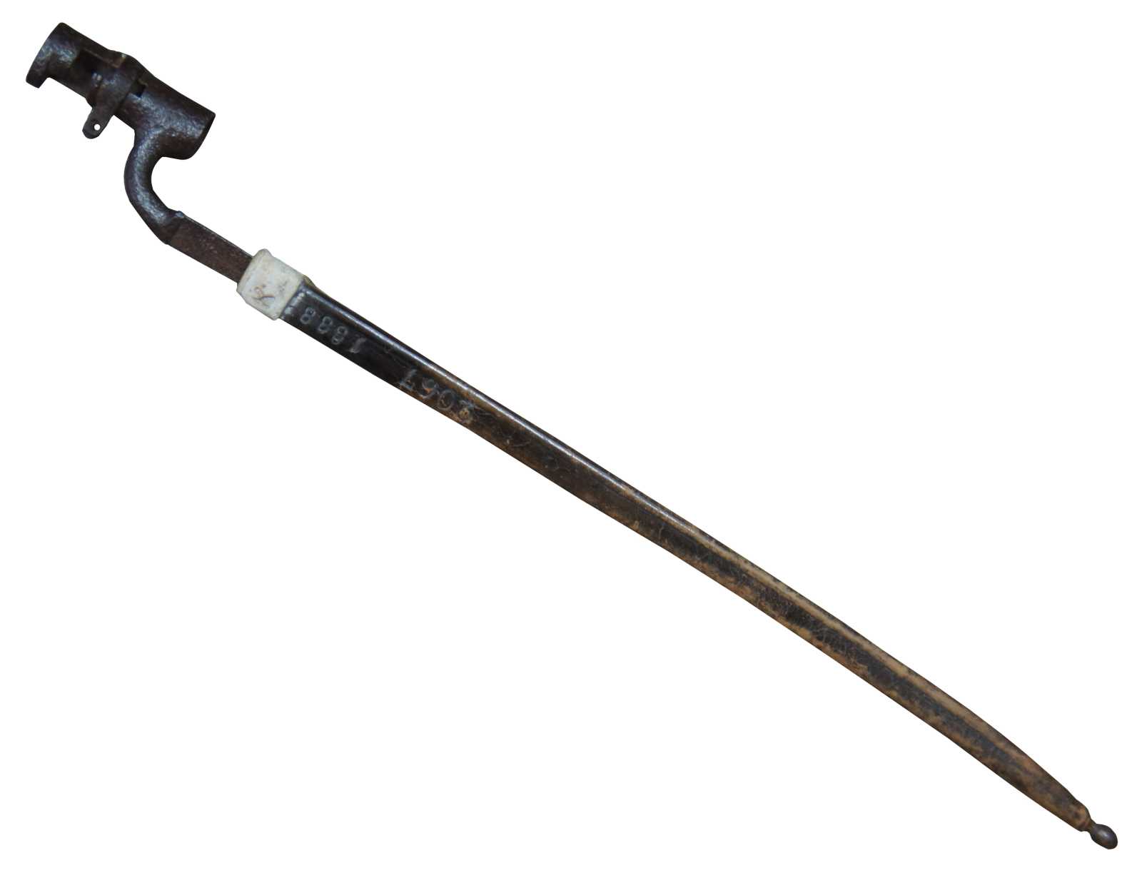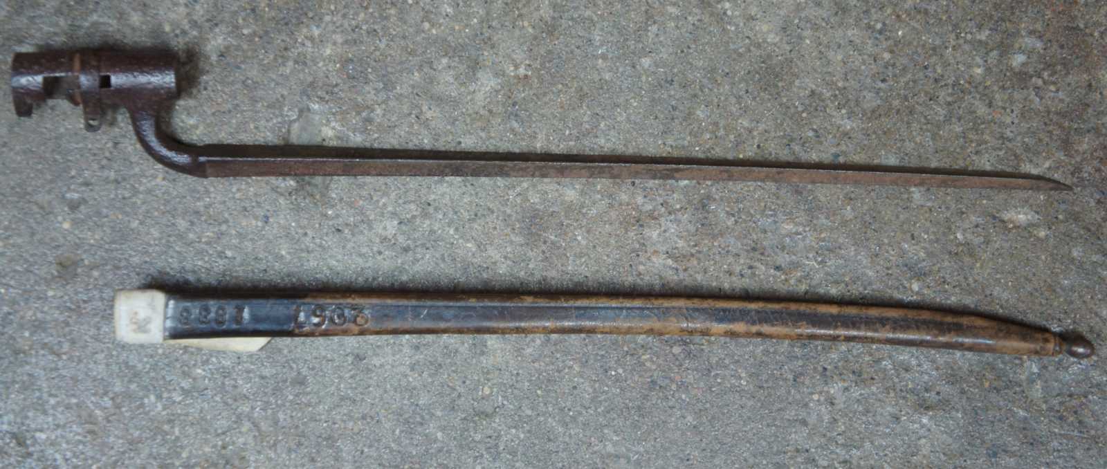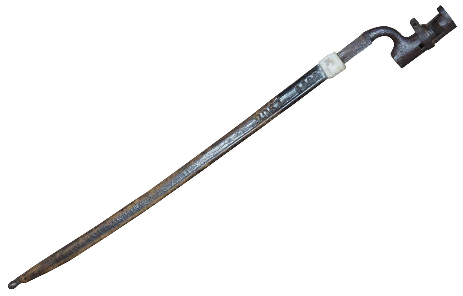 Antique US war infantry socket bayonet knife / dagger / sword and leather sheath, marked 1888 into the leather.