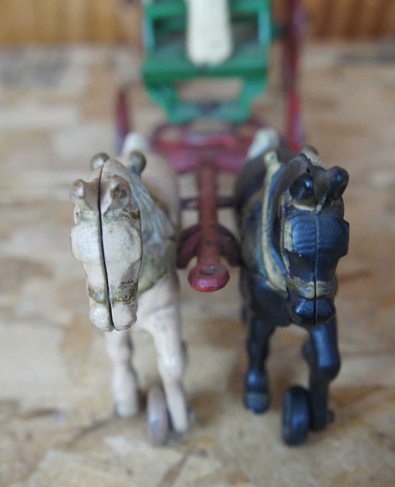 Antique Kenton cast iron green stake wagon pulled by a pair of draft horses.
