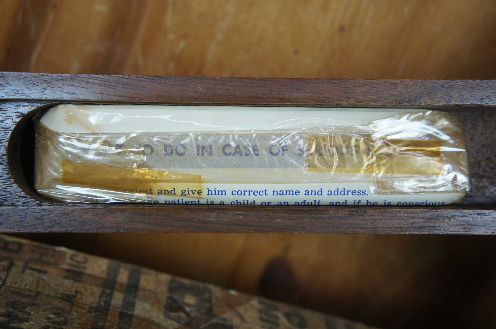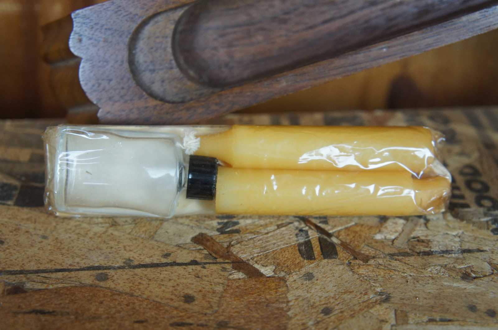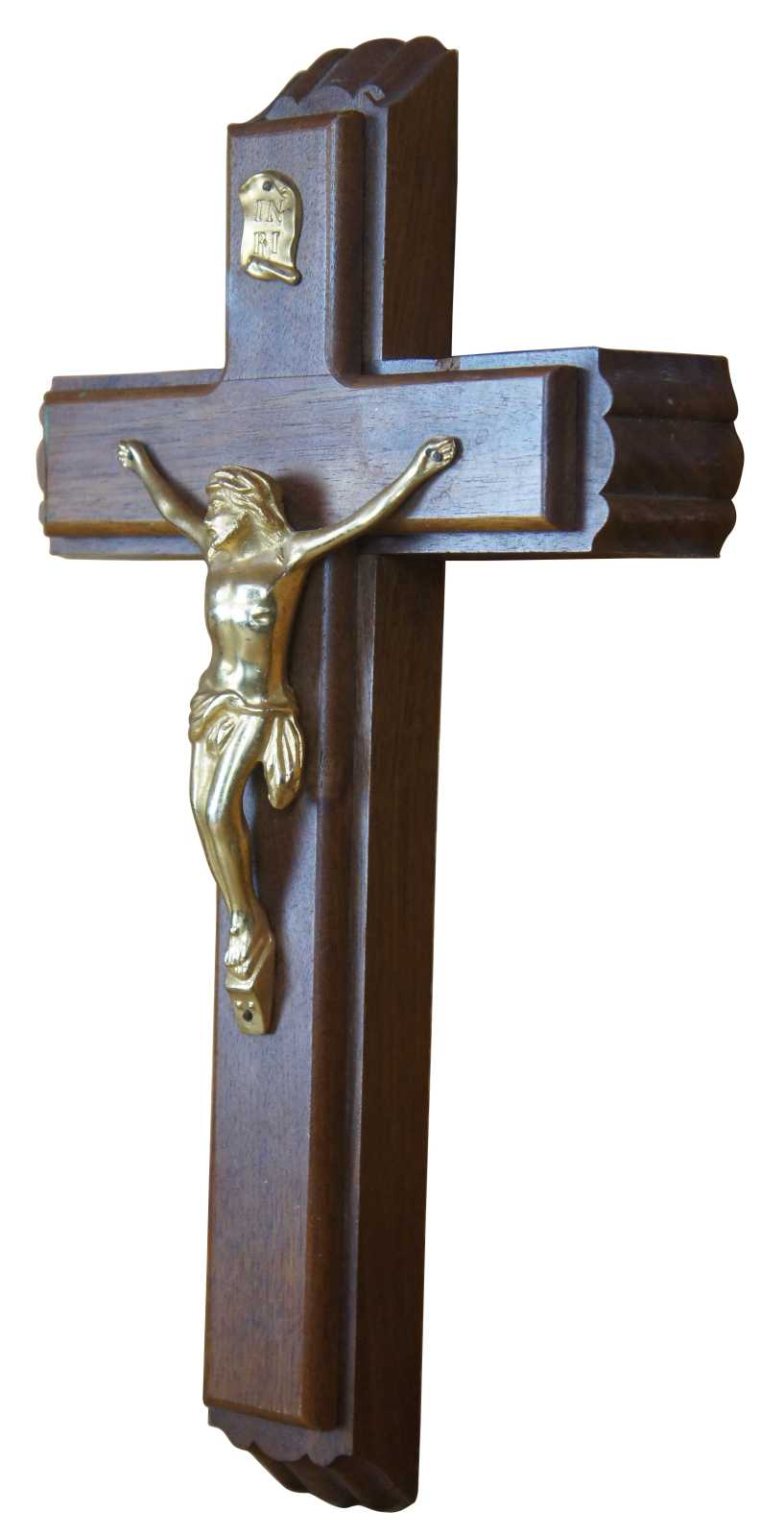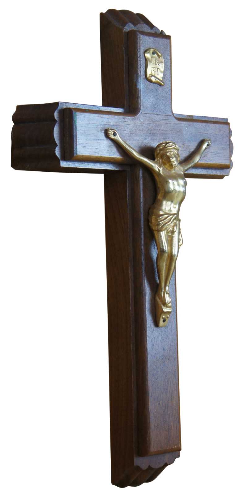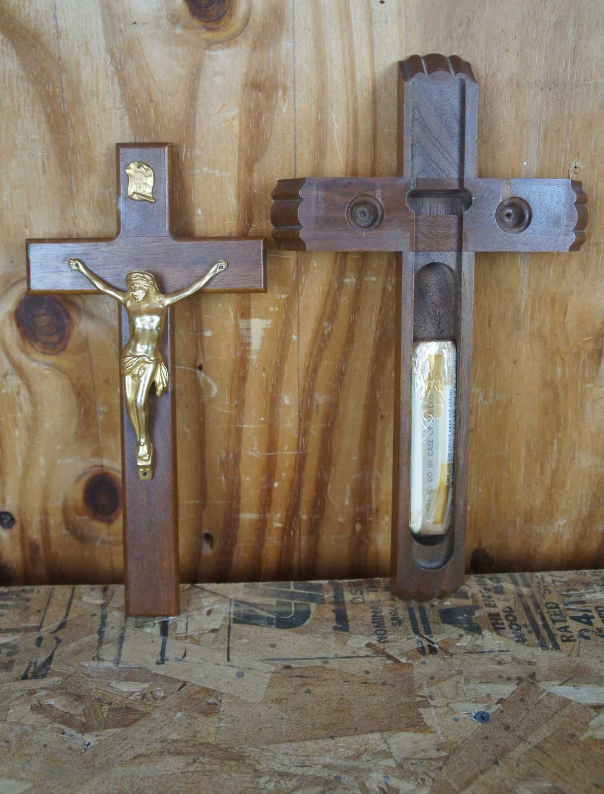 Vintage wood INRI wall hanging last rights crucifix or cross featuring prayer, candles and holy water.
