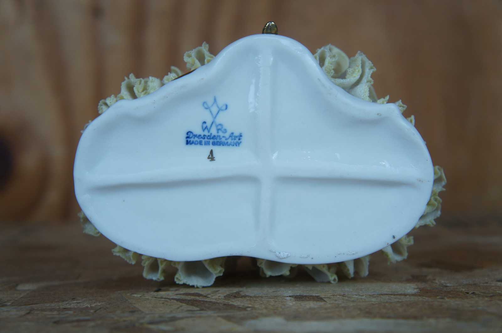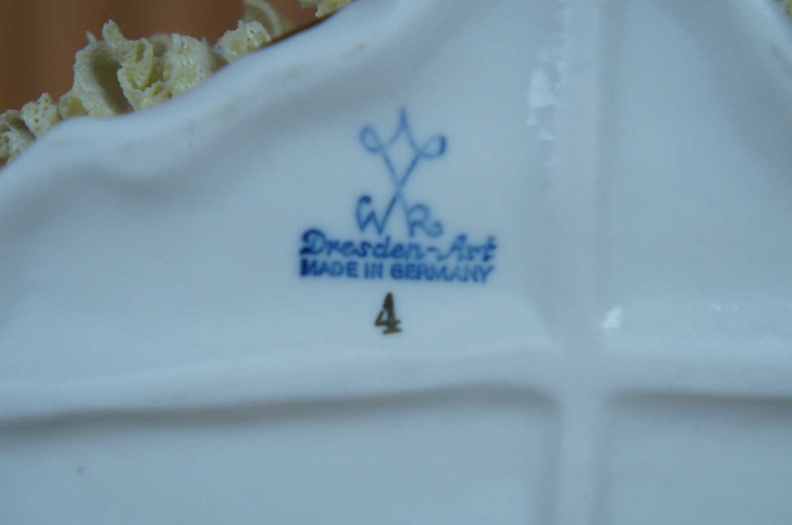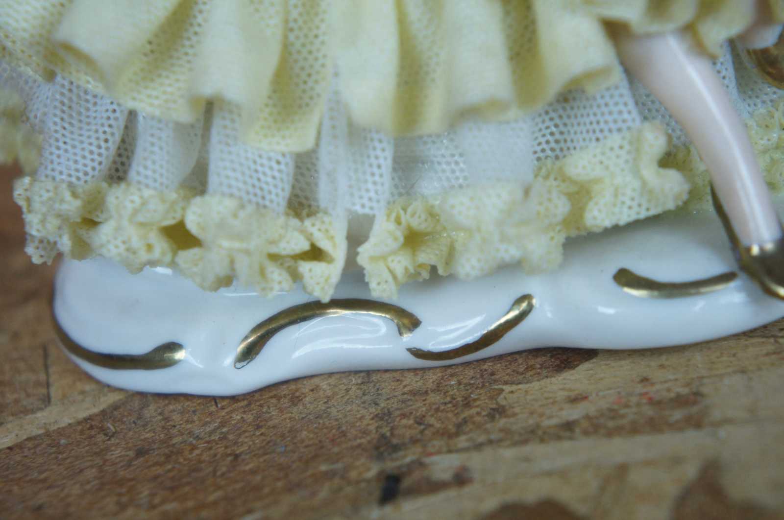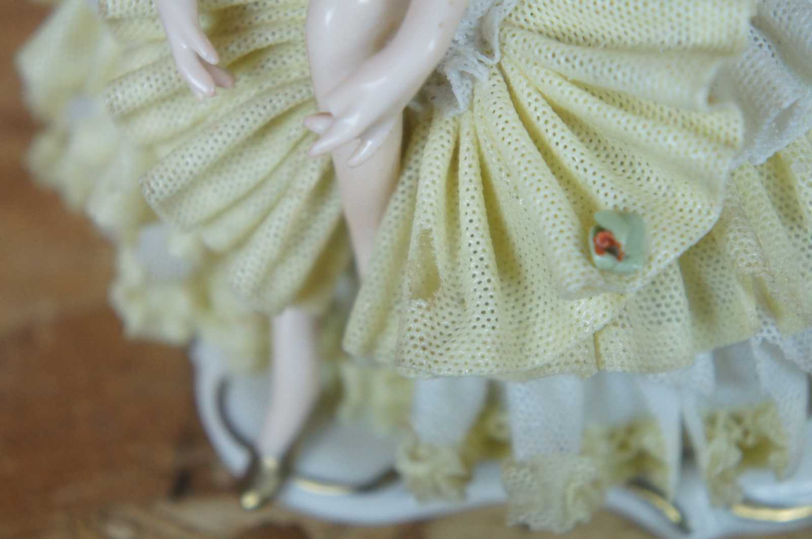 Dresden Art WR porcelain figurine featuring a young woman / ballerina wearing a ruffled yellow dress. 4.