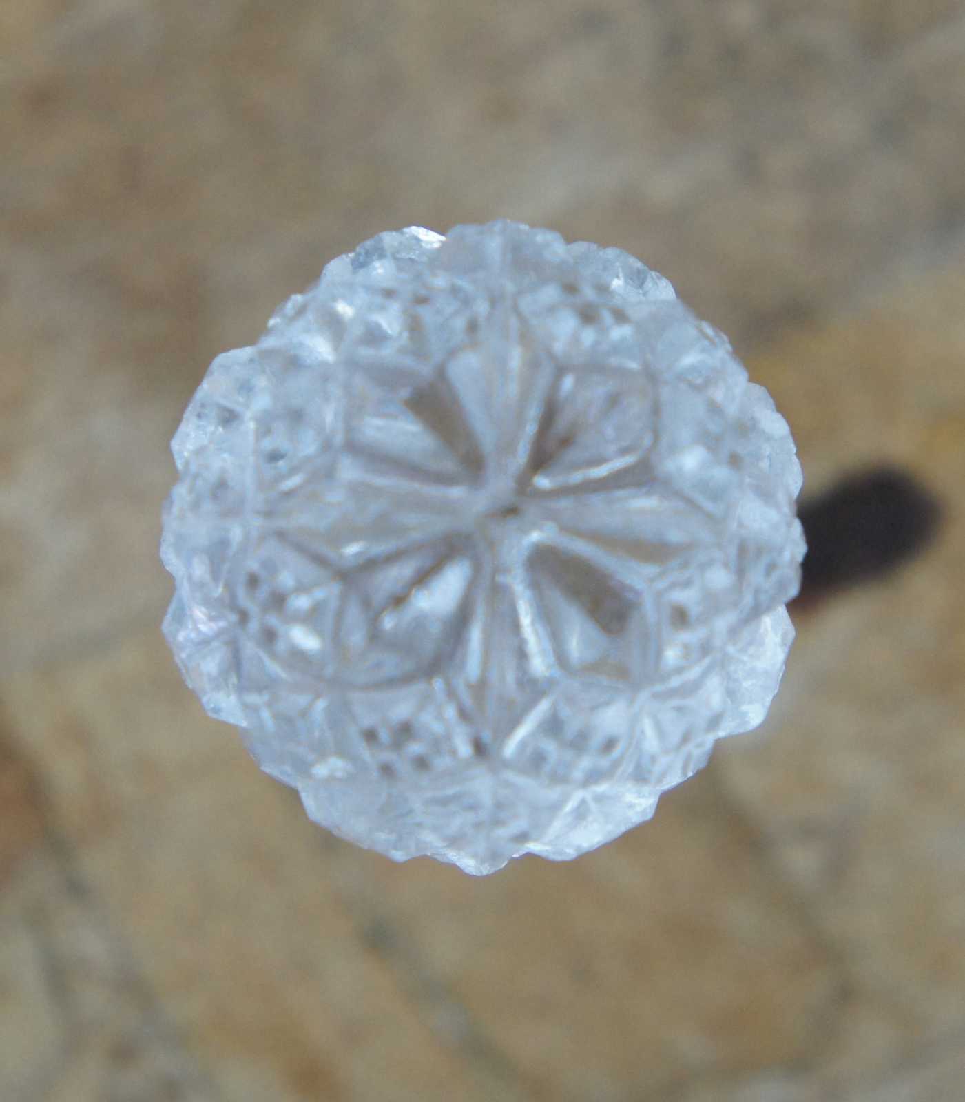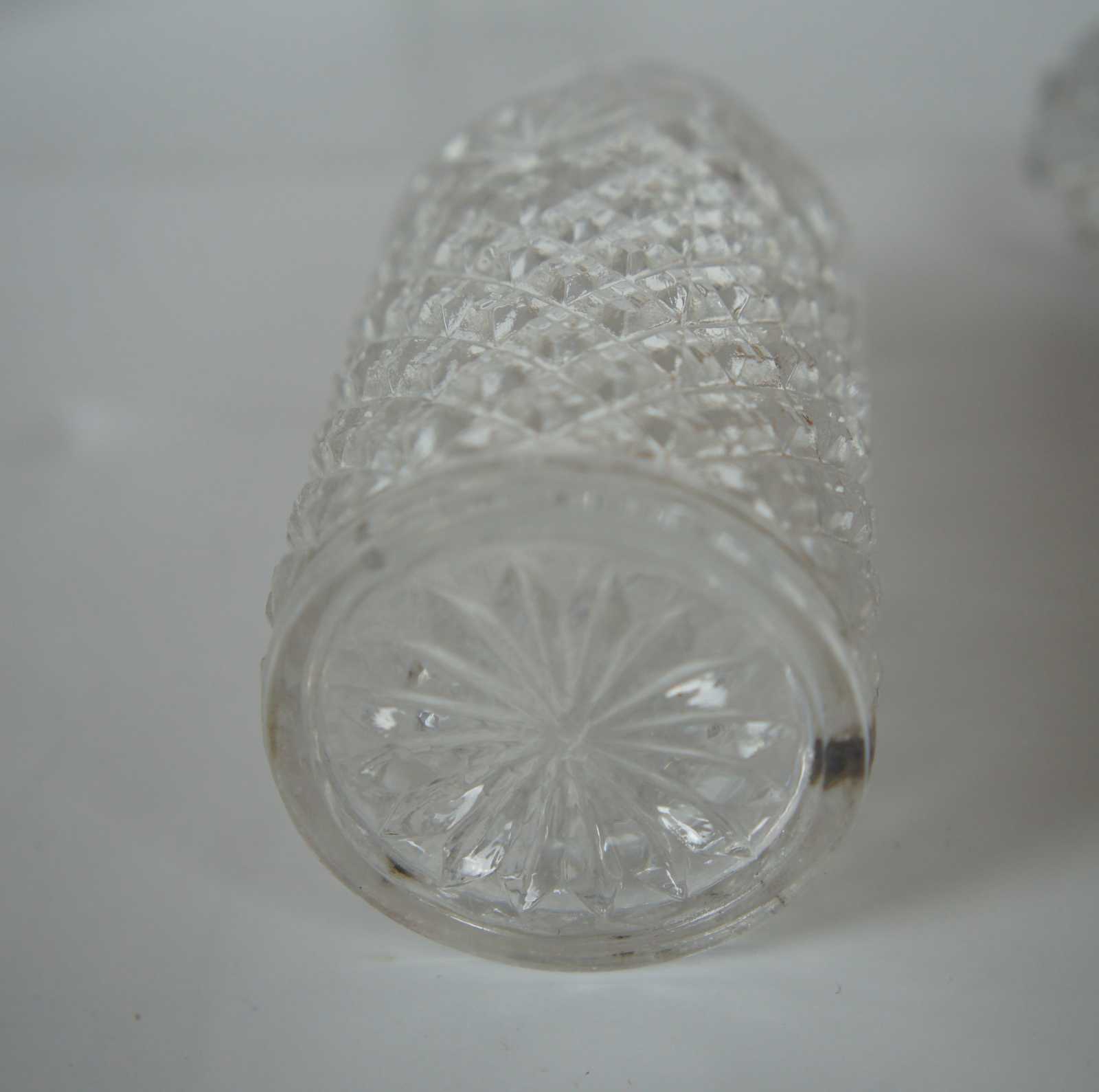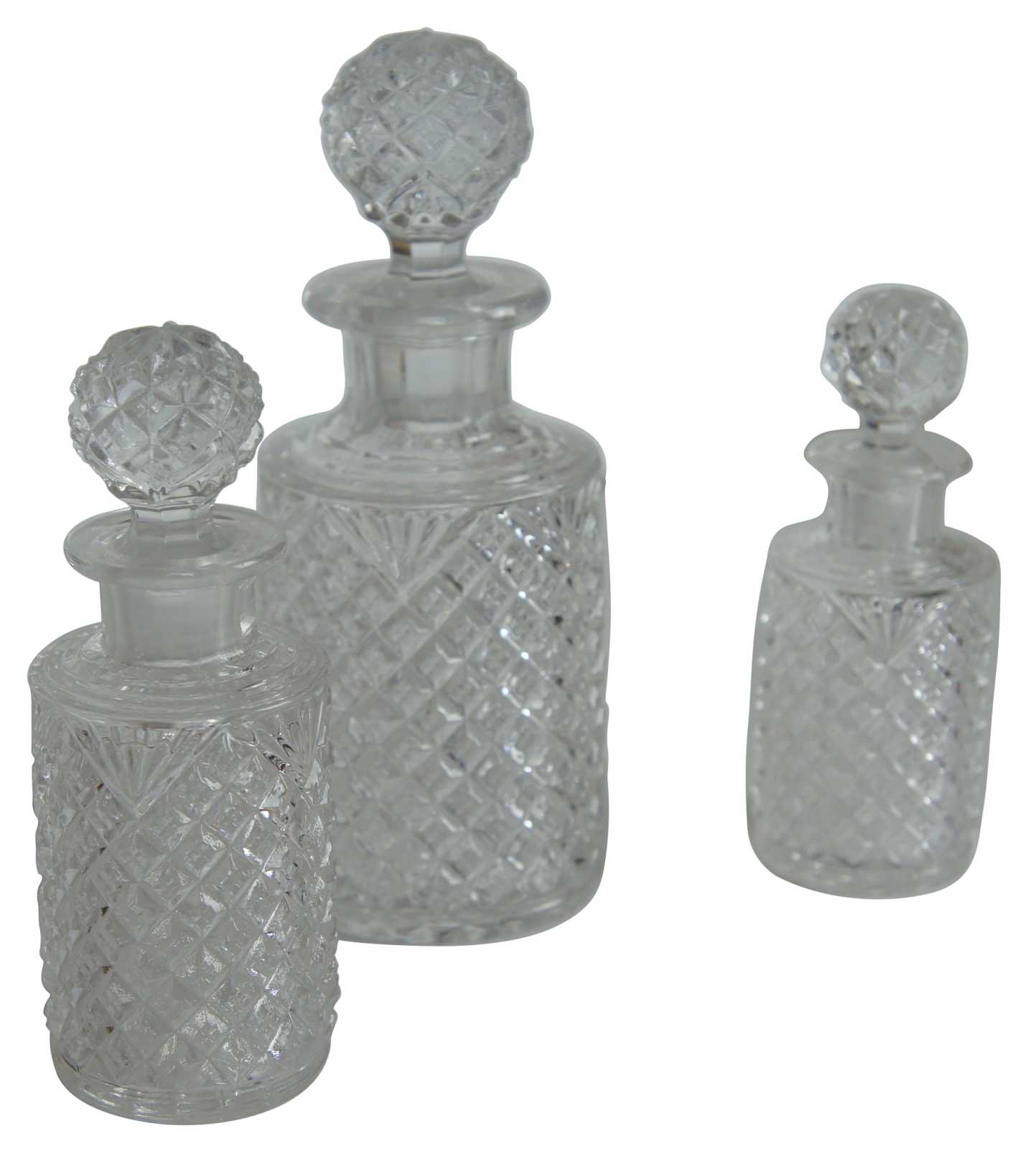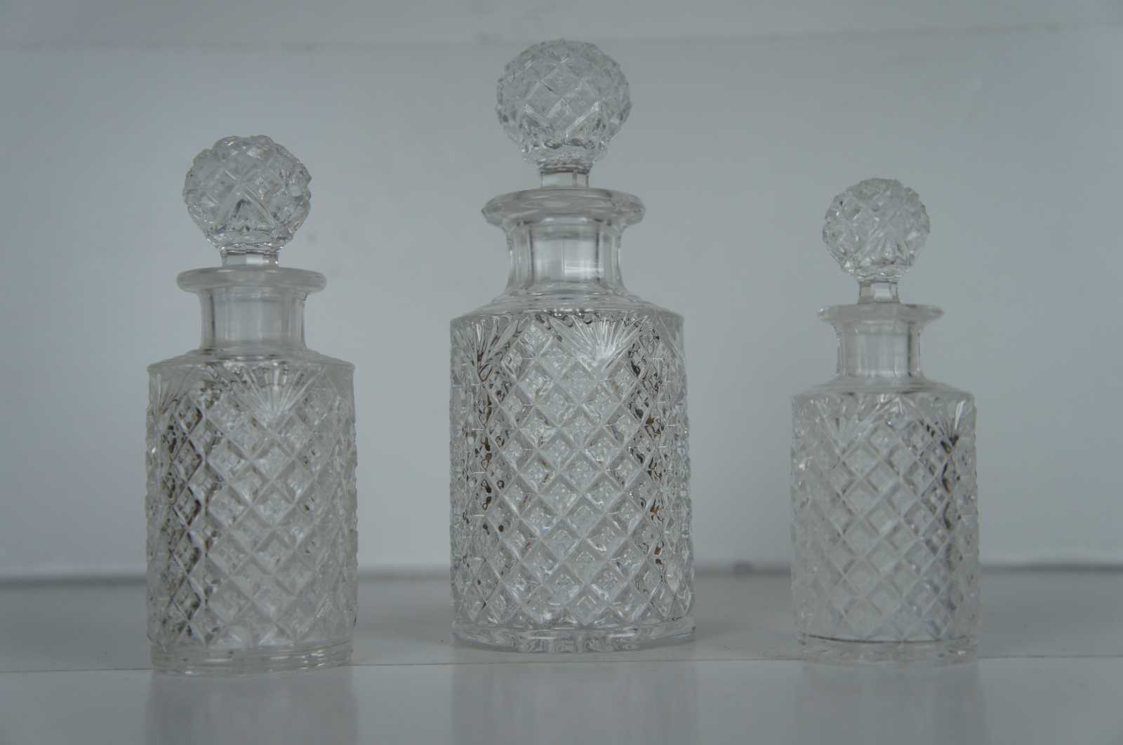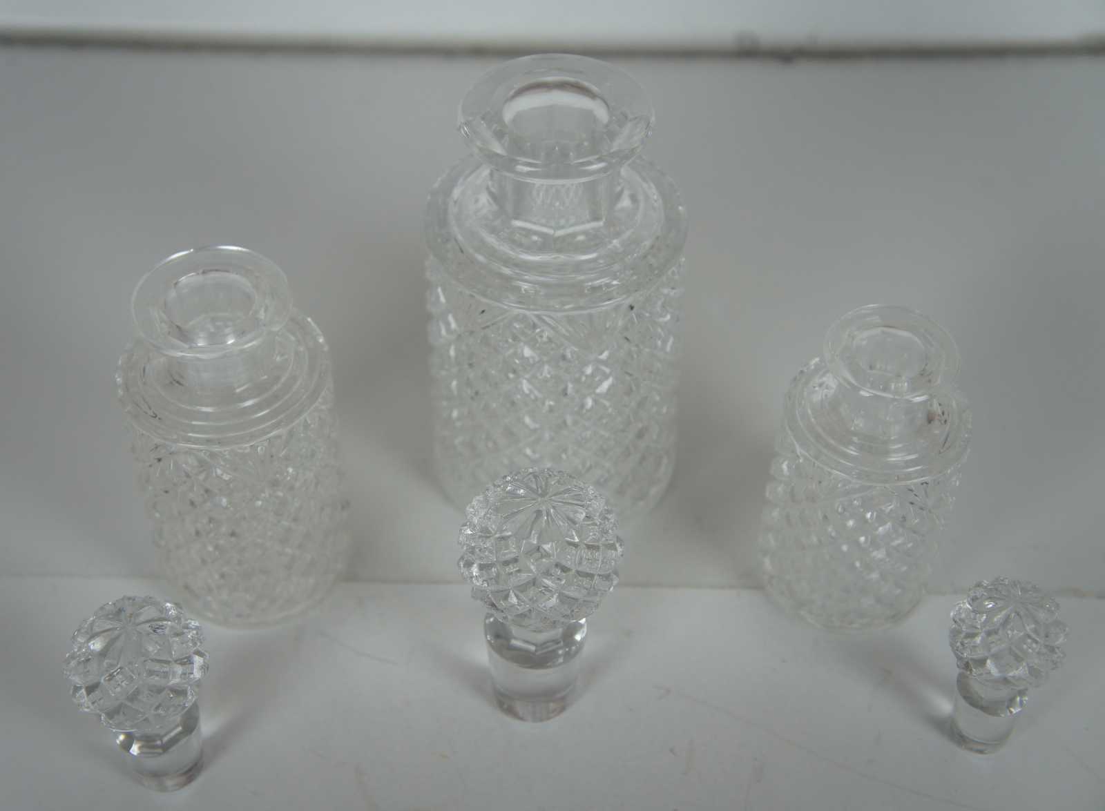 Three tiered antique pressed glass apothecary bottle jar decanters w stoppers featuring round form and diamond cut pattern.