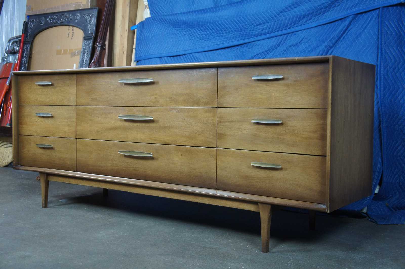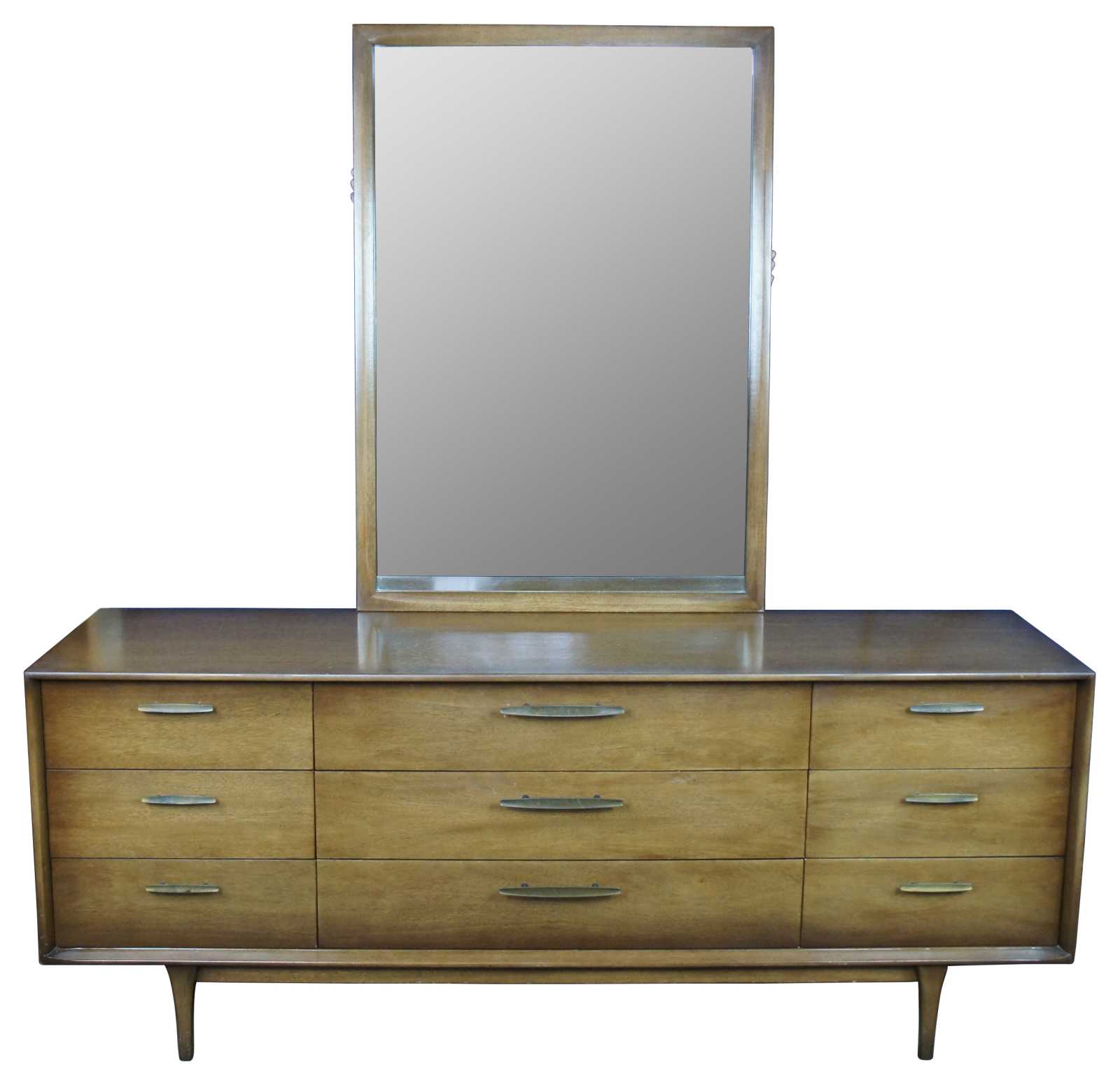 Mid century modern mirrored dresser. Made of walnut featuring rectangular form with nine drawers supported by tapered legs.
