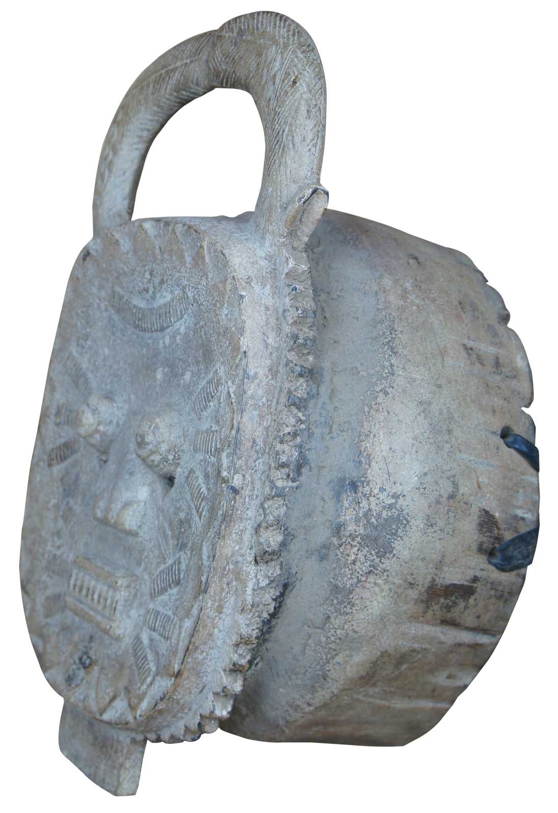 Rare antique museum quality Baule Kple Kple mask featuring an abstract circular face with animal horns. It is said that the face represents the sun and the horns represent power and strength of the buffalo. This mask was worn by junior males during religious tribal events.