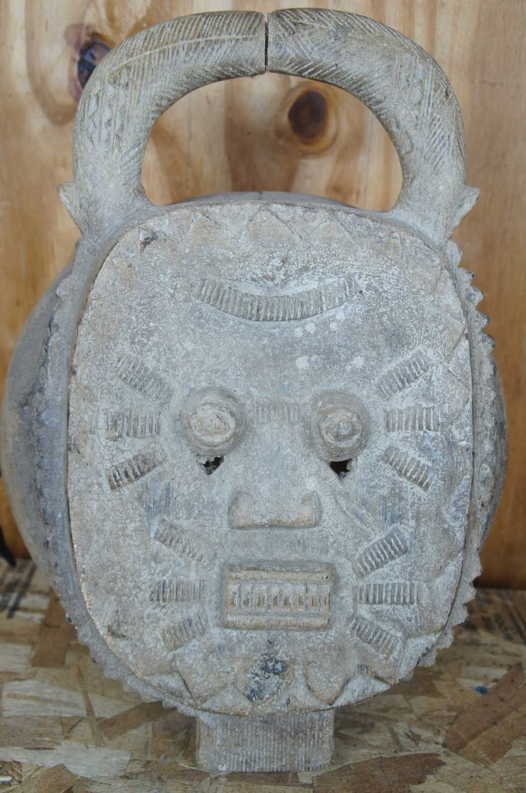The goli kplekple (aslso spelled Kpele Kpele) mask is one of several that appear in the Goli spirit dance. It represents a minor spirit associated with the junior rank of male dancers who perform before the more important masks appear. In keeping with its low status, this mask is made in a simple disk-shaped design and lacks the more complex form and ornamentation that the Baule admire in their important masks. Considered a mischievous mask, the youthful dancer playfully chases young women around the village, goaded by their songs.
