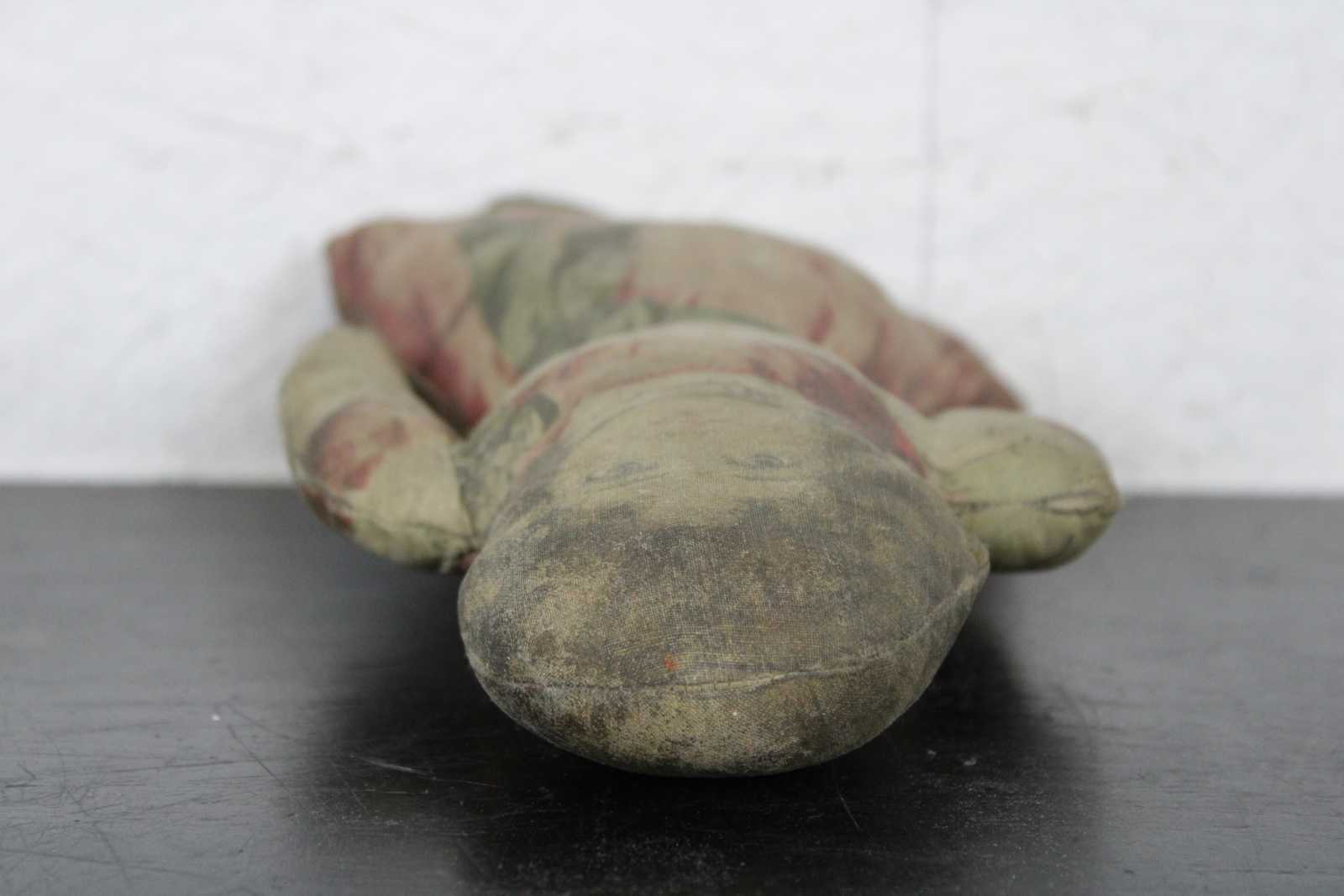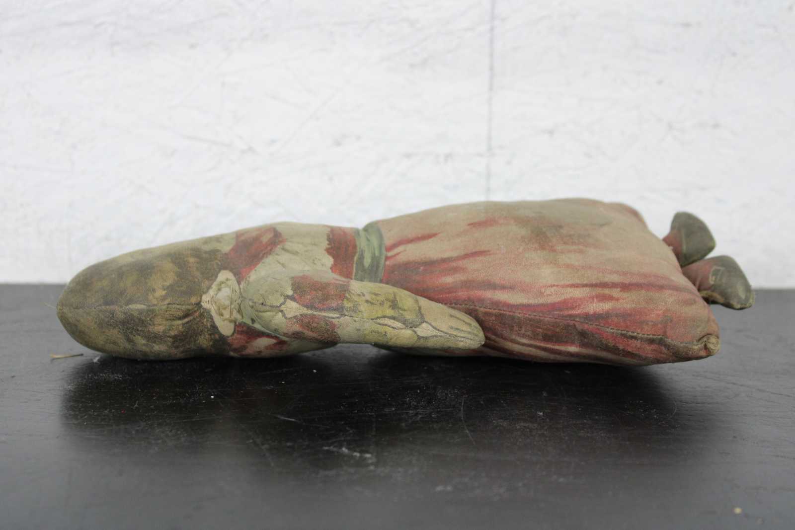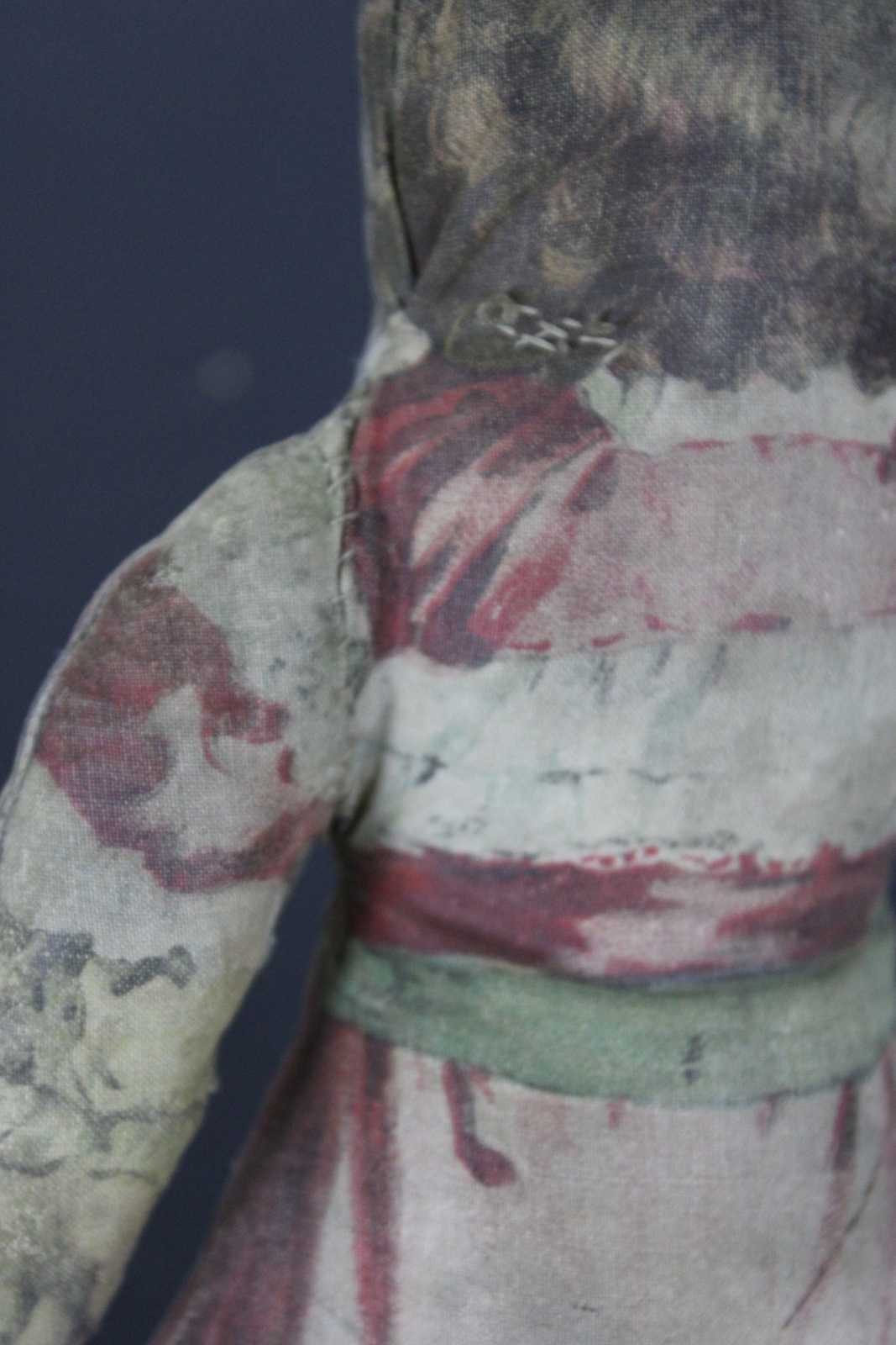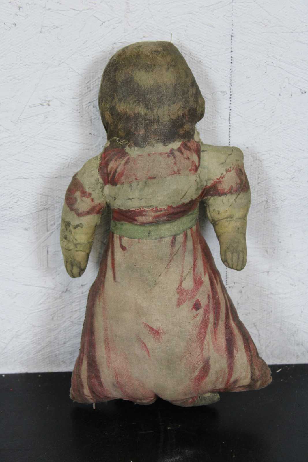 Antique Arnold Print Works lithograph printed stuffed doll or pillow in a pink Victorian dress with green ribbon.