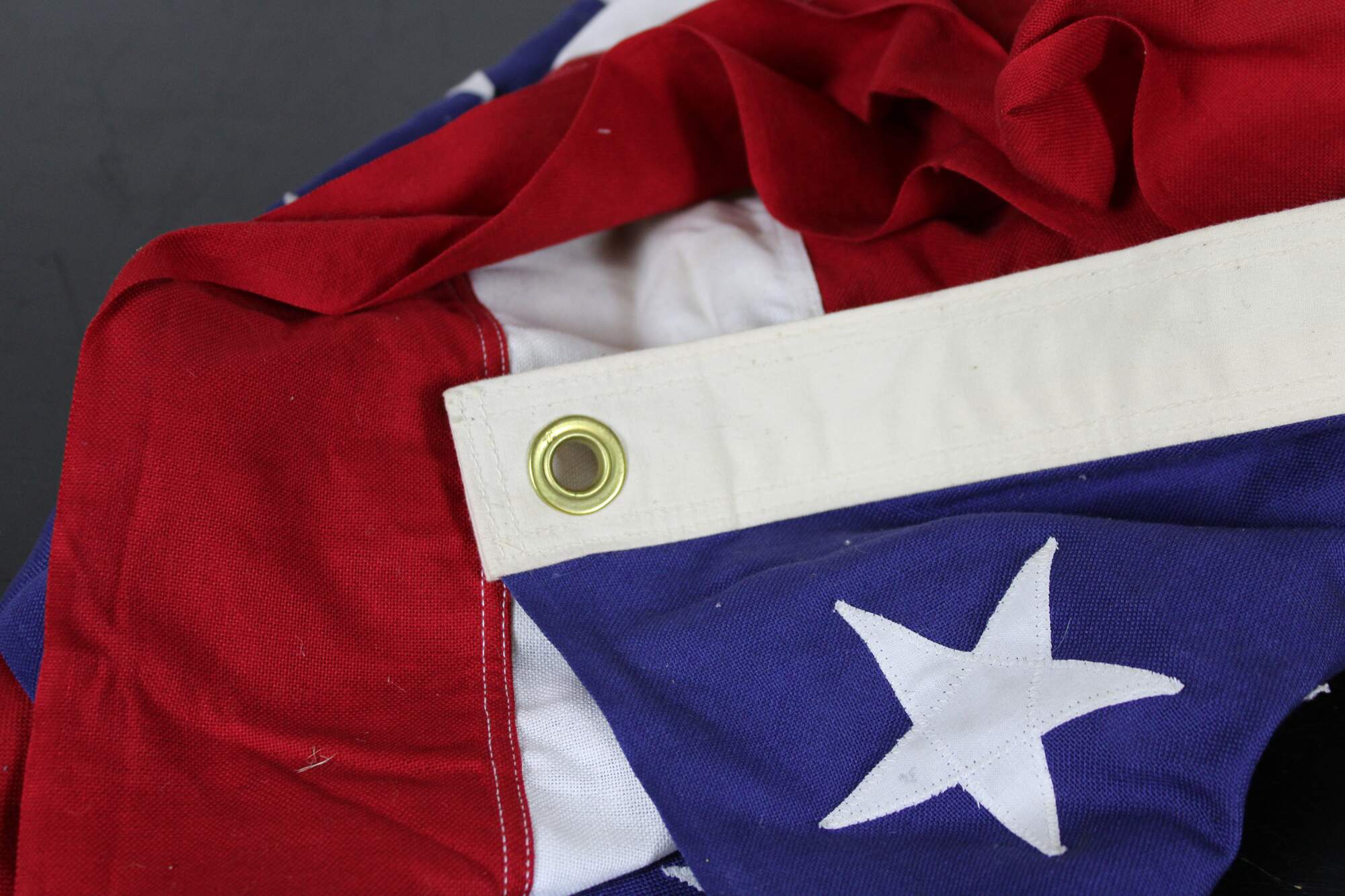 Vintage fifty star United States of America flag made of 100% cotton-bunting by the Valley Forge Flag Company. Stars are stitched applique shapes, not embroidered.