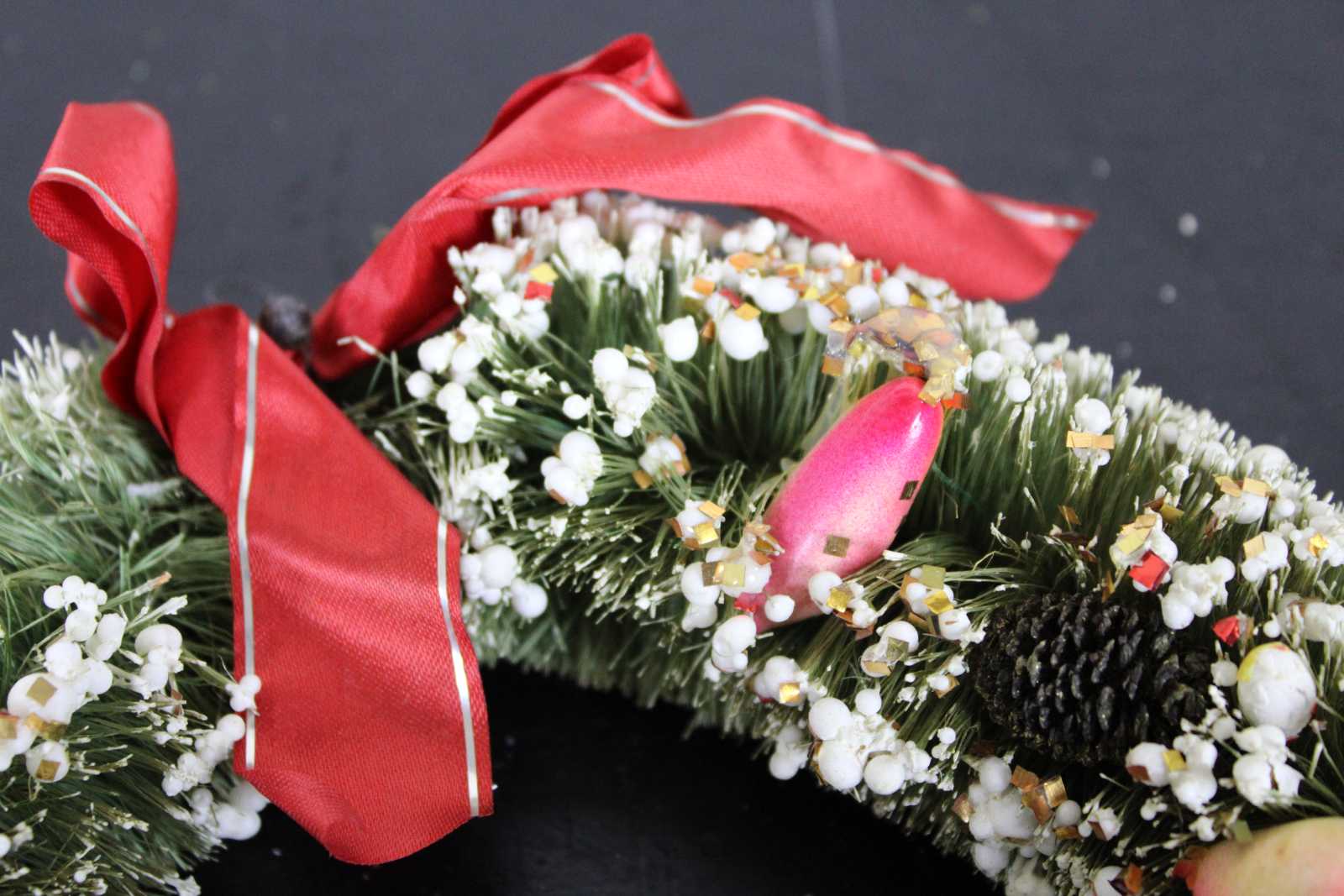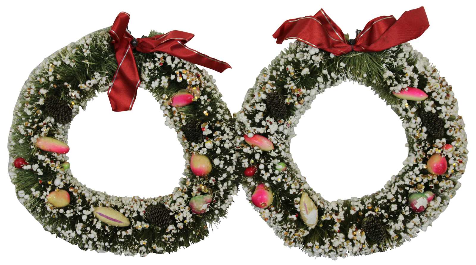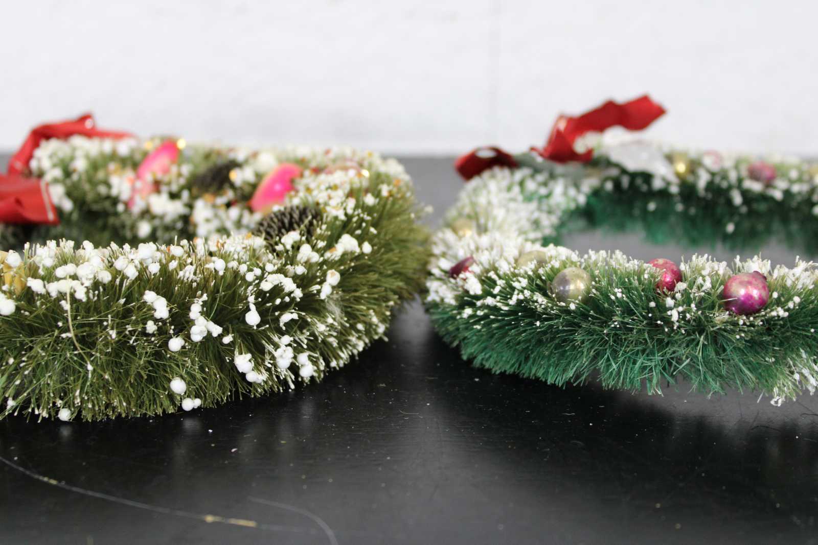 Set of four vintage folk art bottle brush Christmas wreaths with snow and bows; two decorated with fruit, and two with mercury glass ornaments.