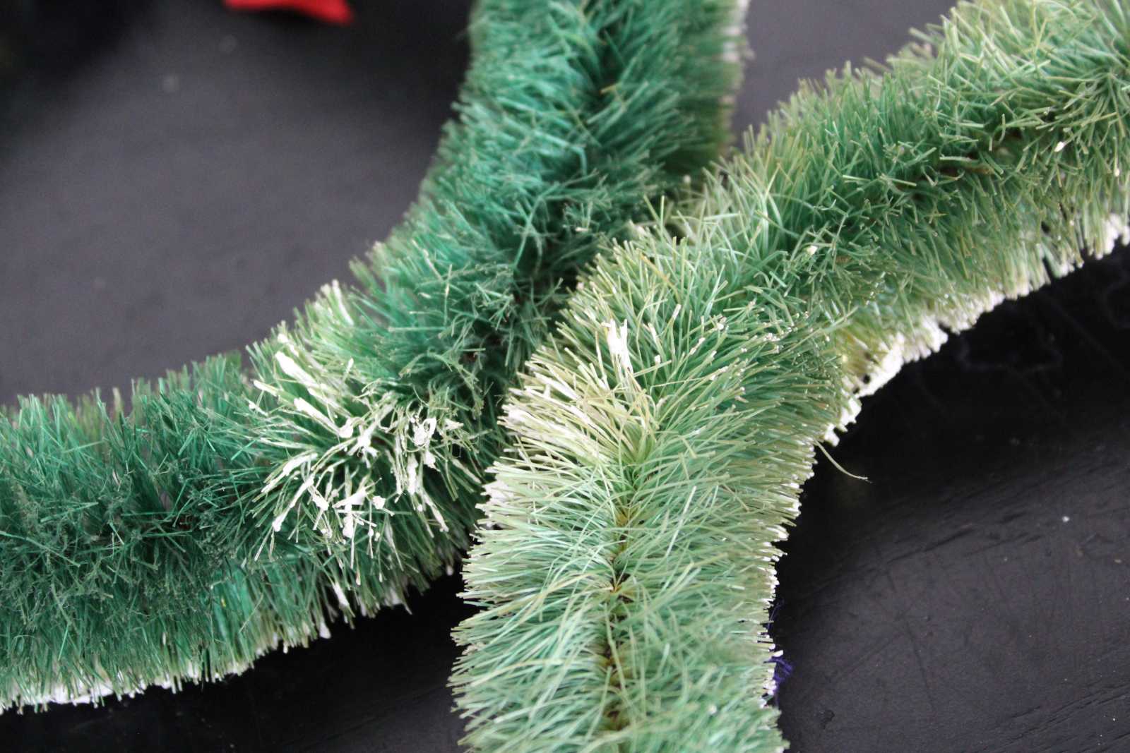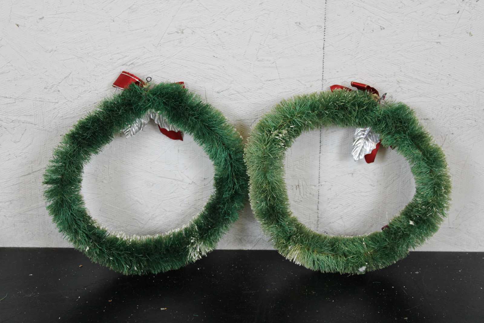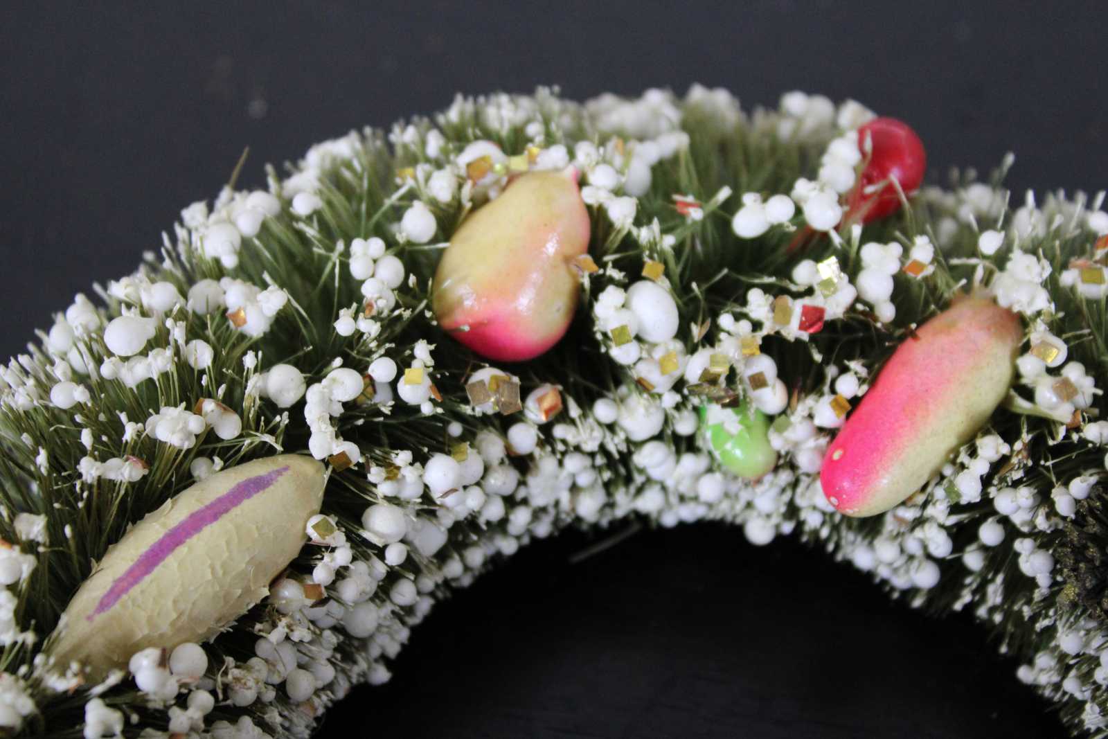 Set of four vintage folk art bottle brush Christmas wreaths with snow and bows; two decorated with fruit, and two with mercury glass ornaments.