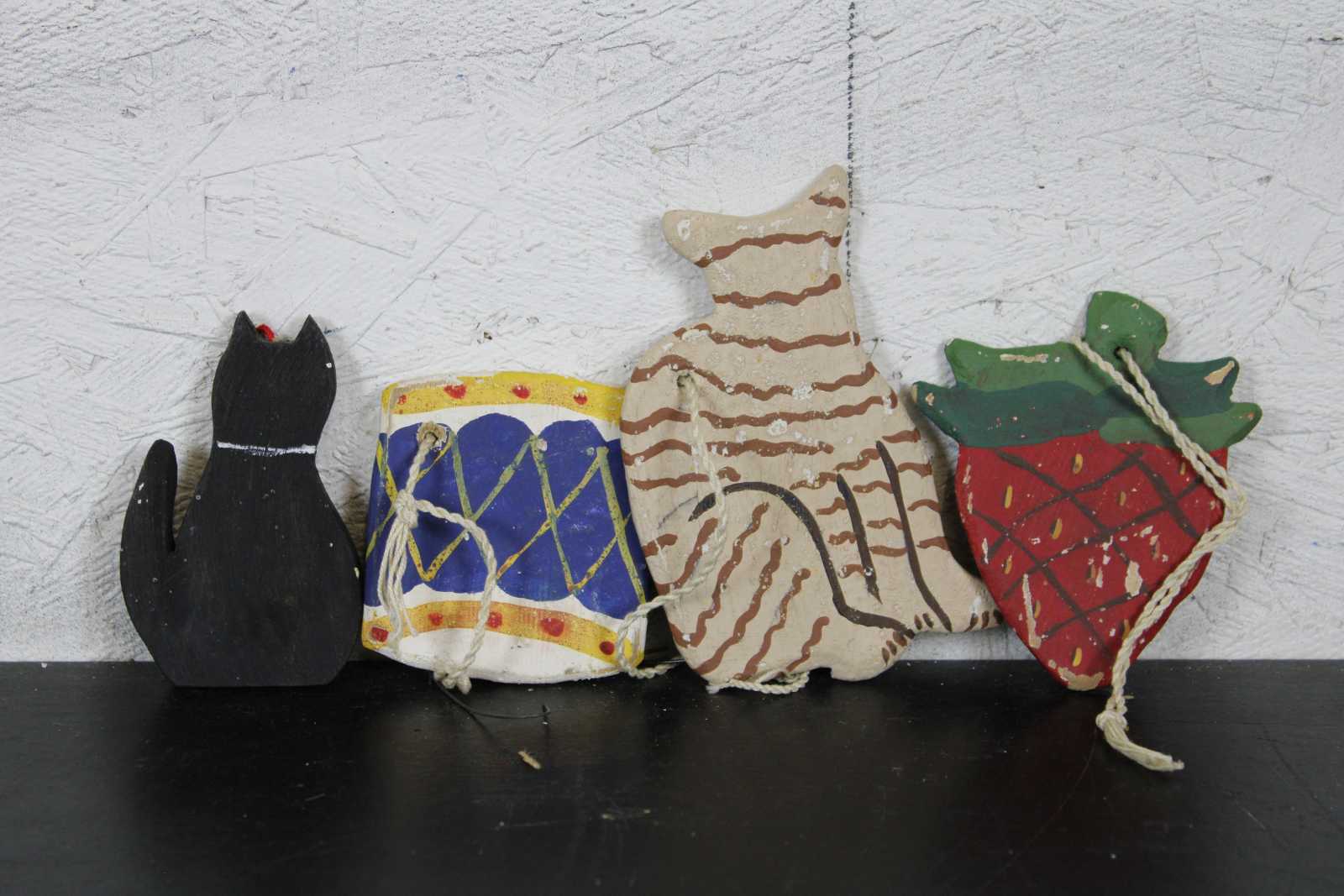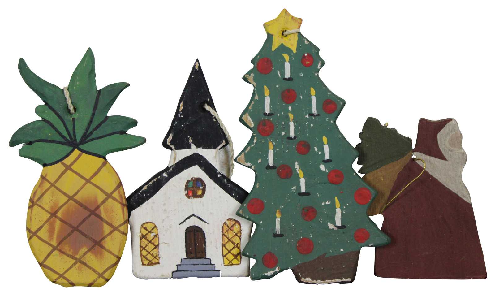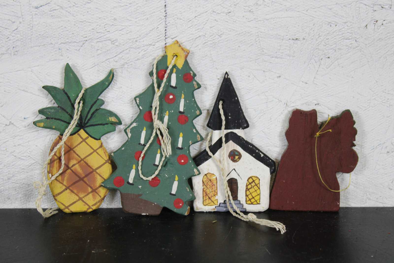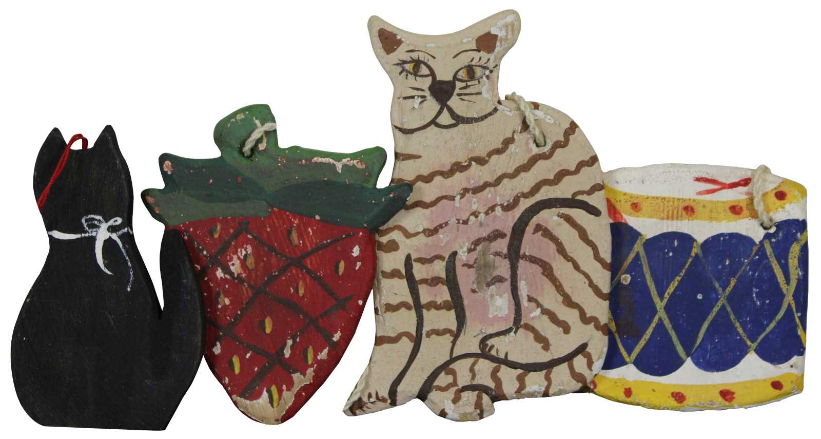 Set of 8 vintage, antique inspired wooden folk art ornaments by Olde Tavern Woodworks Grandma's Attic collection. Featuring a christmas tree, a pineapple, two cats, a strawberry, a drum, a santa claus w presents, a church steeple and cloth sack.