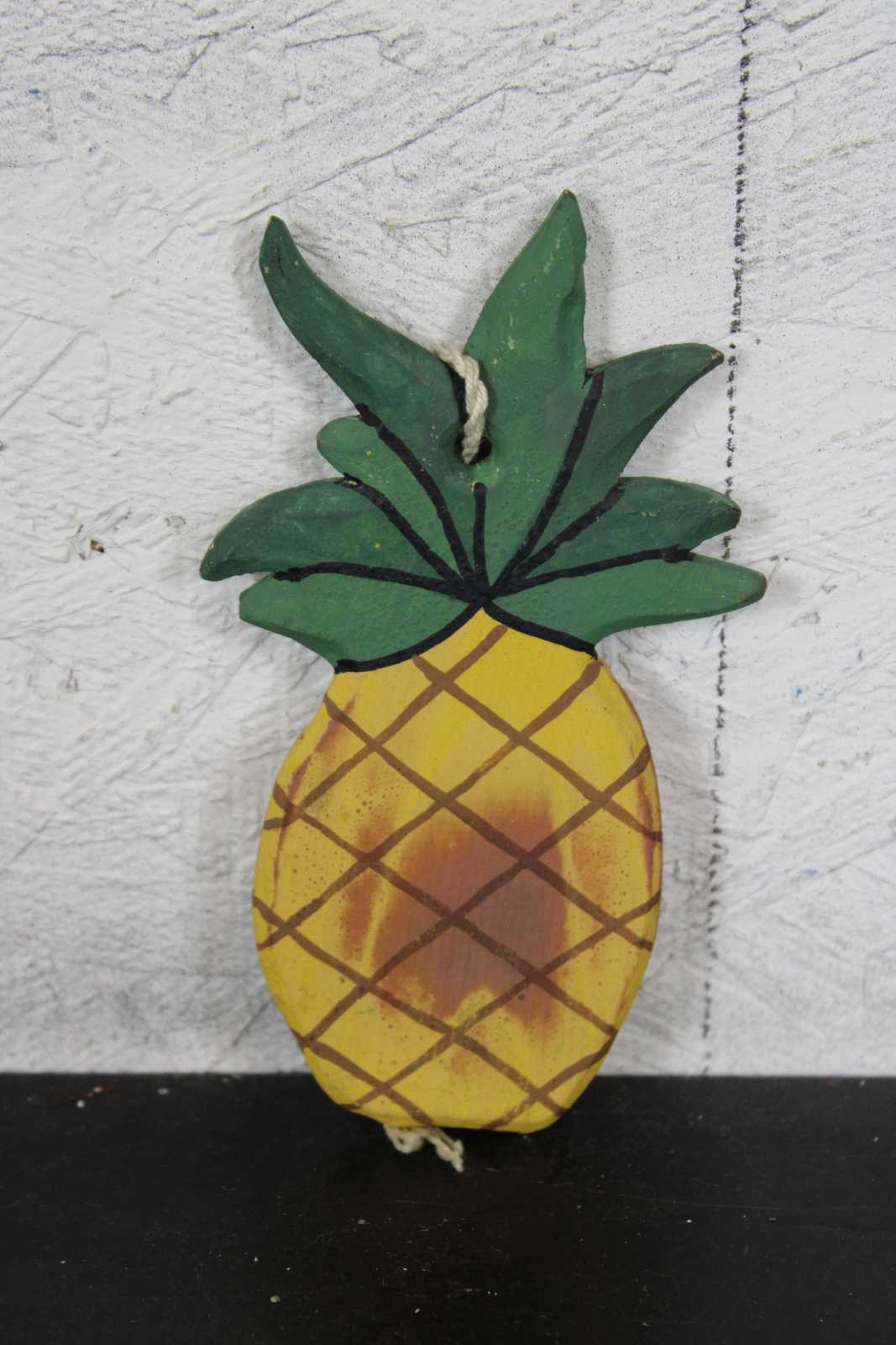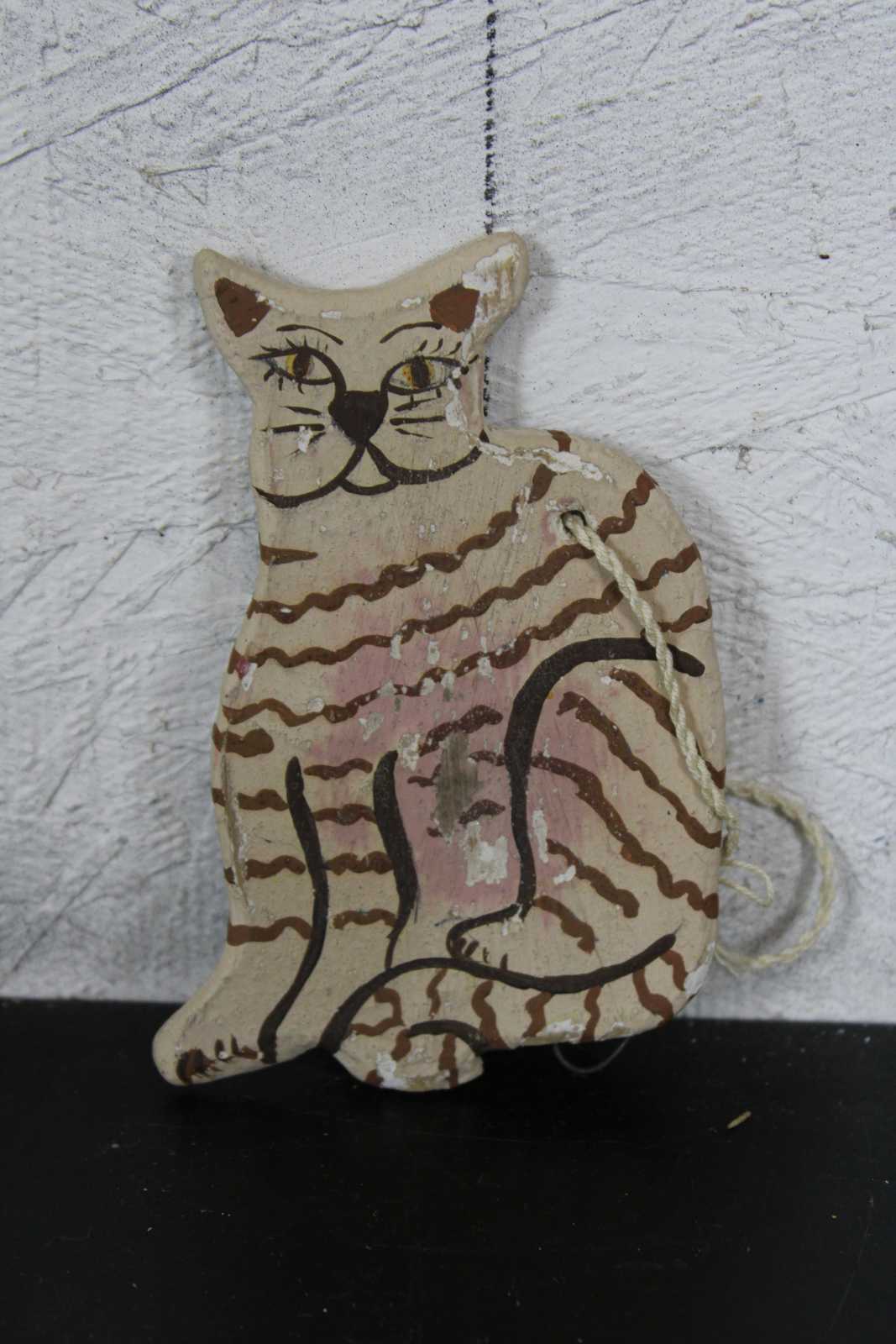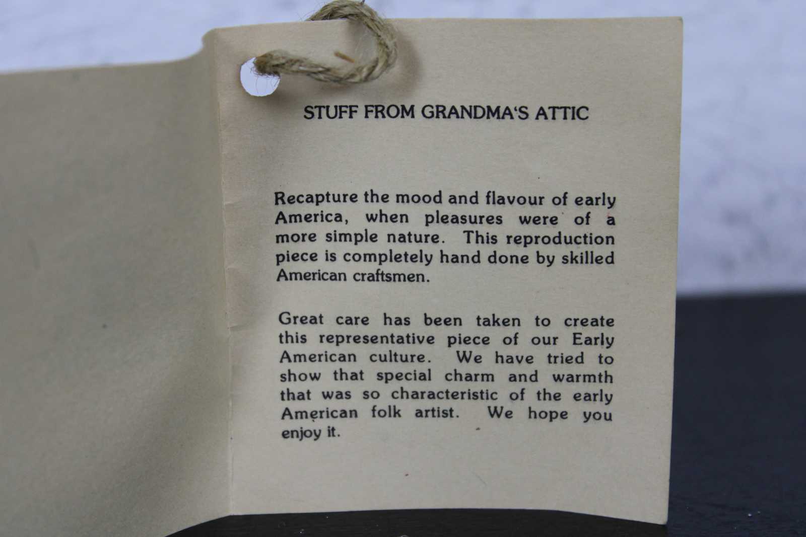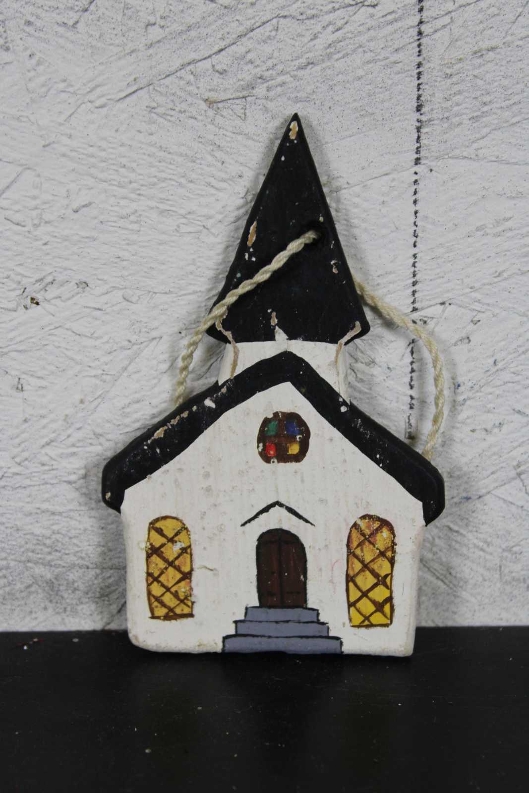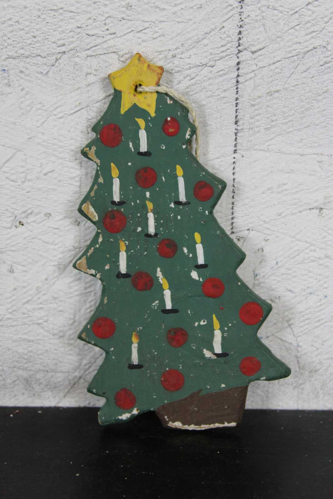Set of 8 vintage, antique inspired wooden folk art ornaments by Olde Tavern Woodworks Grandma's Attic collection. Featuring a christmas tree, a pineapple, two cats, a strawberry, a drum, a santa claus w presents, a church steeple and cloth sack.