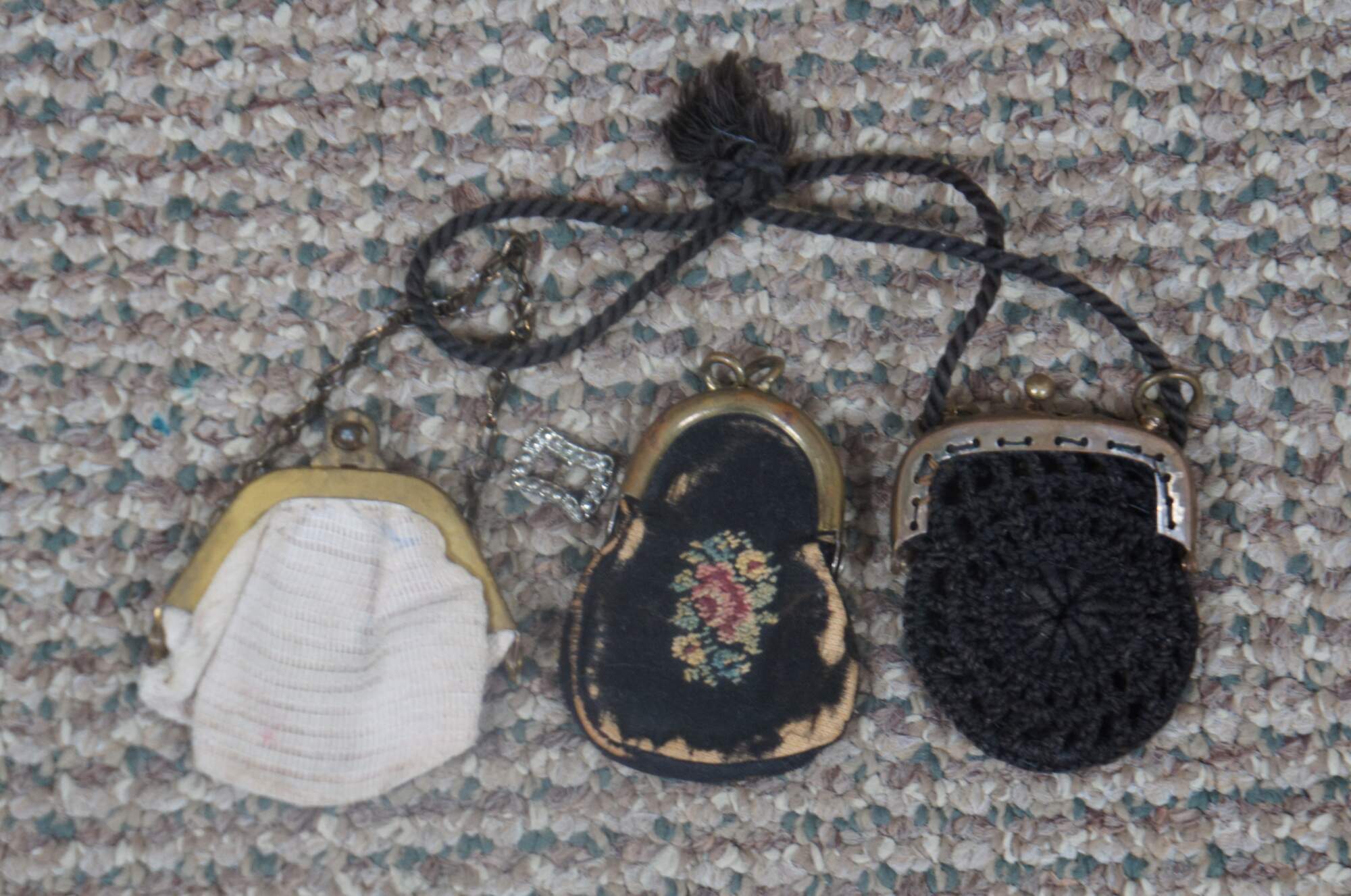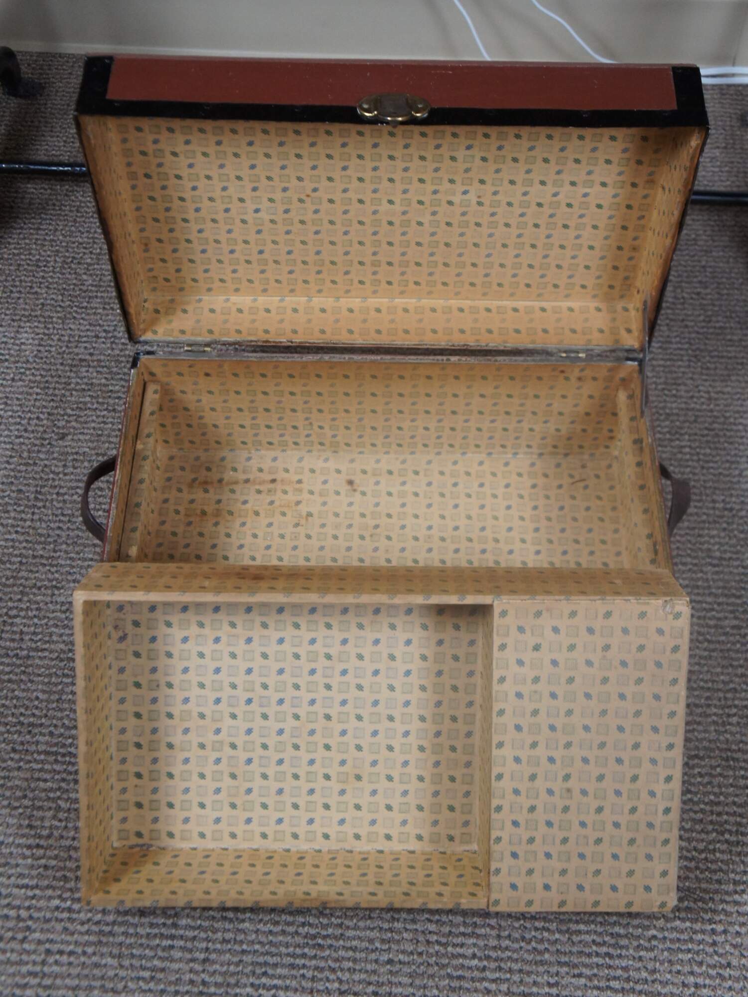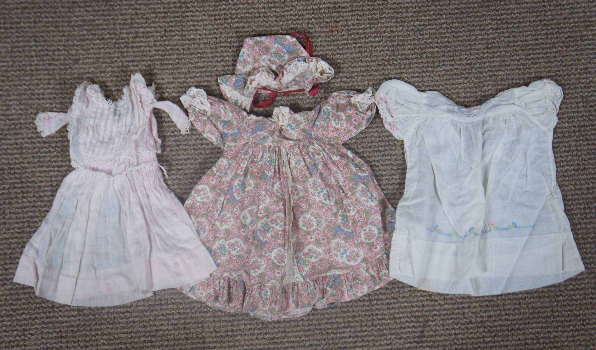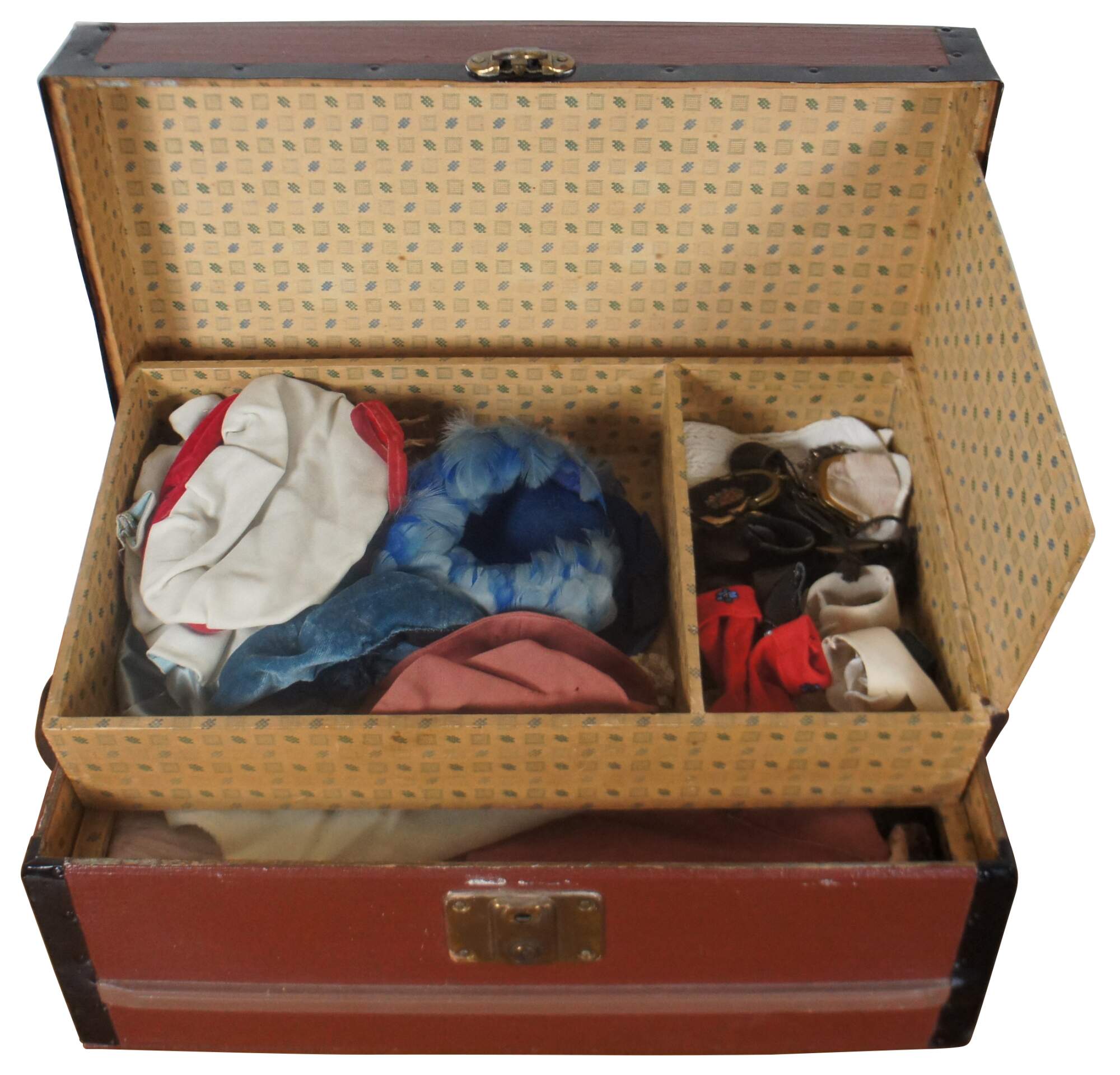 Lot of antique doll clothing and accessories including 2 blankets, 1 pillowcase, crochet bib, finger puppet, embroidered chiffon/ lace handkerchief, parasol, 9 white dresses/chemises/nightgowns, 4 hats, 5 pairs of shoes, 2 pairs of socks, 3 coin purse style handbags, 3 petticoats, 1 pair shorts with white shirt, 1 pair bloomers, 1 diaper, 1 matching dress and bonnet set, 1 coat and hat set, 1 cape and bonnet set, and 3 additional dresses. Stored in a salesman sample sized red steamer trunk with black bands, interior tray and lined with patterned paper. Latch is functional and opens when lock is pressed downward; no key.